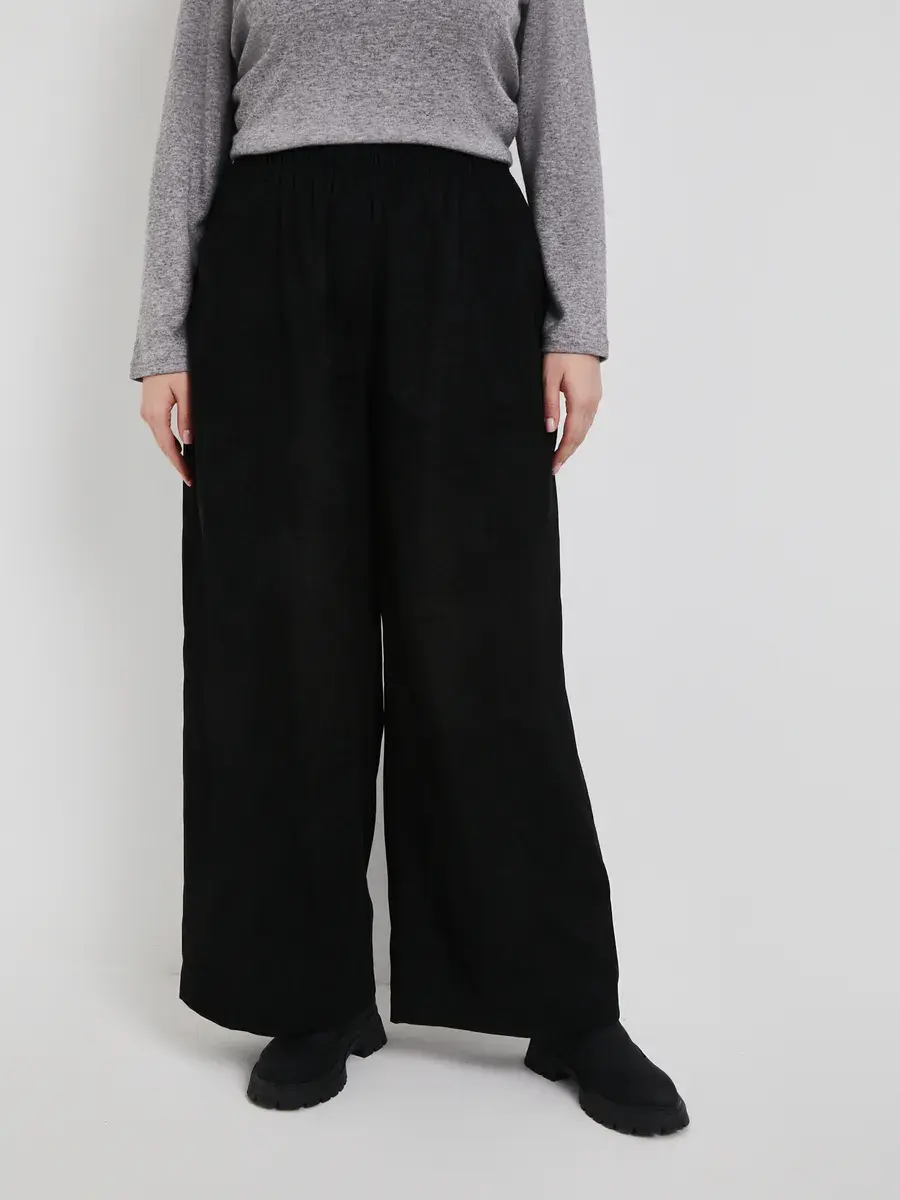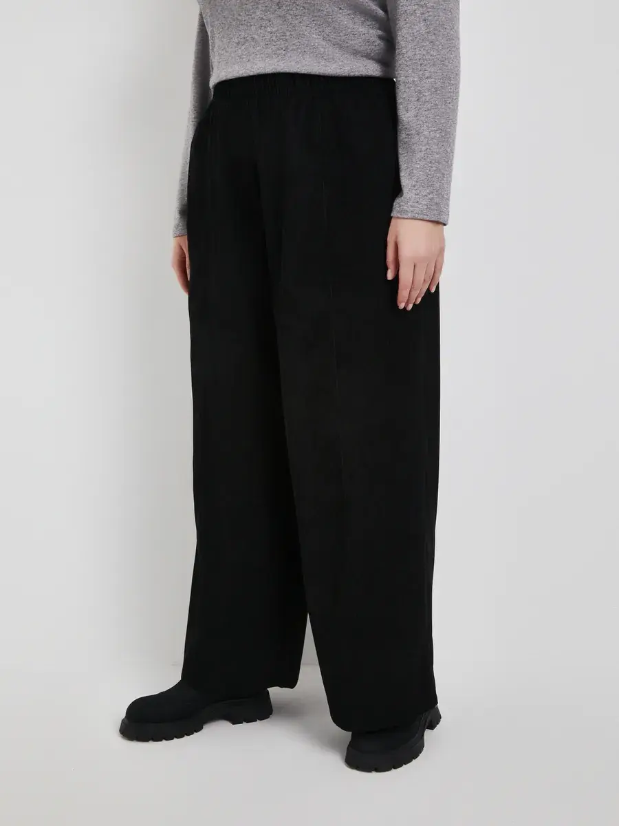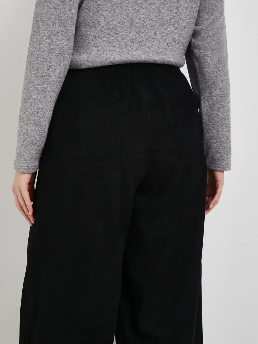 Широкие вельветовые брюки с высокой посадкой и стрелками. Выполненные из фактурного материала. Оверсайз-крой, с боковыми карманами и накладными сзади. Верхняя часть на резинке для максимального комфорта