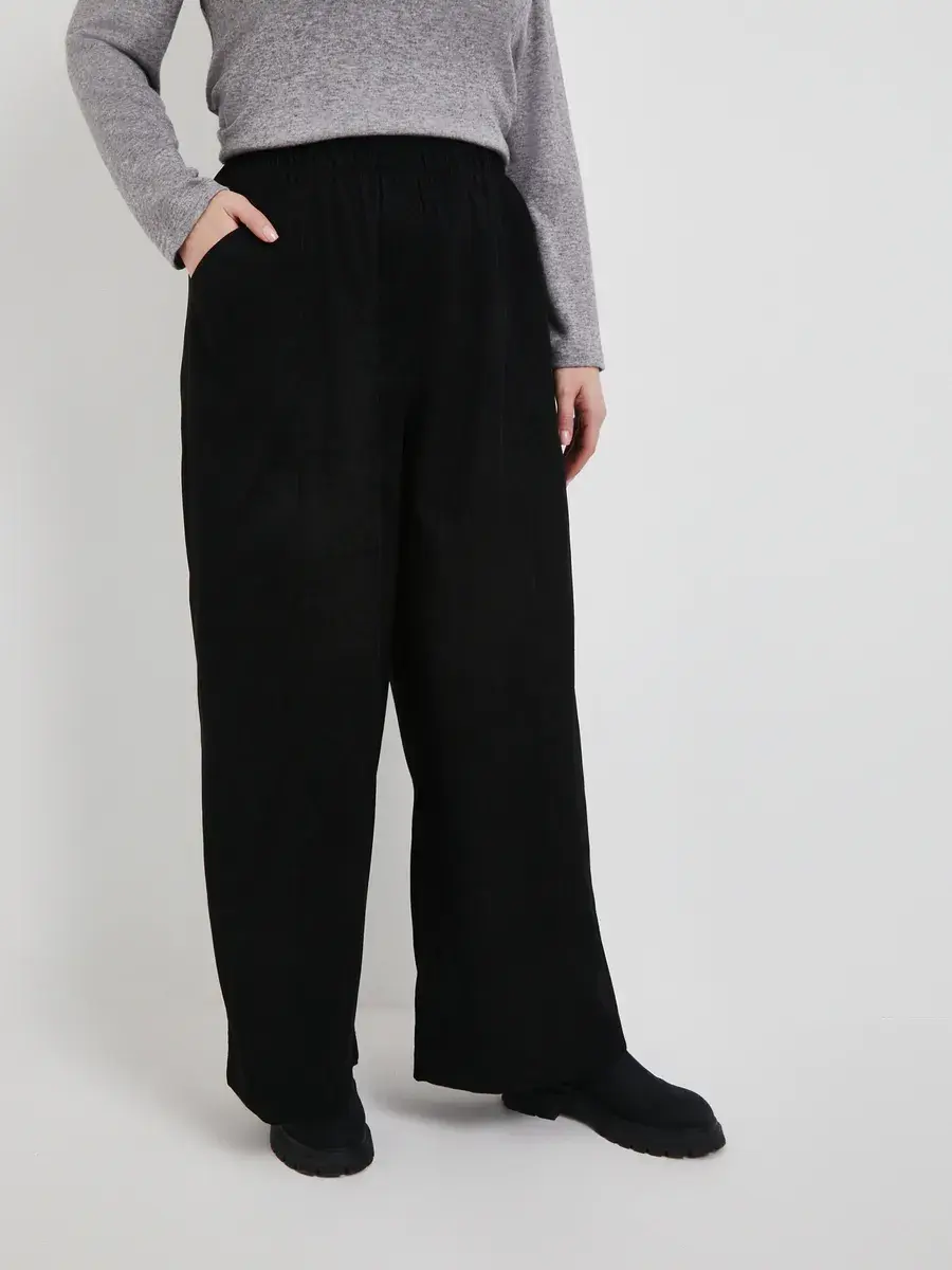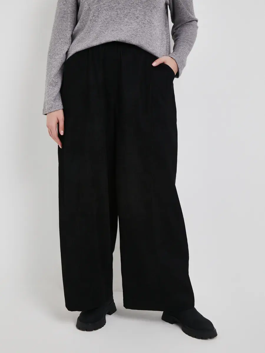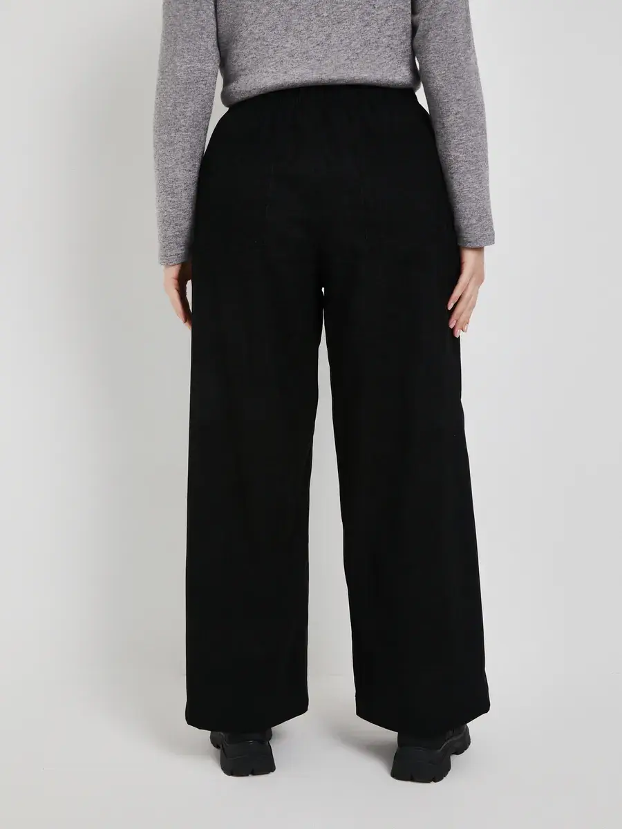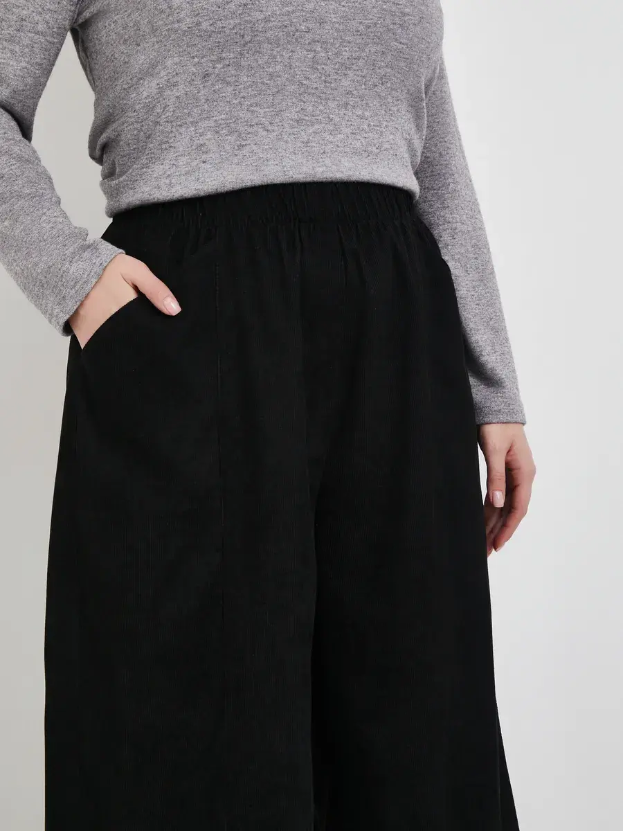 Широкие вельветовые брюки с высокой посадкой и стрелками. Выполненные из фактурного материала. Оверсайз-крой, с боковыми карманами и накладными сзади. Верхняя часть на резинке для максимального комфорта