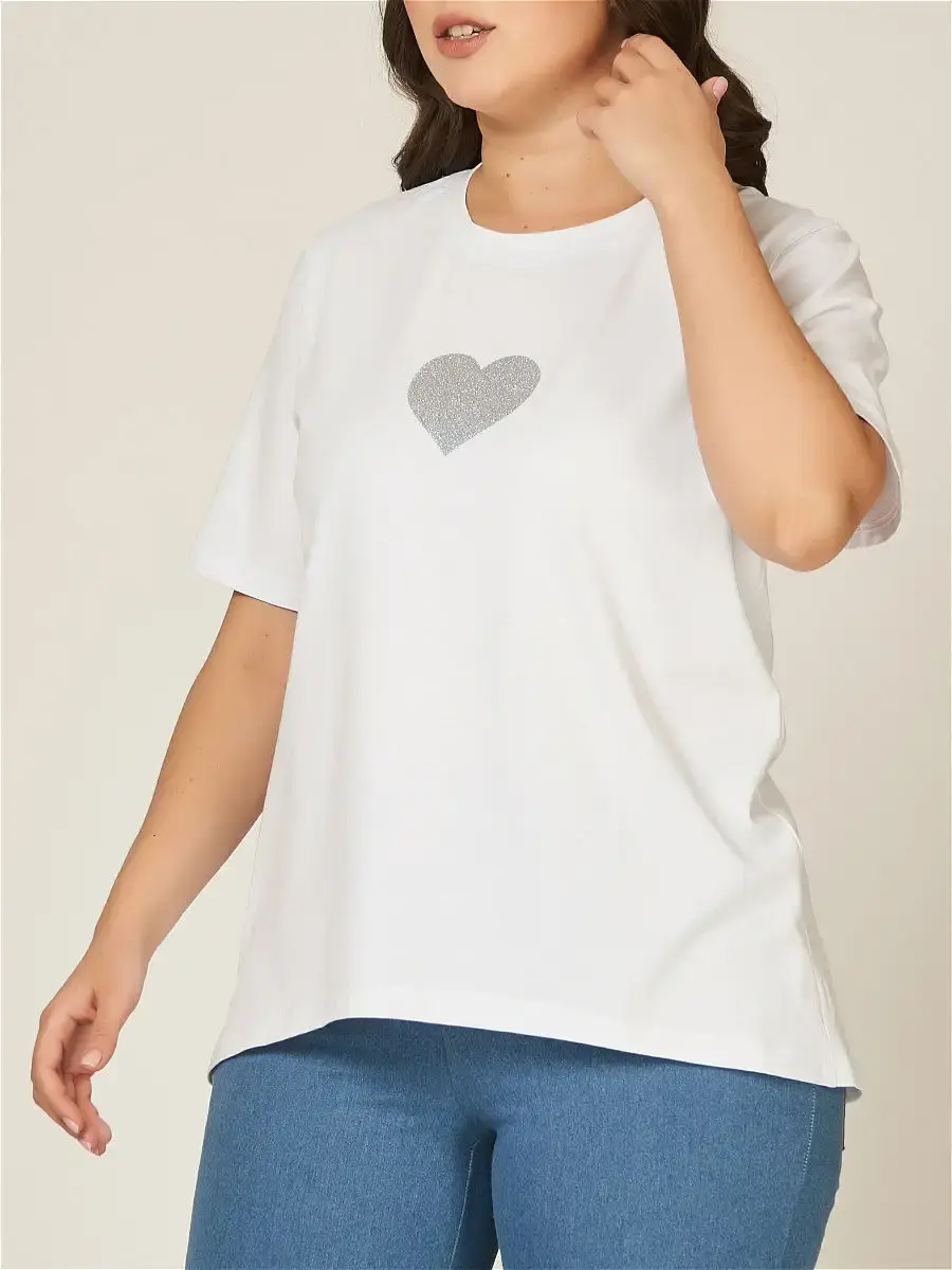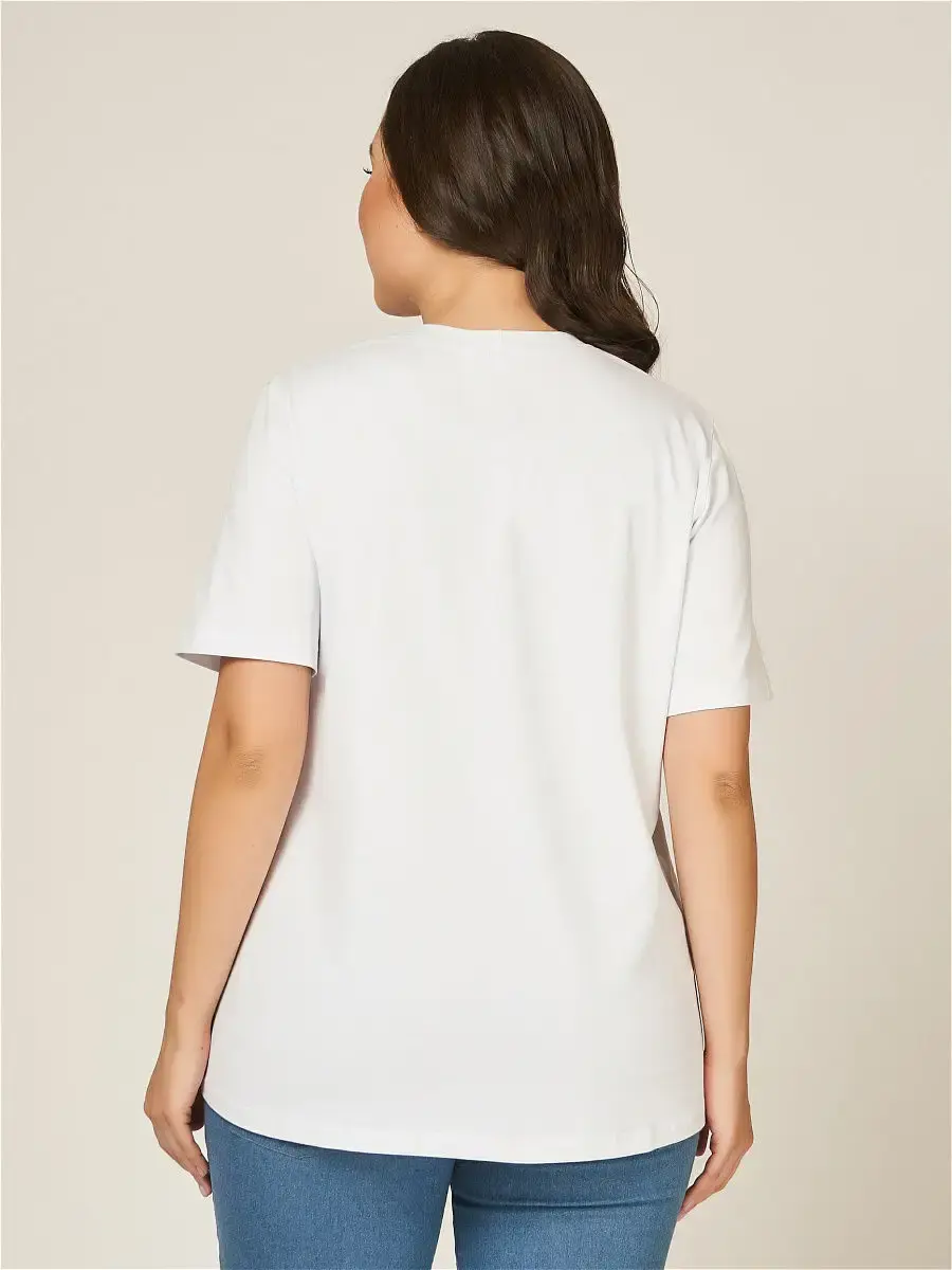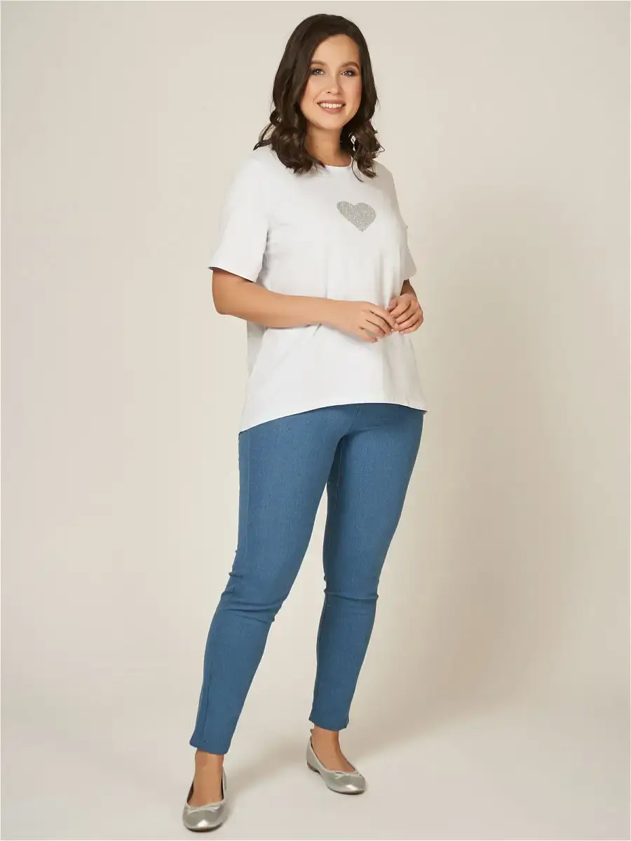 Повседневная блузка-футболка с аппликацией на груди из хлопковой дышащей ткани, небольшое содержание эластана, которое помогает держать форму даже после многочисленных стирок. Спортивный крой придает силуэту подтянутость и спортивность, а сверкающий декор позволяет чувствовать себя нарядной. Футболка женская а силуэта, футболка большие размеры, футболка хлопок удлиненная, футболка белая