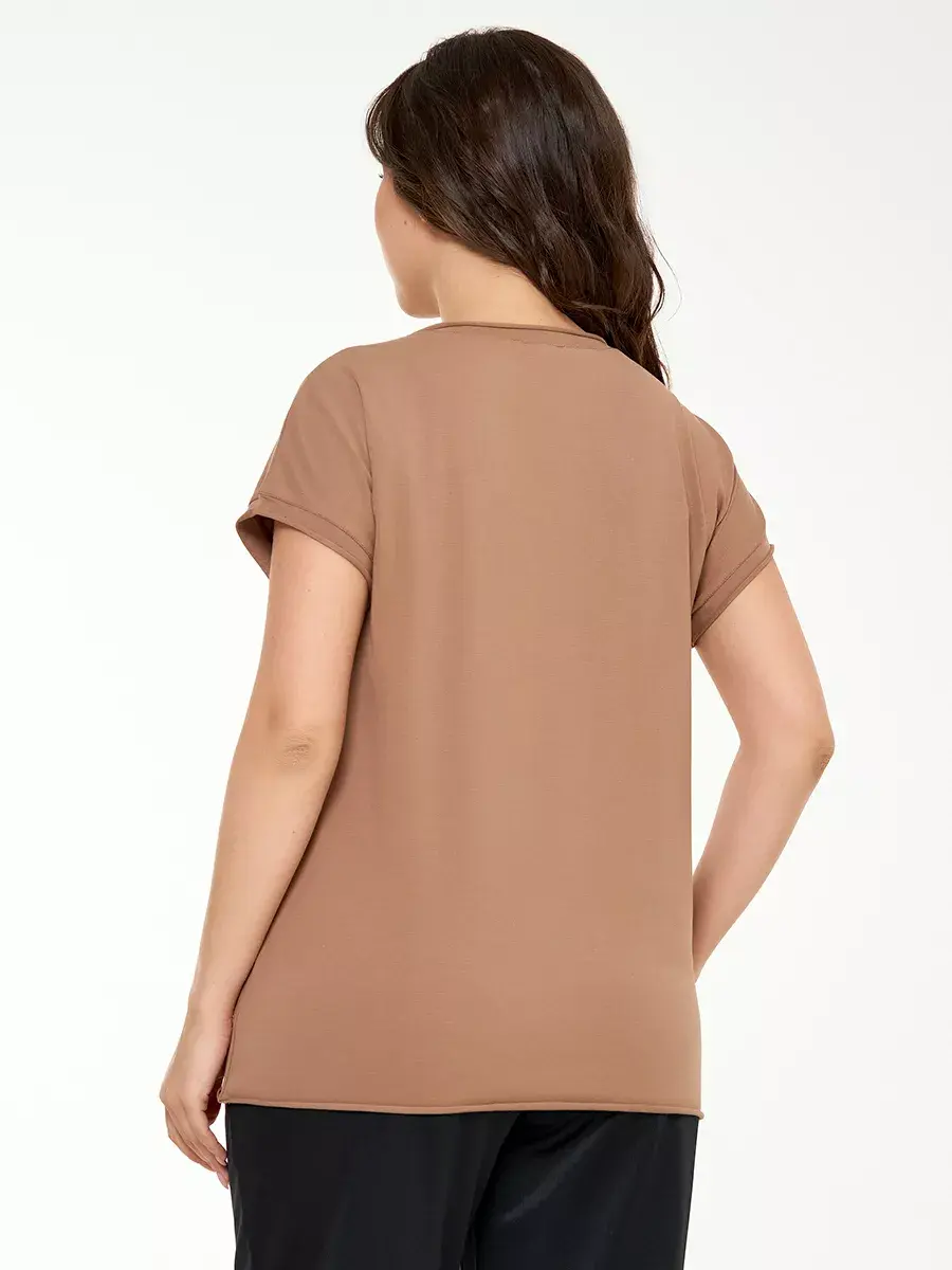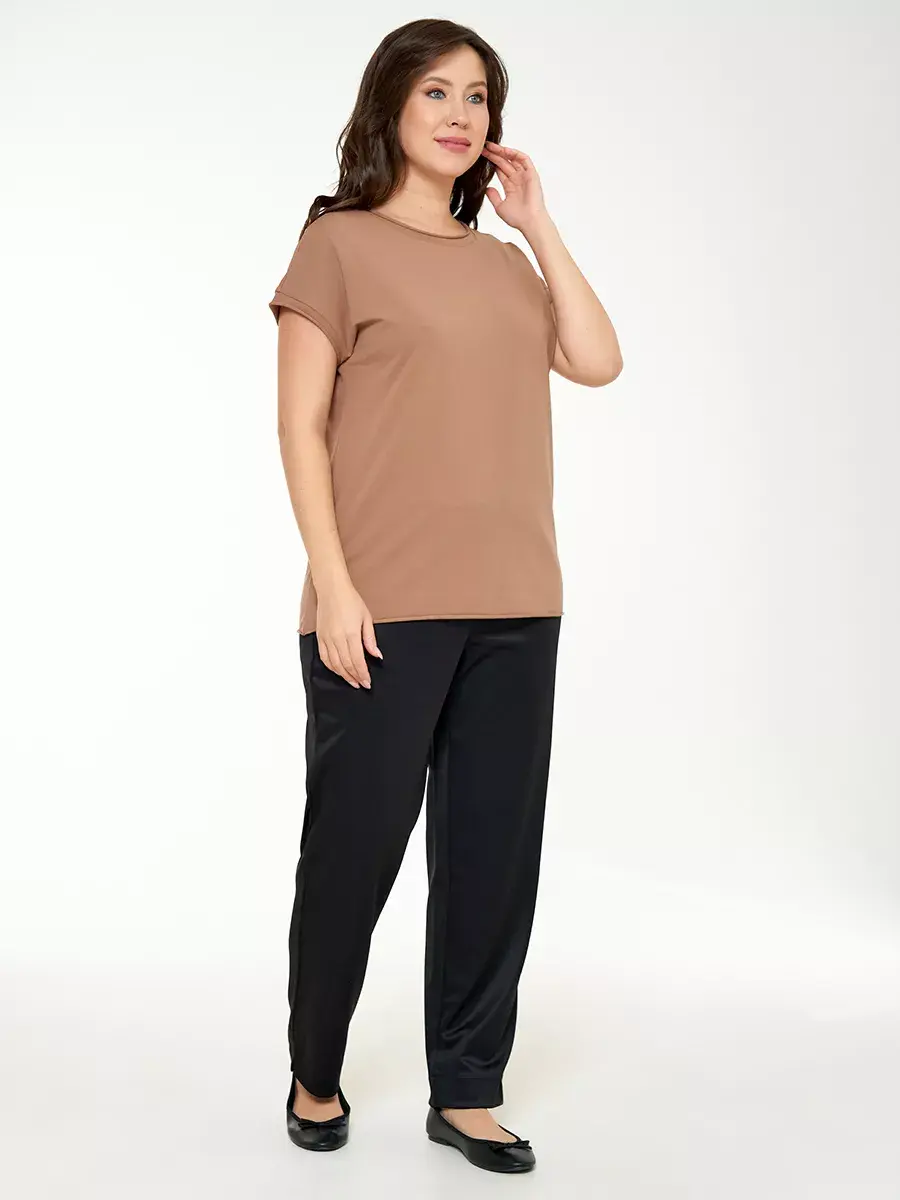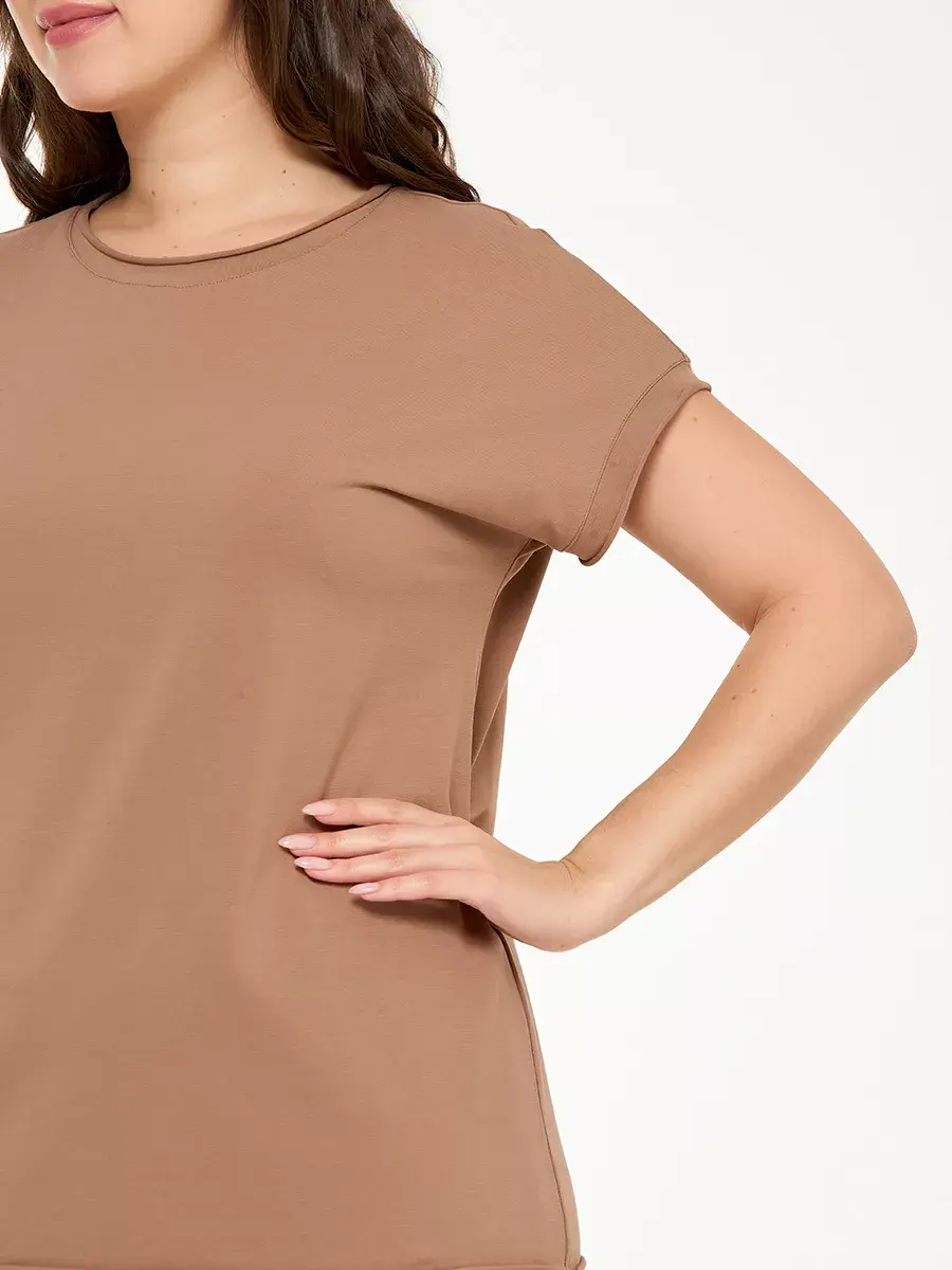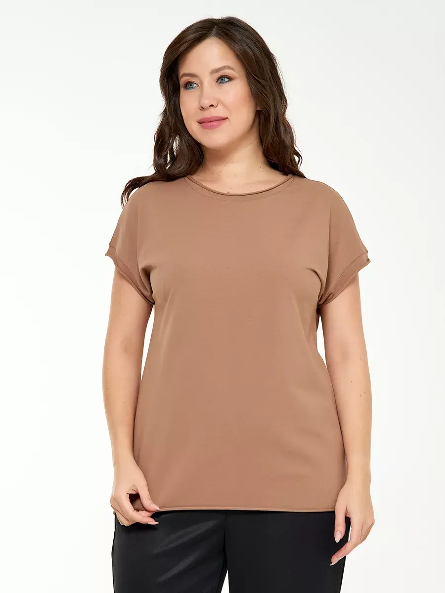 Повседневная женская футболка больших размеров от бренда OLSI выполнена из качественной кулирки с лайкрой.