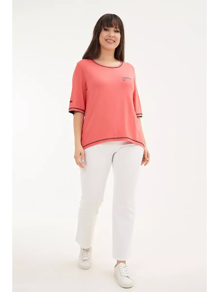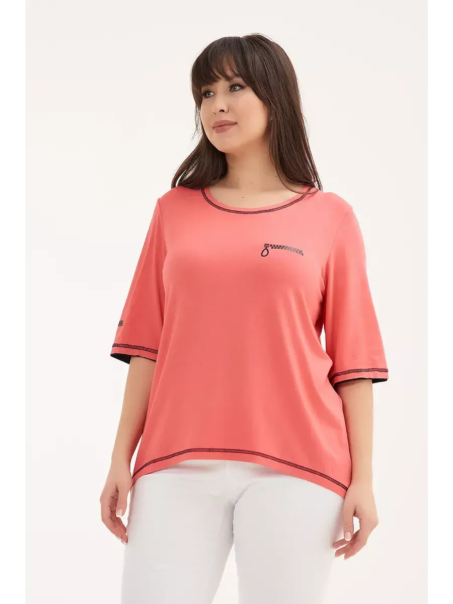 Повседневная футболка больших размеров от бренда OLSI выполнена из качественной кулирки с лайкрой. Рукава широкие, длиной по локоть. Футболка женская с асимметричным низом - спереди короче в виде арки. Все края футболки имеют обработку в открытый срез, с отделкой контрастными строчками. Бирюзовая блузка очень легкая, подойдет для дома, и для прогулок в летнее время года. Хорошо смотриться с брюками и джинсами.