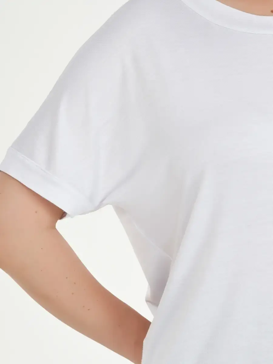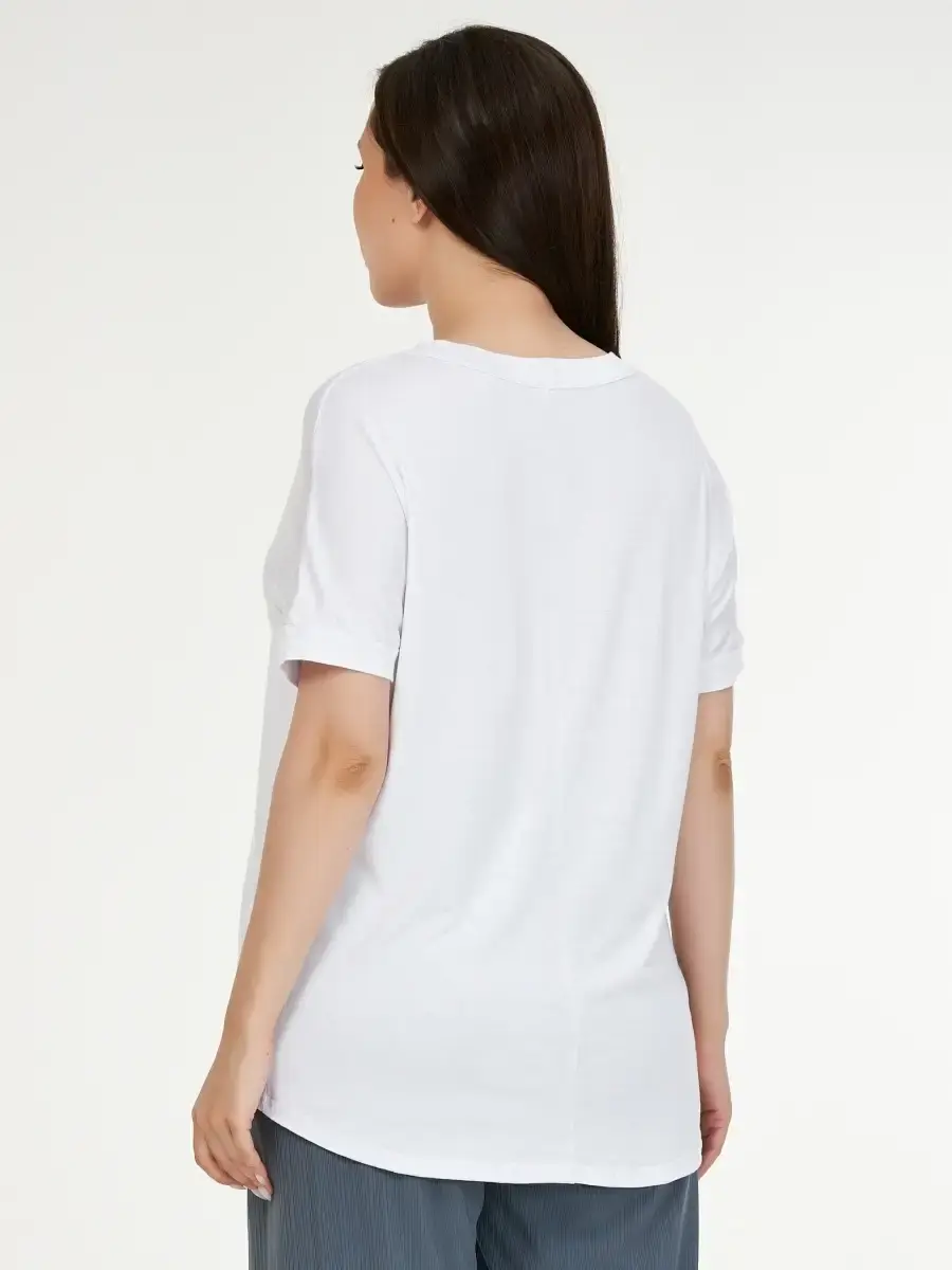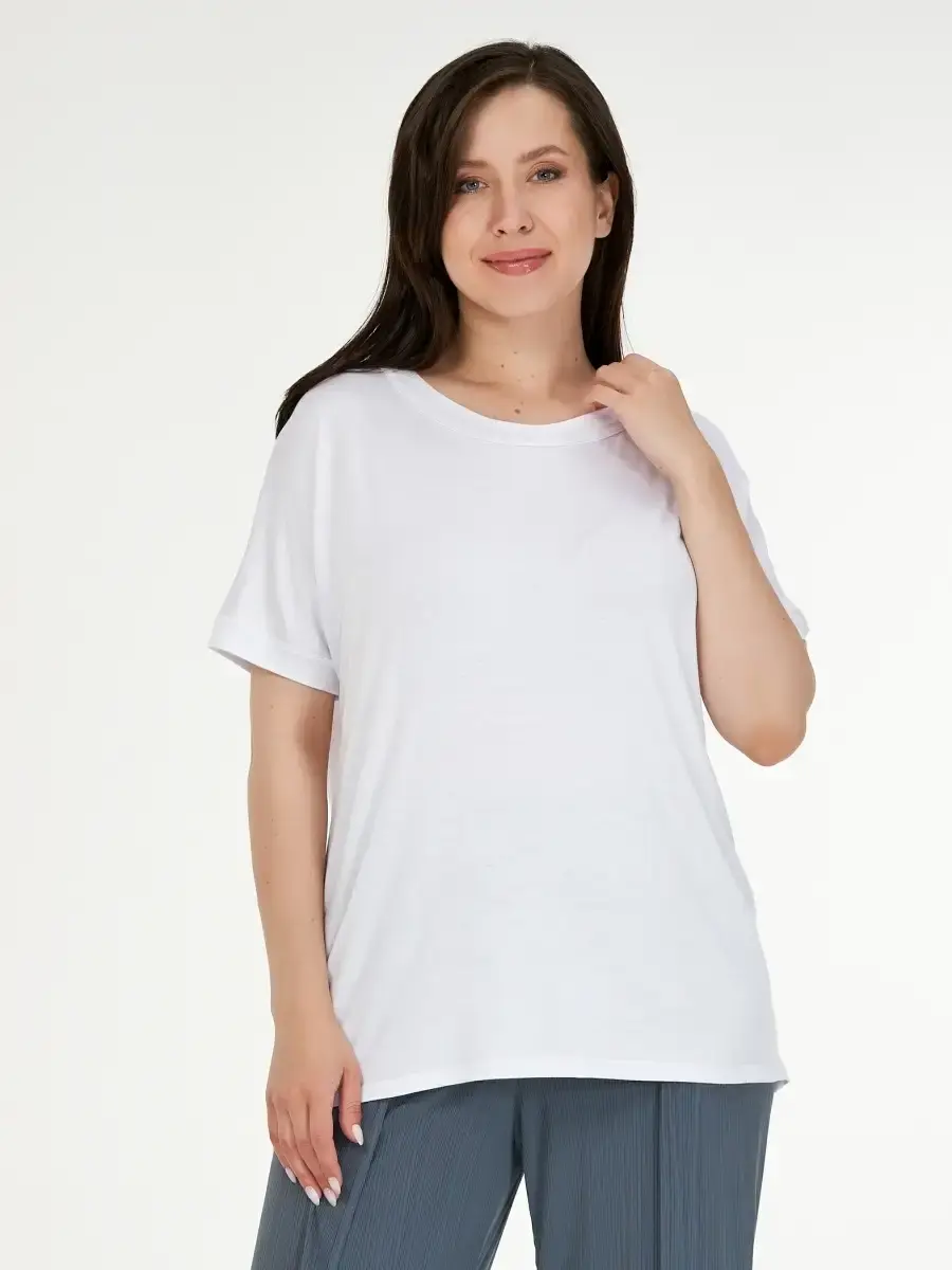 Свободная блузка большого размера из шелковистой вискозы в стиле оверсайз. Женская повседневная футболка больших размеров имеет свободный крой, выполнена из однотонного полотна выскоза с лайкрой. Футболка женская белая с коротким рукавом станет незаменимой вещью в Вашем гардеробе. Длина изделия по спинке от 73см в р.48 до 78,5 в р.70, рукав короткий цельнокроеный.