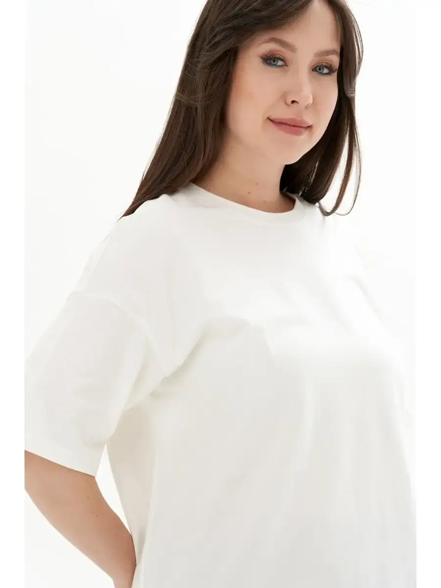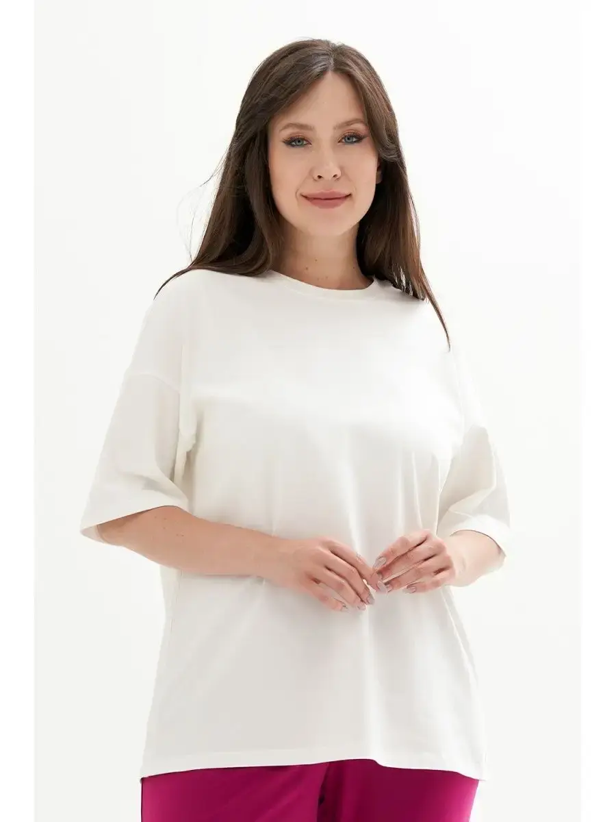 Базовая женская туника больших размеров, однотонная футболка в стиле оверсайз со спущенным плечом и рукавами до локтя. Универсальная модель со свободной посадкой для повседневных образов. Выполнена из мягкого, приятного к телу хлопка с добавлением эластана - премиум качество, - чтобы ткань не теряла форму, меньше мялась и за ней было легко ухаживать. Длина по спинке во всех размерах 72см, длина рукава 22см.