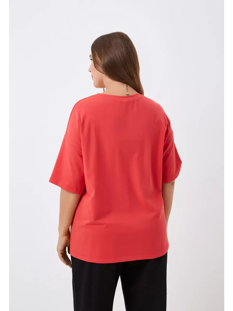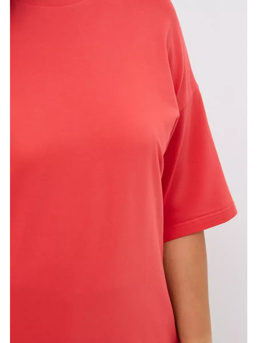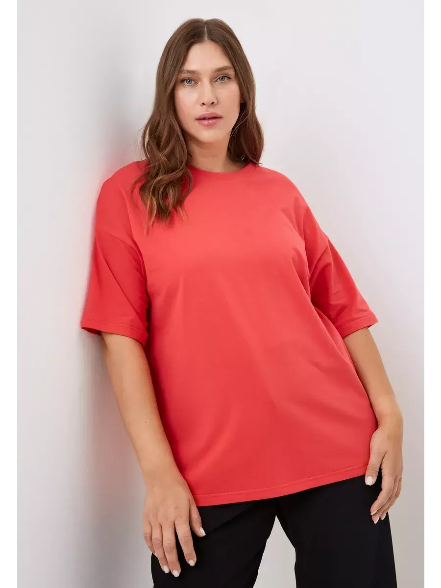 Базовая женская туника больших размеров, однотонная футболка в стиле оверсайз со спущенным плечом и рукавами до локтя. Универсальная модель со свободной посадкой для повседневных образов. Выполнена из мягкого, приятного к телу хлопка с добавлением эластана - премиум качество, - чтобы ткань не теряла форму, меньше мялась и за ней было легко ухаживать. Длина по спинке во всех размерах 72см, длина рукава 22см.