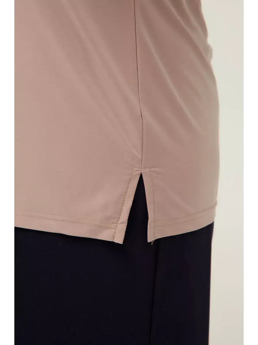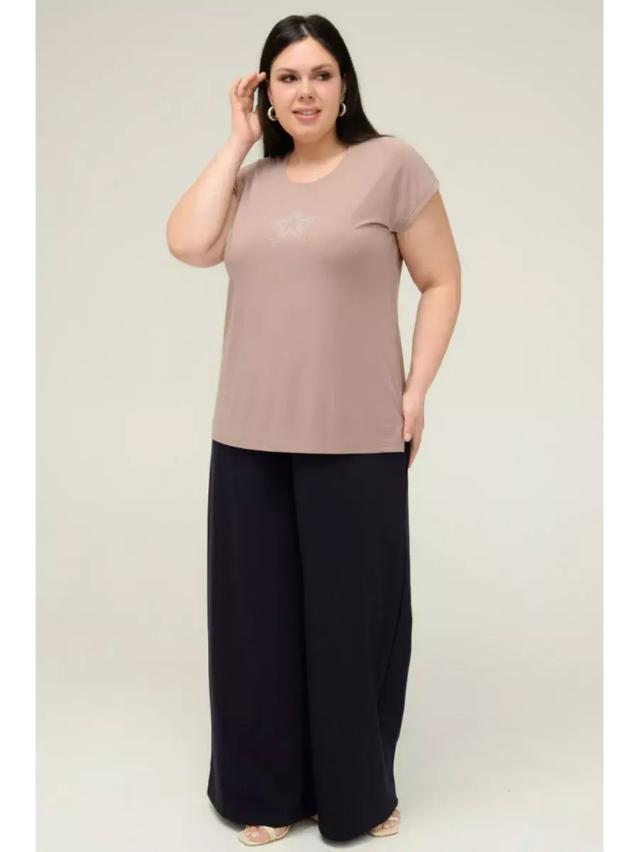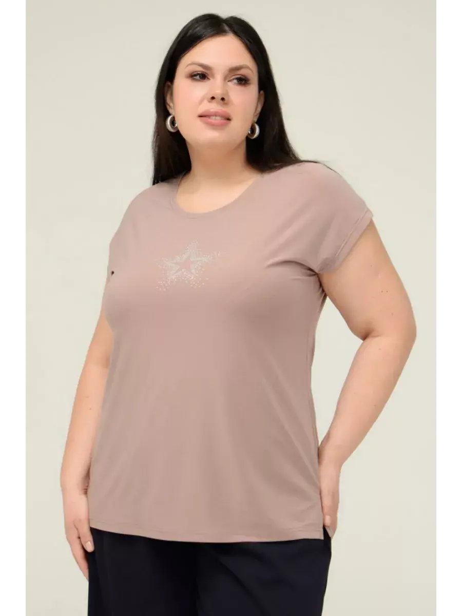 Повседневная блузка больших размеров от бренда OLSI прямого кроя из трикотажного полотна по типу масло. Блузка имеет фасон футболки, с разрезами по бокам, с коротким рукавом, и декорирована мелкими стразами в виде звёздочки. Женская футболка из трикотажа масло пользуется большой популярностью среди наших клиентов, немнущаяся ткань холодит в жару, не изнашивается, не выцветает, тонкая и струящаяся. Длина изделия по спинке от 69см в р.52 до 73,5см в р.70.