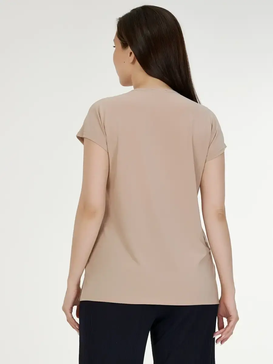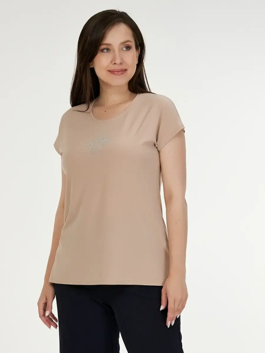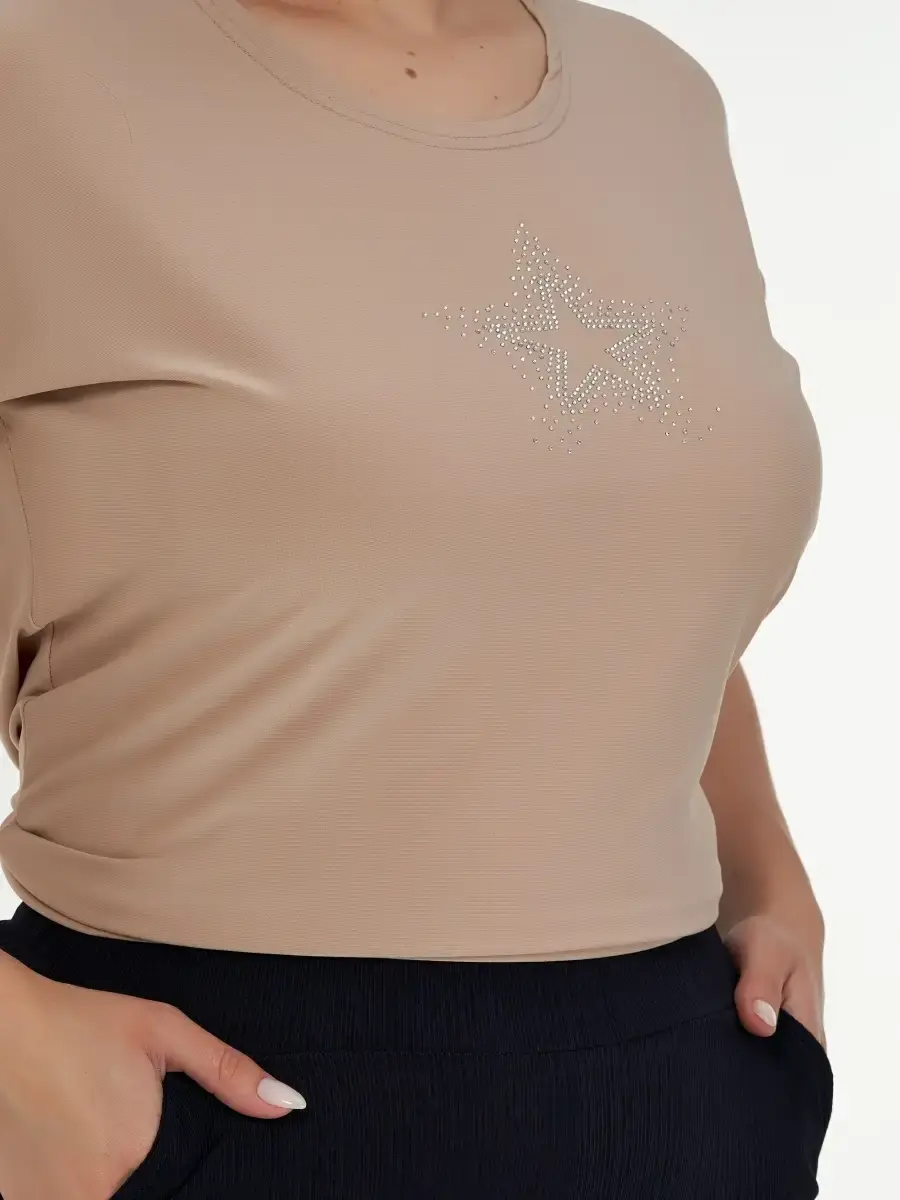 Однотонный женский топ большого размера выполнен из полотна по типу масло и декорирован мелкими стразами в виде звёздочки. Длина изделия по спинке от 68см в р .48 до 73,5см в р.70.