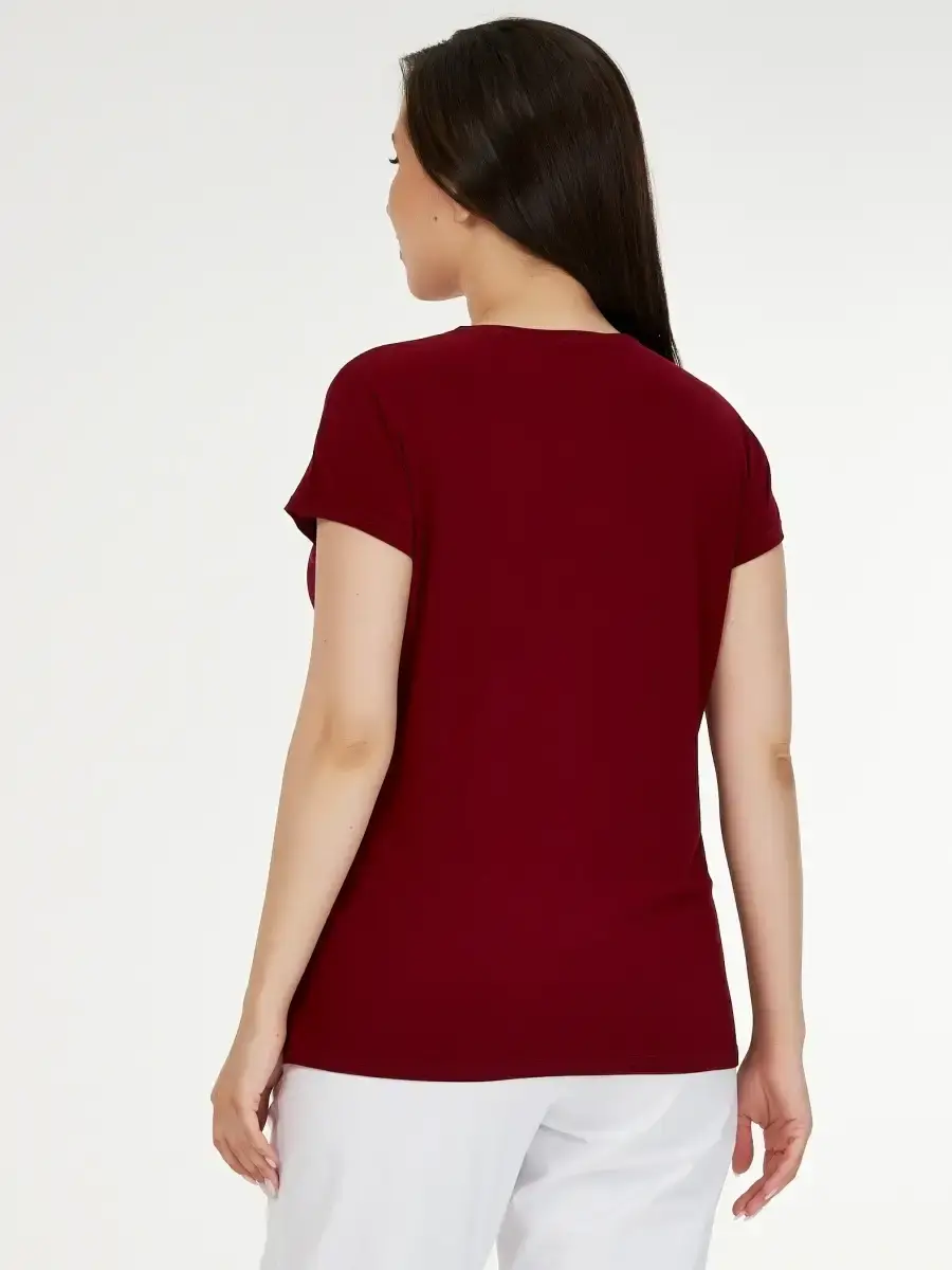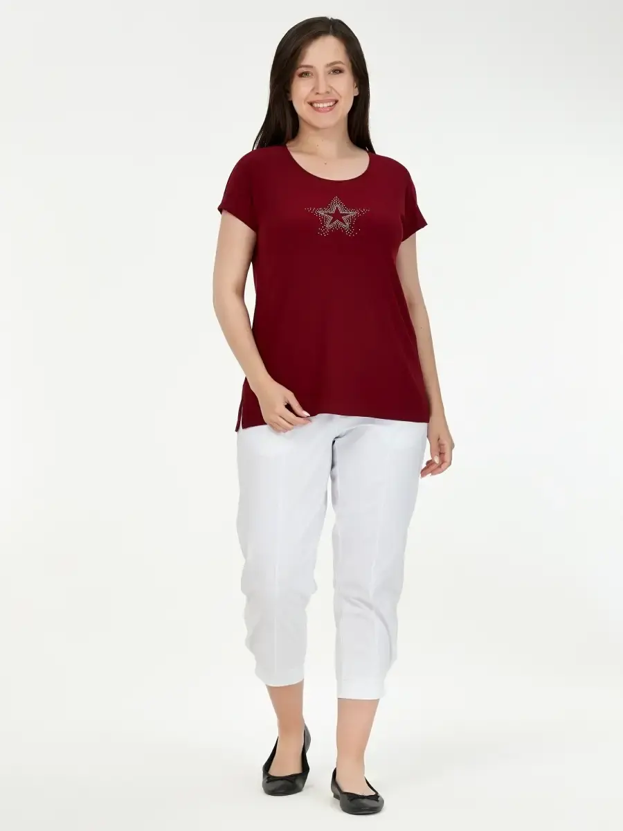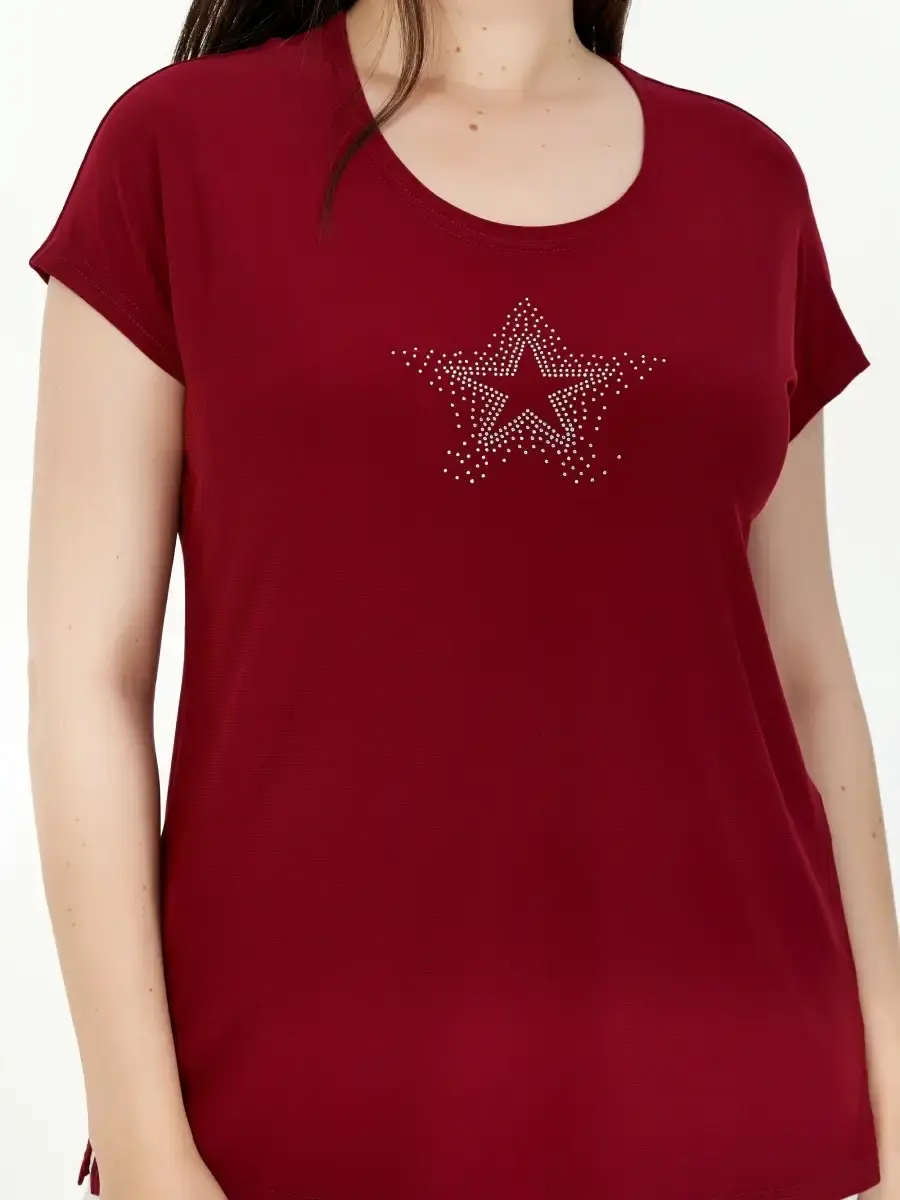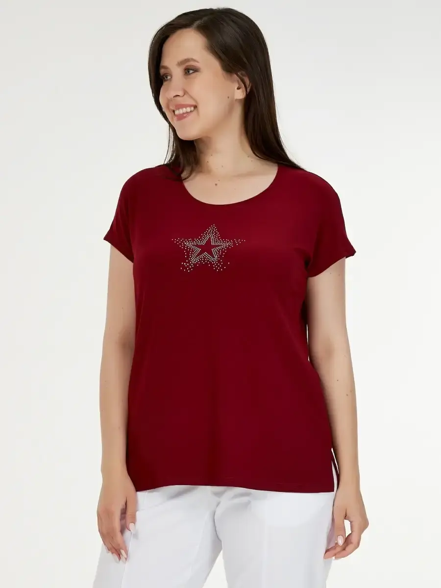 Однотонный женский топ большого размера выполнен из полотна по типу масло и декорирован мелкими стразами в виде звёздочки. Длина изделия по спинке от 68см в р .48 до 73,5см в р.70.
