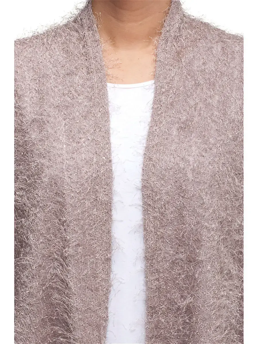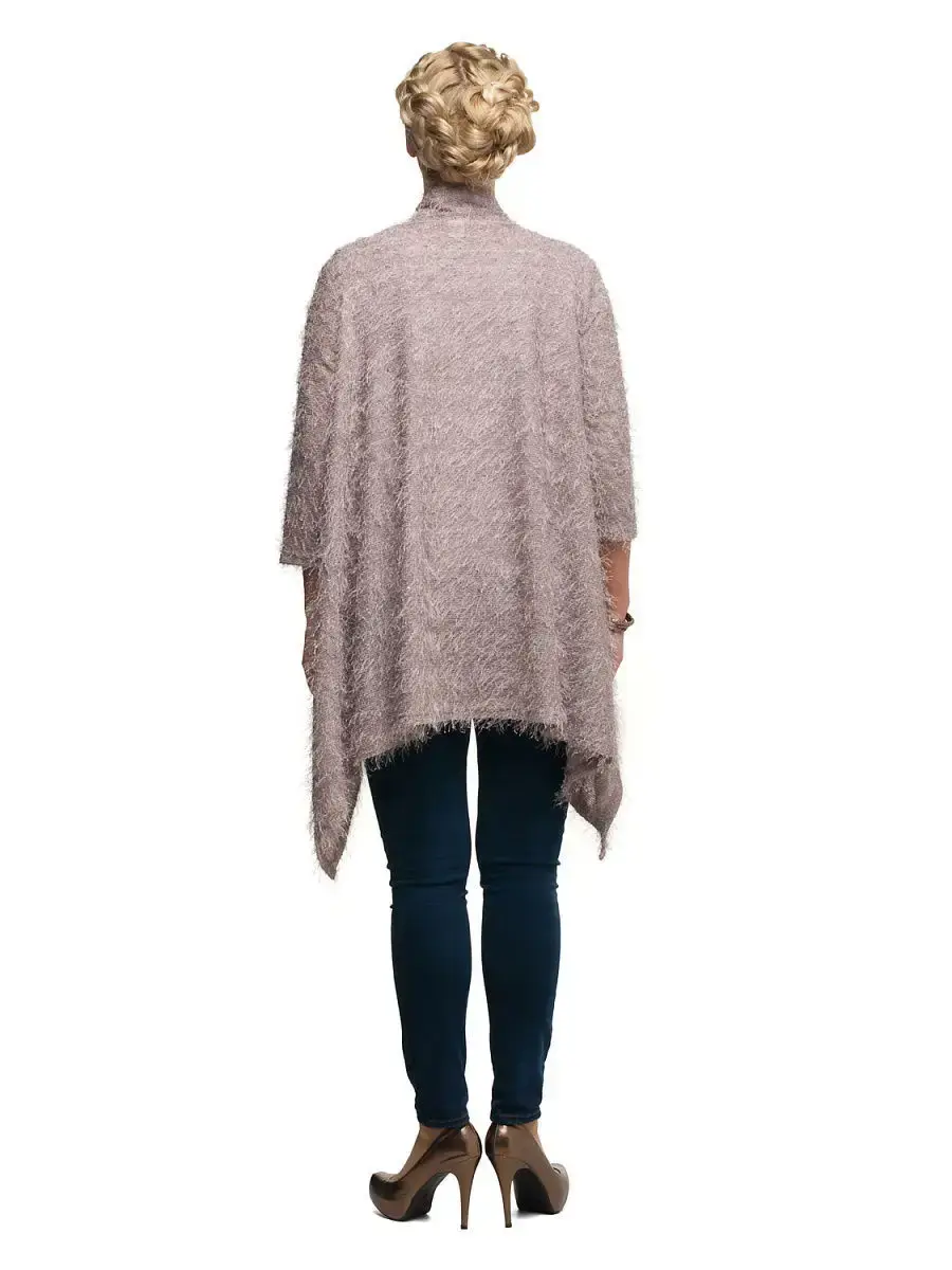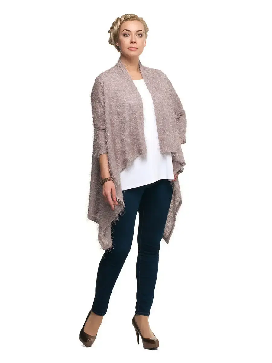 Оригинальный кардиган кейп из нарочито «лохматого» мягкого трикотажа, кроем напоминающий накинутый на плечи платок. Модель с V-образным вырезом; без застежки; с чуть вздернутой линией талии спереди, визуально удлиняющей ноги. Низ изделия ассиметричный: прямой, ниже линии бедер сзади, до колен по бокам, с концами «пиками», вуалирующими объем на бедрах. Мягкая драпировка нивелирует особенности фигуры, придает образу мягкость, а слегка «растрепанная» текстура ткани - домашние уютные нотки.
