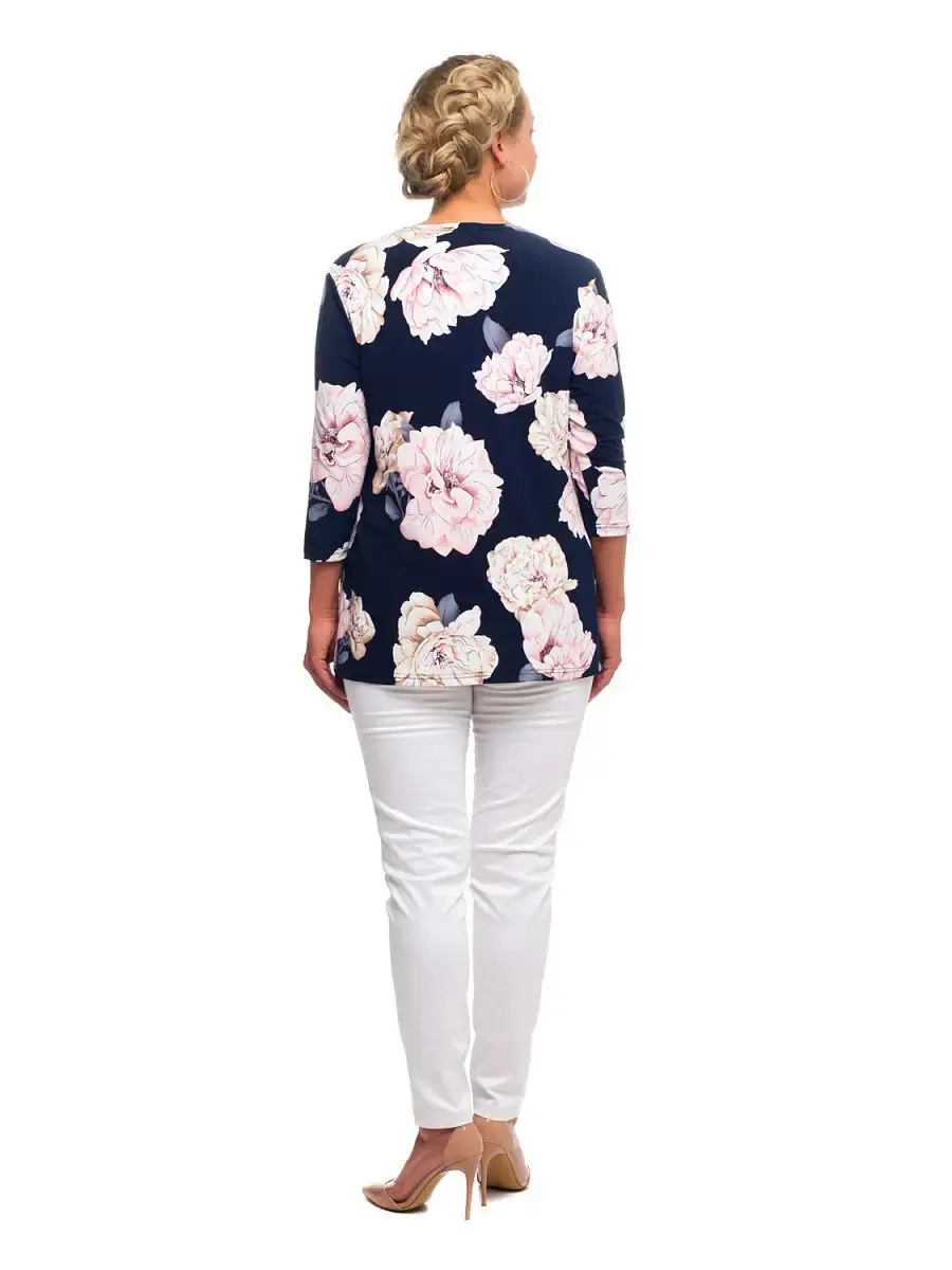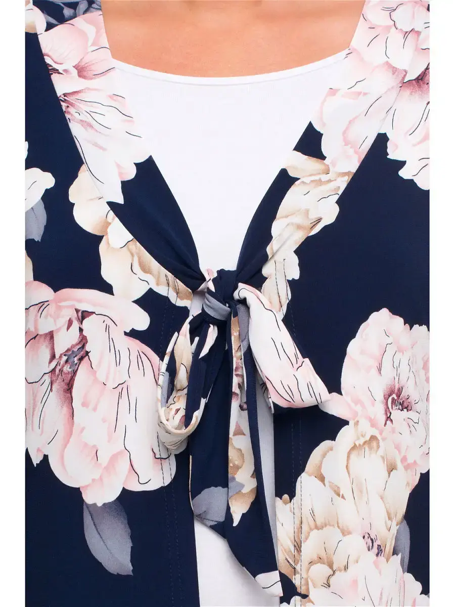 Эффектный кардиган из мягкой эластичной ткани с крупным цветочным принтом. Модель полуприлегающего кроя, с треугольным ассиметричным низом спереди; втачными рукавами длиной 3/4; глубоким V-образным вырезом горловины, с воротником- окантовкой, завязывающейся на бант. Изделие без застежки, с не сходящимися полами, которые придают линиям силуэта плавность и вуалируют особенности фигуры. Подойдет тем, кто желает выглядеть романтично и женственно.