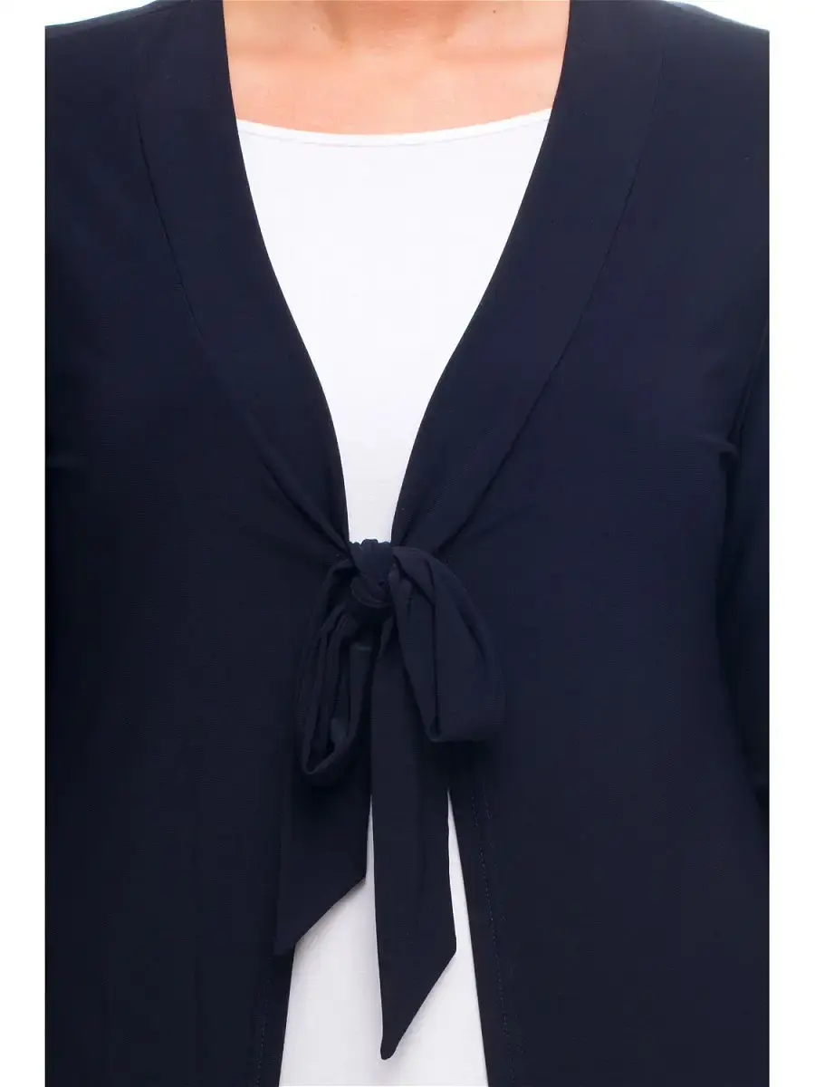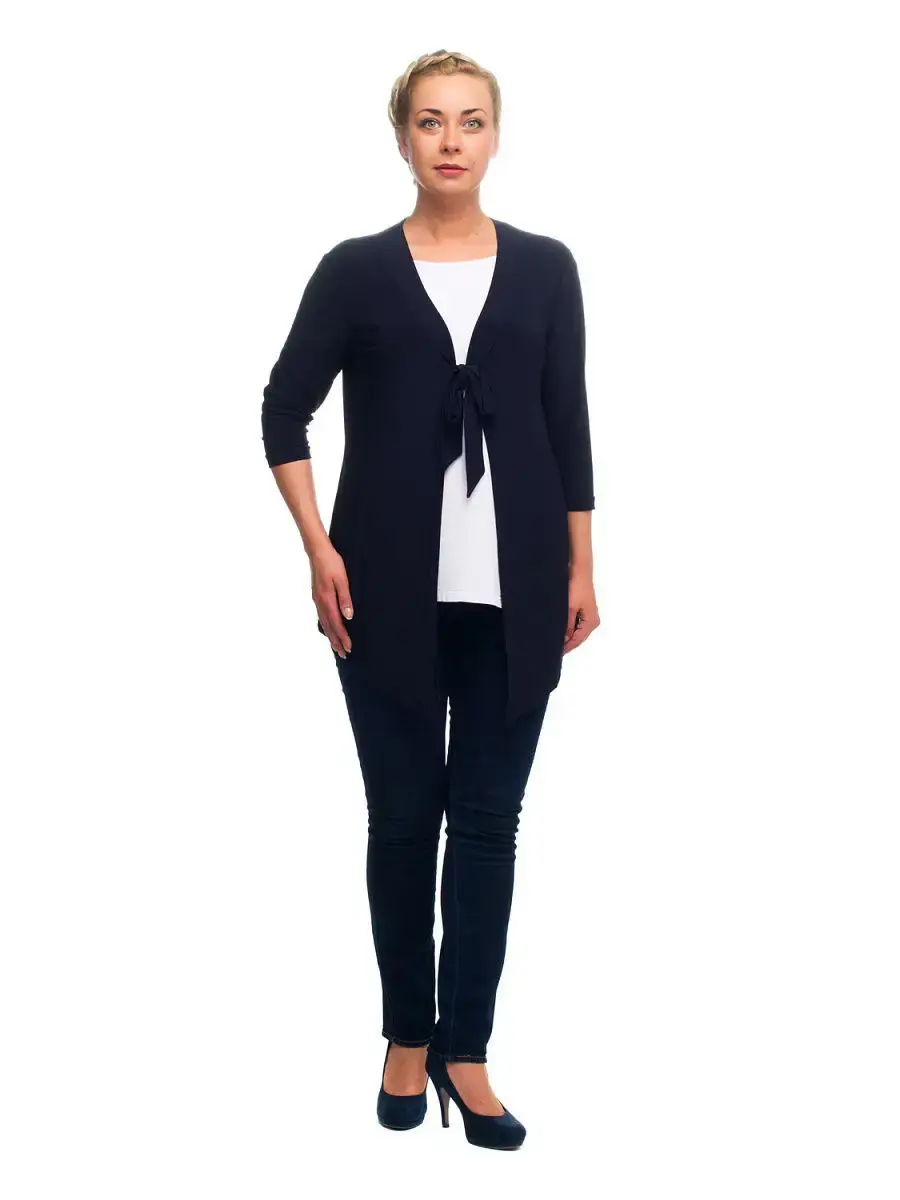 Эффектный кардиган из мягкой эластичной ткани. Модель полуприлегающего кроя, с треугольным ассиметричным низом спереди; втачными рукавами длиной 3/4; глубоким V-образным вырезом горловины, с воротником- окантовкой, завязывающейся на бант. Изделие без застежки, с не сходящимися полами, которые придают линиям силуэта плавность и вуалируют особенности фигуры. Подойдет тем, кто желает выглядеть элегантно и женственно.