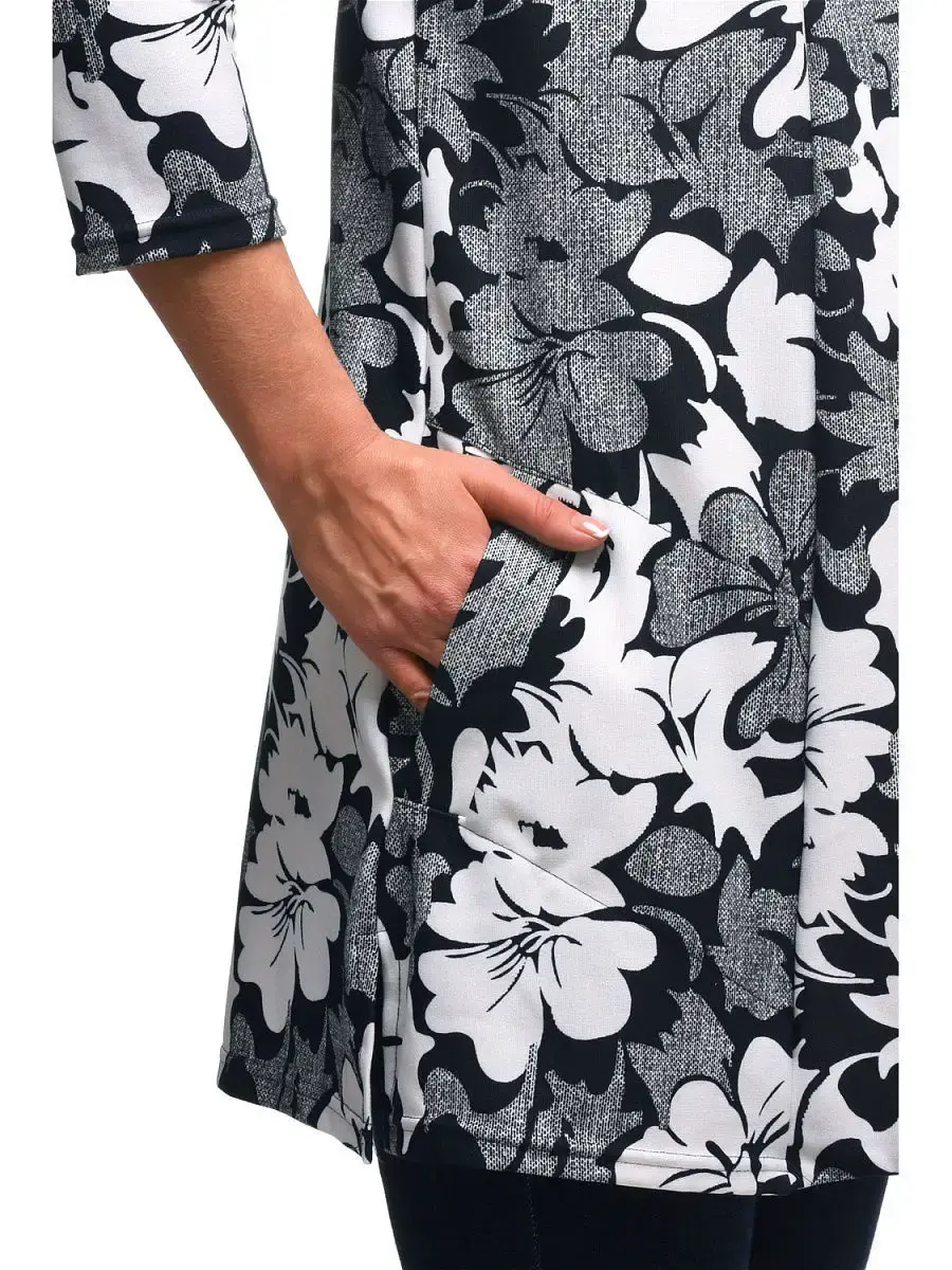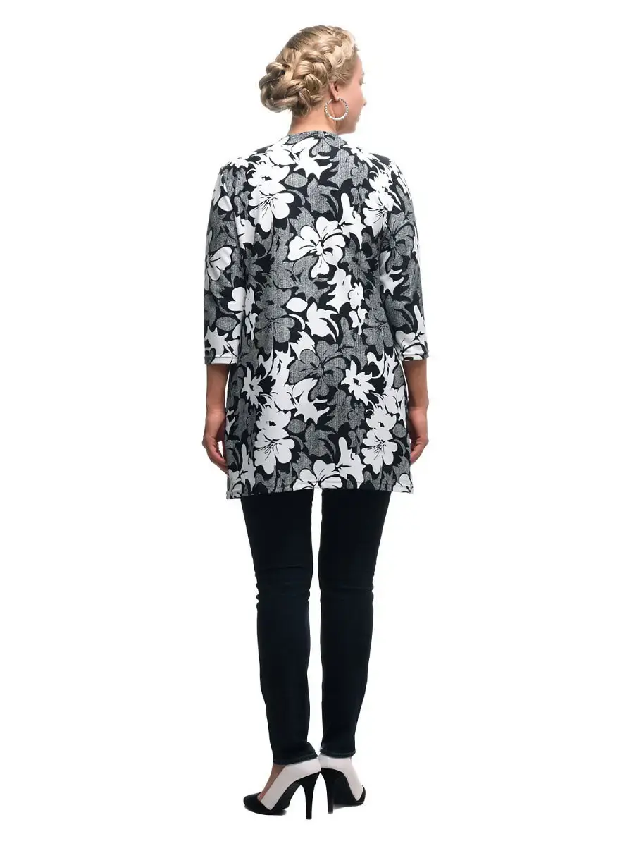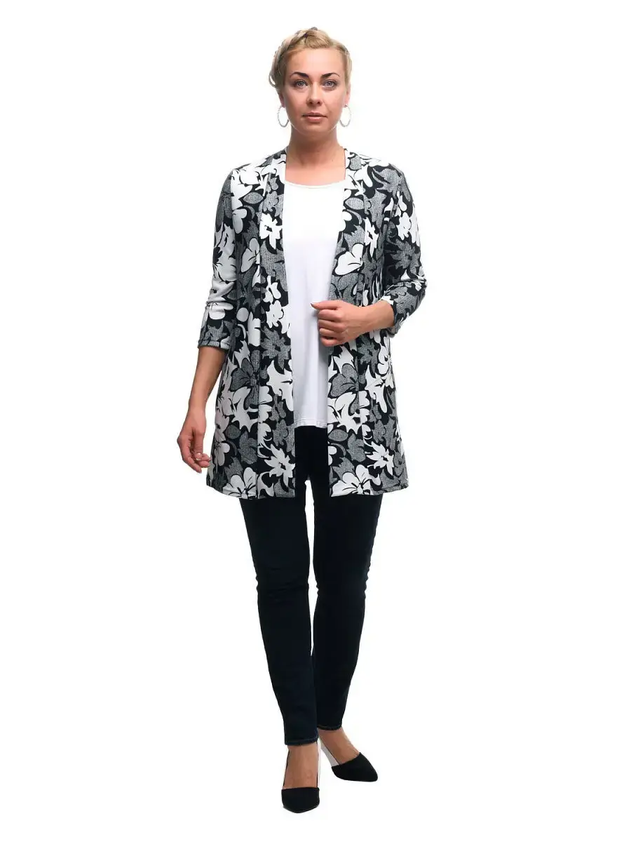 Стильный кардиган из тонкого трикотажа с крупным цветочным принтом; V-образным вырезом; втачными рукавами длиной 3/4; врезными боковыми карманами с листочкой. Кардиган без застежки.