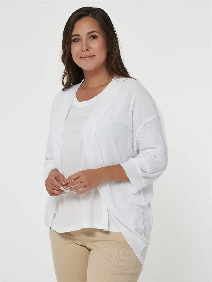 Женский кардиган свободного силуэта без застёжки, с обтачкой по горловине и фигурному борту, из тонкого полупрозрачного трикотажа с фактурной полоской. Длина по спинке: р.48-80смр.50-80,5смр.52-81смр.54-81,5смр.56-82смр.58-82,5смр.60-83смр.62-83,5смр.64-84смр.66-84,5смр.68-85смр.70-85,5смДлина рукава 45см.