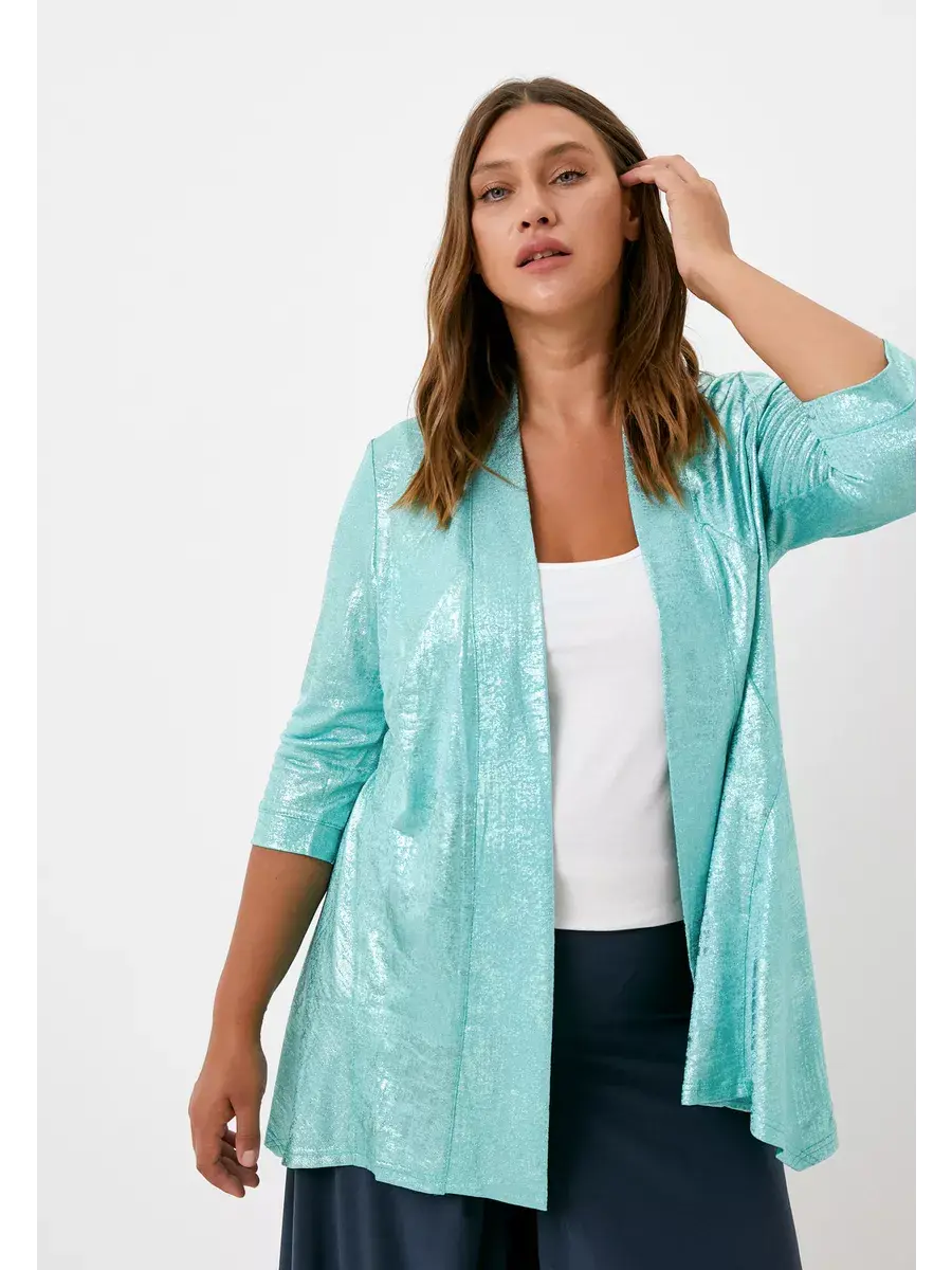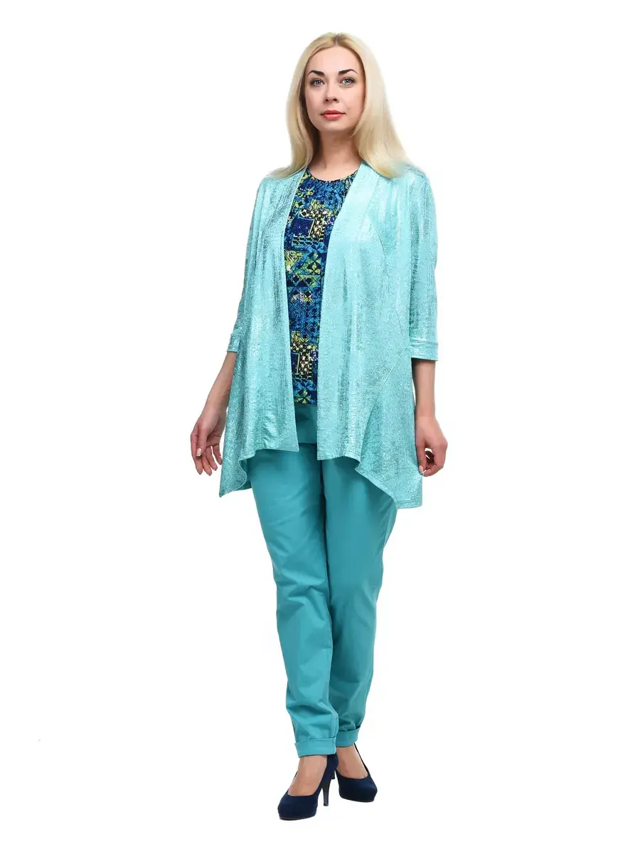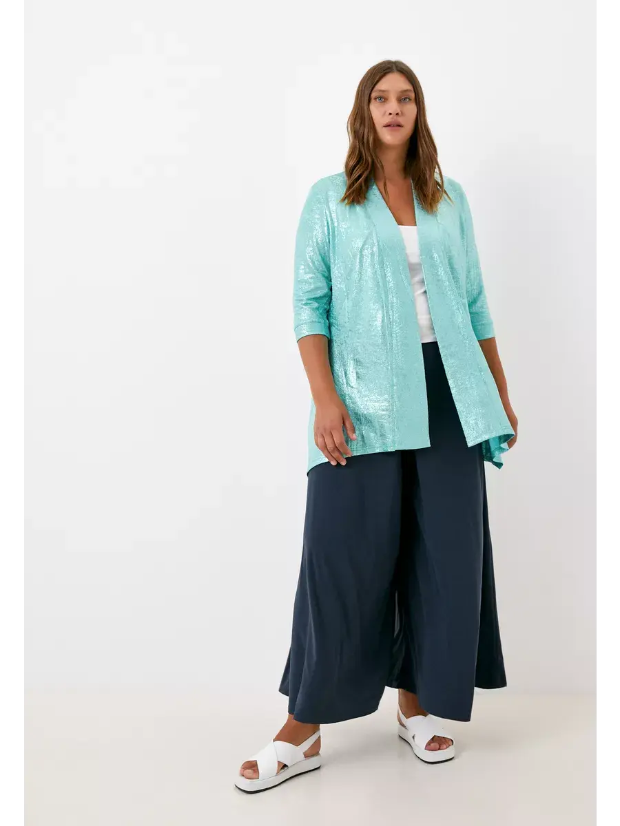 Эффектный нарядный кардиган больших размеров от бренда OLSI из струящейся легкой ткани масло с мелким геометрическим принтом. Модель кардигана из трикотажа холодок, расклешенная книзу; спинка на кокетке со сборкой; V-образная горловина без воротника; кардиган летний с втачными рукавами длиной 3/4 с манжетами, перекликающимися с окантовкой полочек по линии борта.