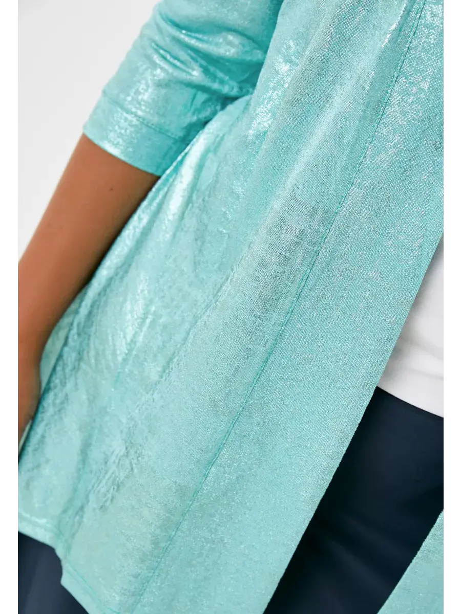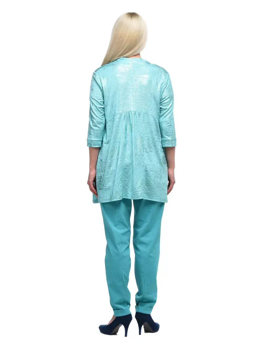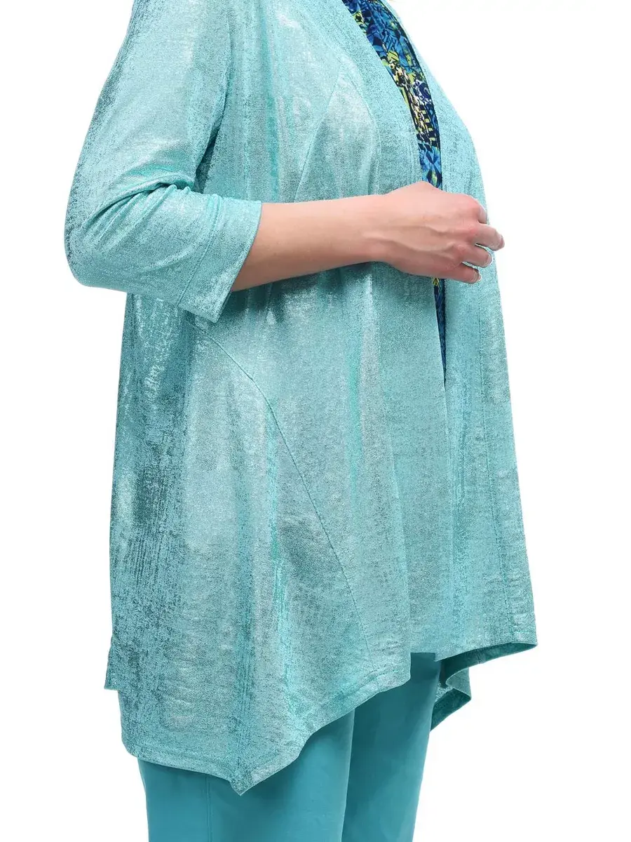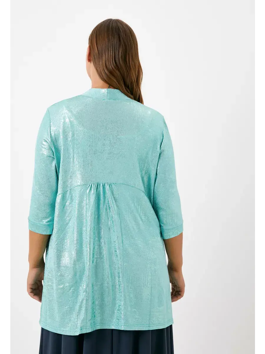 Эффектный нарядный кардиган больших размеров от бренда OLSI из струящейся легкой ткани масло с мелким геометрическим принтом. Модель кардигана из трикотажа холодок, расклешенная книзу; спинка на кокетке со сборкой; V-образная горловина без воротника; кардиган летний с втачными рукавами длиной 3/4 с манжетами, перекликающимися с окантовкой полочек по линии борта.