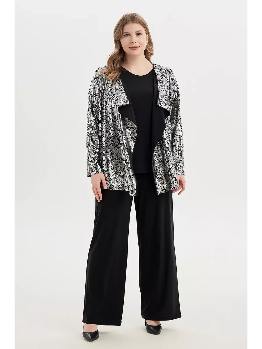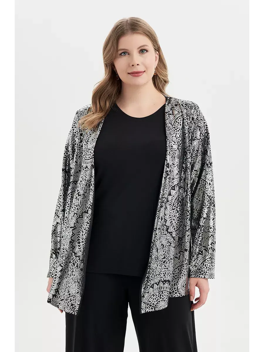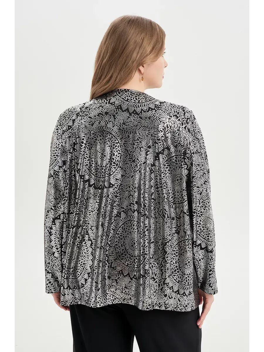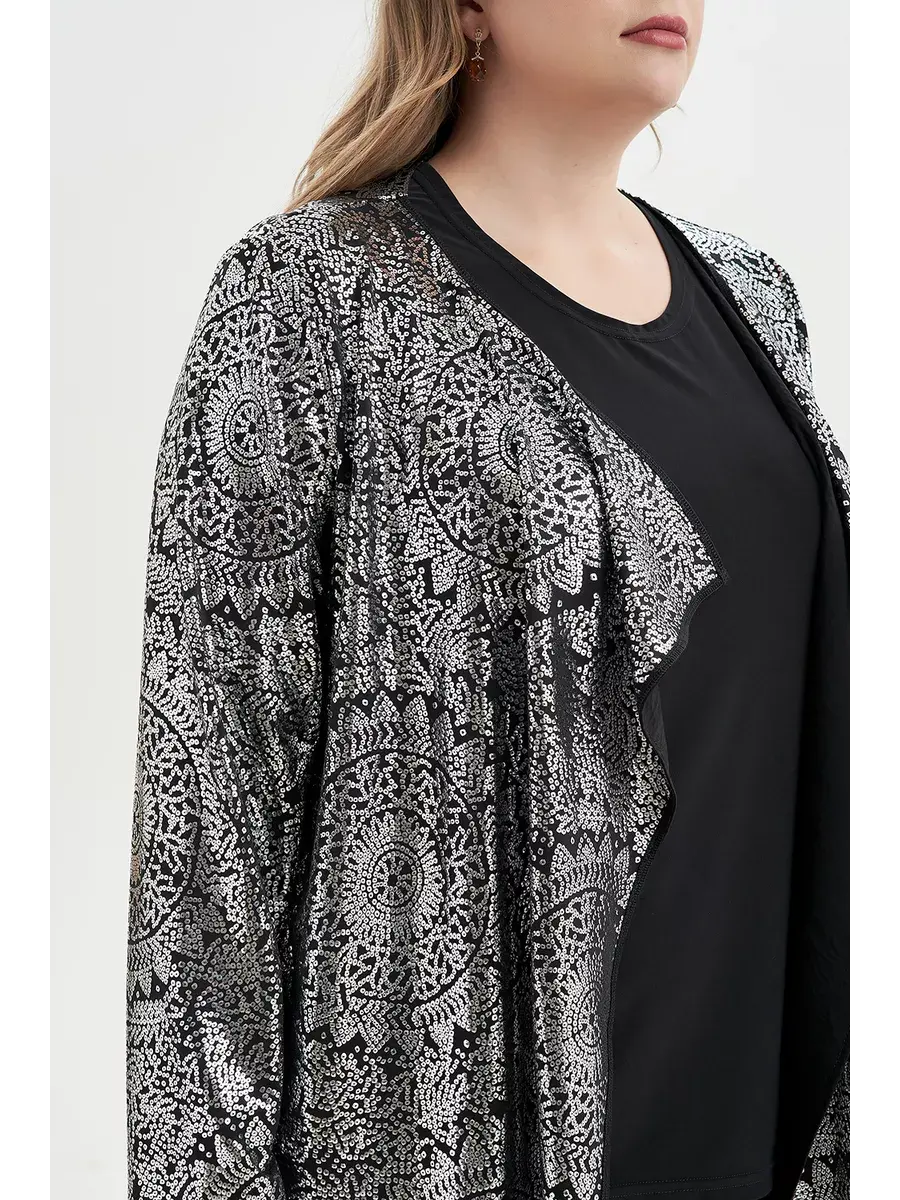 Женский нарядный кардиган больших размеров от бренда OLSI выполнен из трикотажного полотна по типу масло с блестящим принтом-фойлом. Эффектный золотой кардиган с длинным рукавом. Вечерняя накидка A-силуэта без застежки, с запахом, поэтому в свободном виде углы полочек длиннее. Вырез горловины глубокий V-образный, шалевым воротник. Кардиган праздничный золотой выполнен из качественного струящегося и немнущегося материала, приятного к телу, лёгкий и мягкий. Это изысканное дополнение наряда, которое добавит Вашему образу выразительности и блеска. Подойдёт как для особых случаев, так и для повседневной носки. Блестящую кофточку можно носить как на торжественные мероприятия свадьба, день рождения, театр ресторан, так и в повседневной жизни. Благодаря сдержанному и лаконичному фасону он легко сочетается с базовыми вещами, создавая элегантный и гармоничный образ. Преимущества жакета: яркий дизайн в расцветках золото и серебро привлекает внимание. Отличное сочетание стиля и удобства. Если вы ищете вещь, которая подчеркнёт Вашу индивидуальность и станет украшением любого образа, этот кардиган — идеальный выбор. Добавьте нотку блеска в свой гардероб и наслаждайтесь комплиментами! Яркий жакет станет отличным подарком для любимой мамы, девушки или бабушки на Новый год. Или станет вашимярким нарядом на корпоратив.