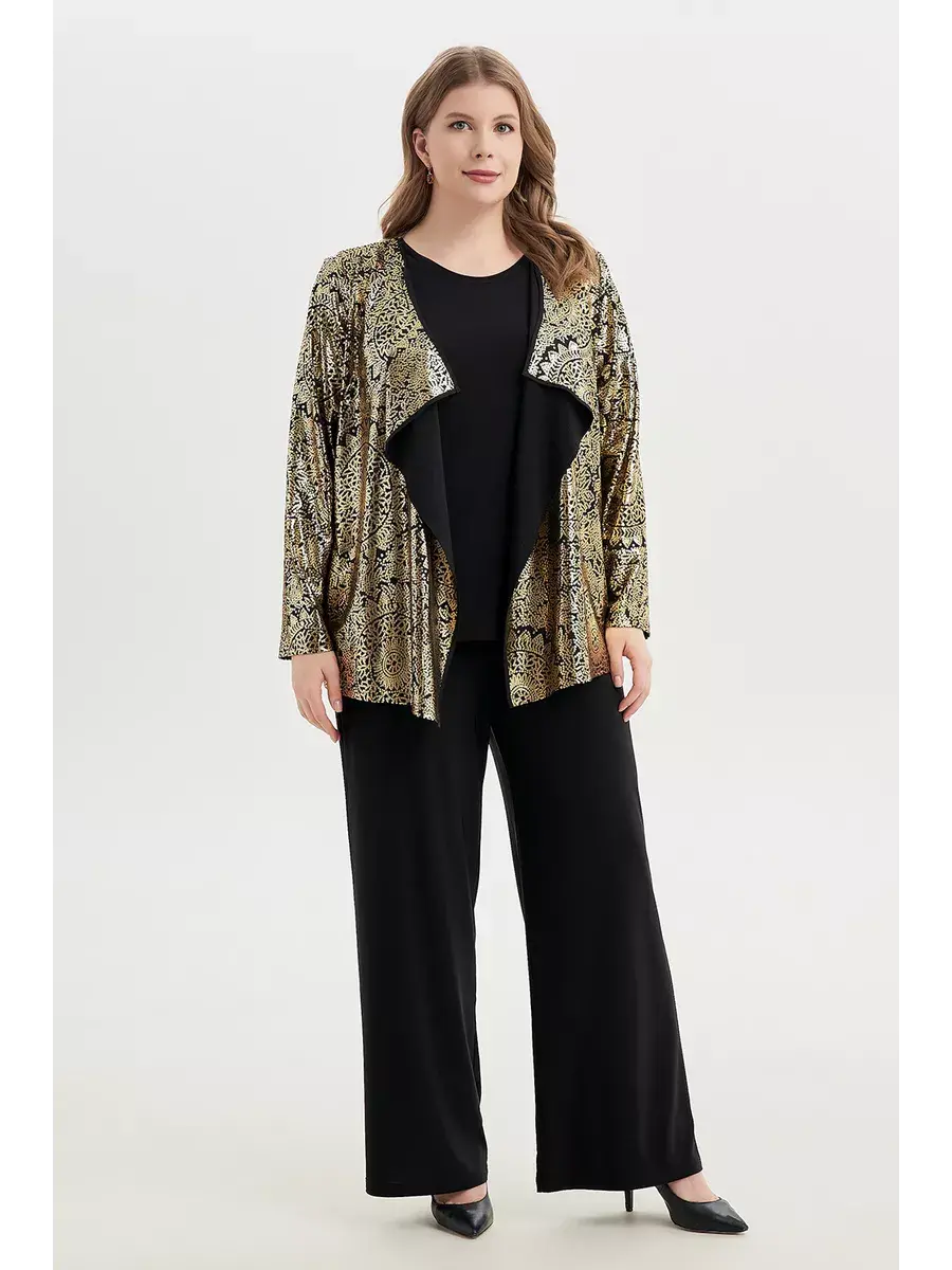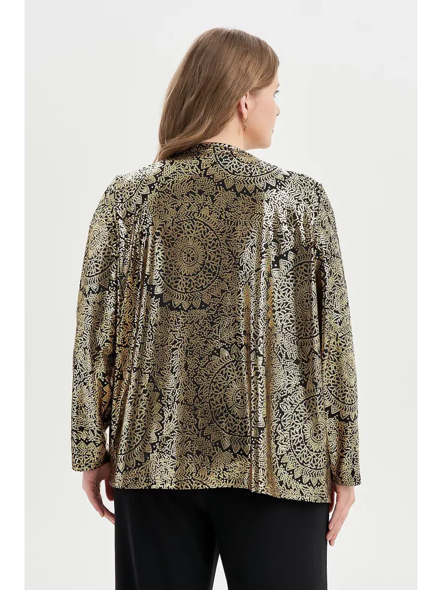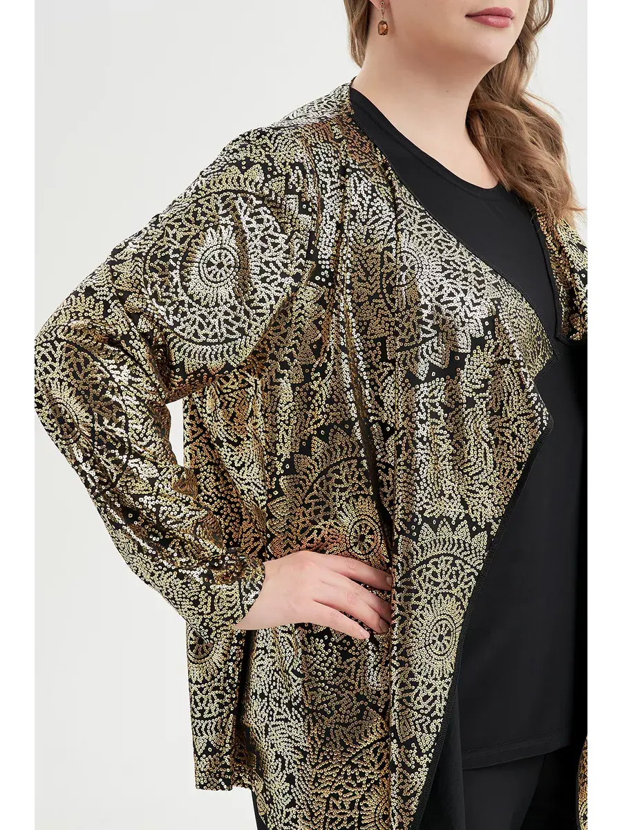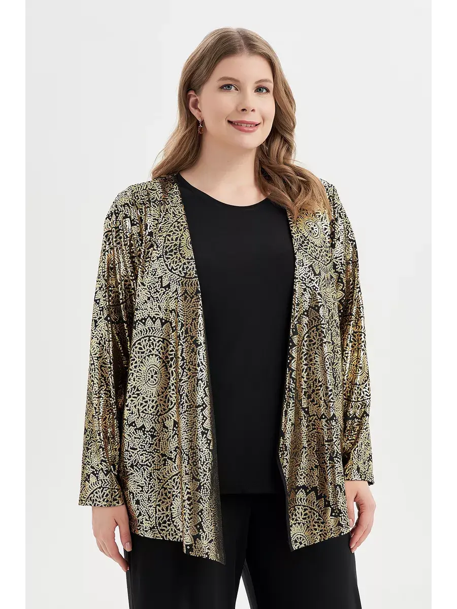Женский нарядный кардиган больших размеров от бренда OLSI выполнен из трикотажного полотна по типу масло с блестящим принтом-фойлом. Эффектный золотой кардиган с длинным рукавом. Вечерняя накидка A-силуэта без застежки, с запахом, поэтому в свободном виде углы полочек длиннее. Вырез горловины глубокий V-образный, шалевым воротник. Кардиган праздничный золотой выполнен из качественного струящегося и немнущегося материала, приятного к телу, лёгкий и мягкий. Это изысканное дополнение наряда, которое добавит Вашему образу выразительности и блеска. Подойдёт как для особых случаев, так и для повседневной носки. Блестящую кофточку можно носить как на торжественные мероприятия свадьба, день рождения, театр ресторан, так и в повседневной жизни. Благодаря сдержанному и лаконичному фасону он легко сочетается с базовыми вещами, создавая элегантный и гармоничный образ. Преимущества жакета: яркий дизайн в расцветках золото и серебро привлекает внимание. Отличное сочетание стиля и удобства. Если вы ищете вещь, которая подчеркнёт Вашу индивидуальность и станет украшением любого образа, этот кардиган — идеальный выбор. Добавьте нотку блеска в свой гардероб и наслаждайтесь комплиментами! Яркий жакет станет отличным подарком для любимой мамы, девушки или бабушки на Новый год. Или станет вашимярким нарядом на корпоратив.
