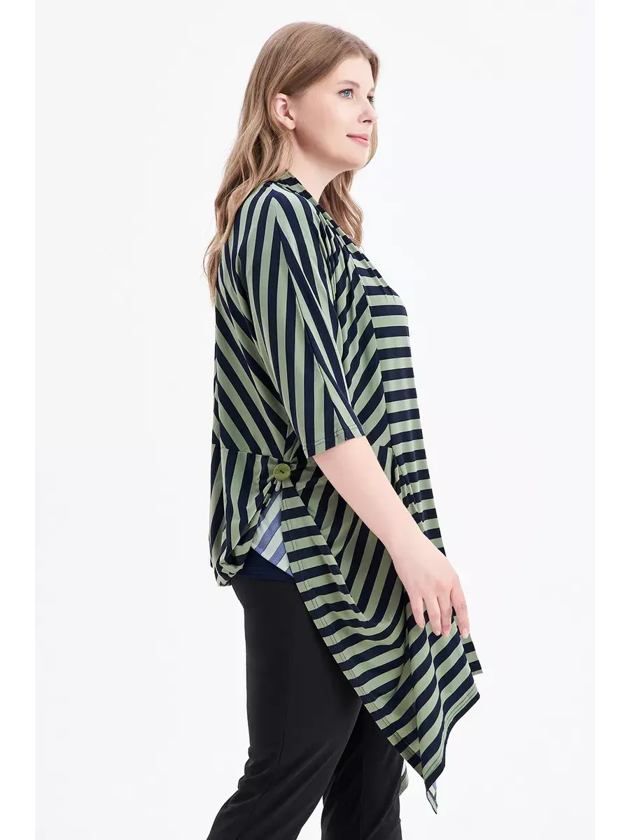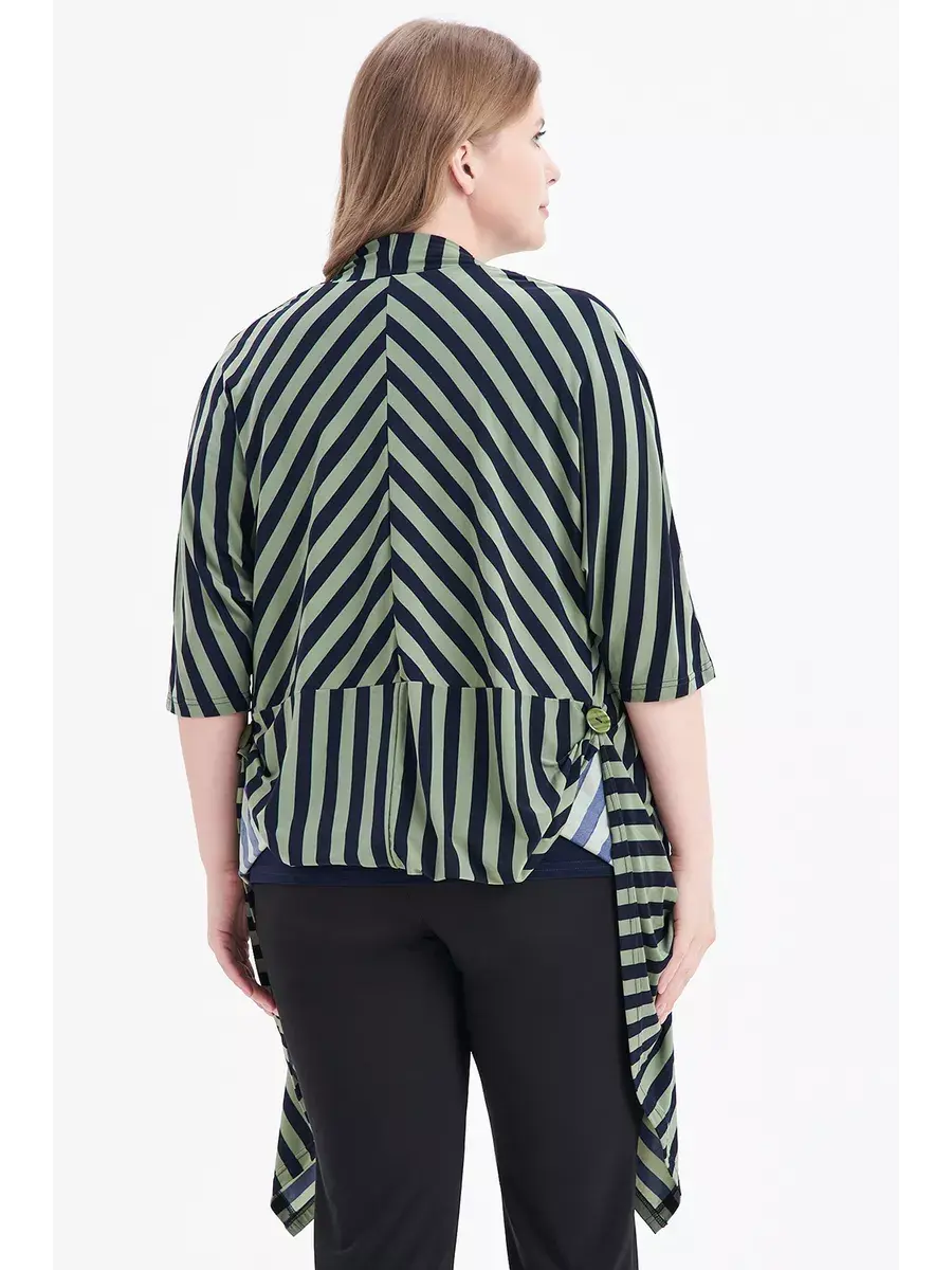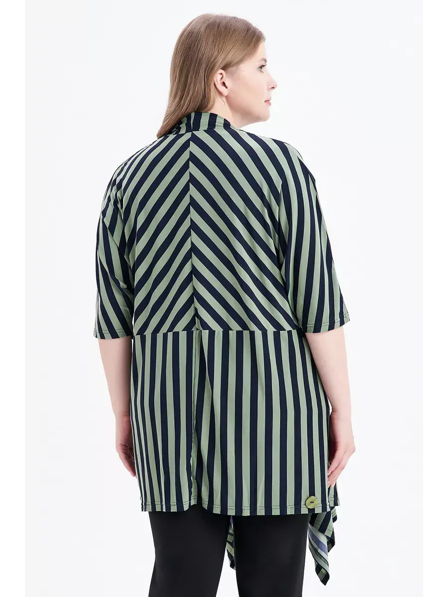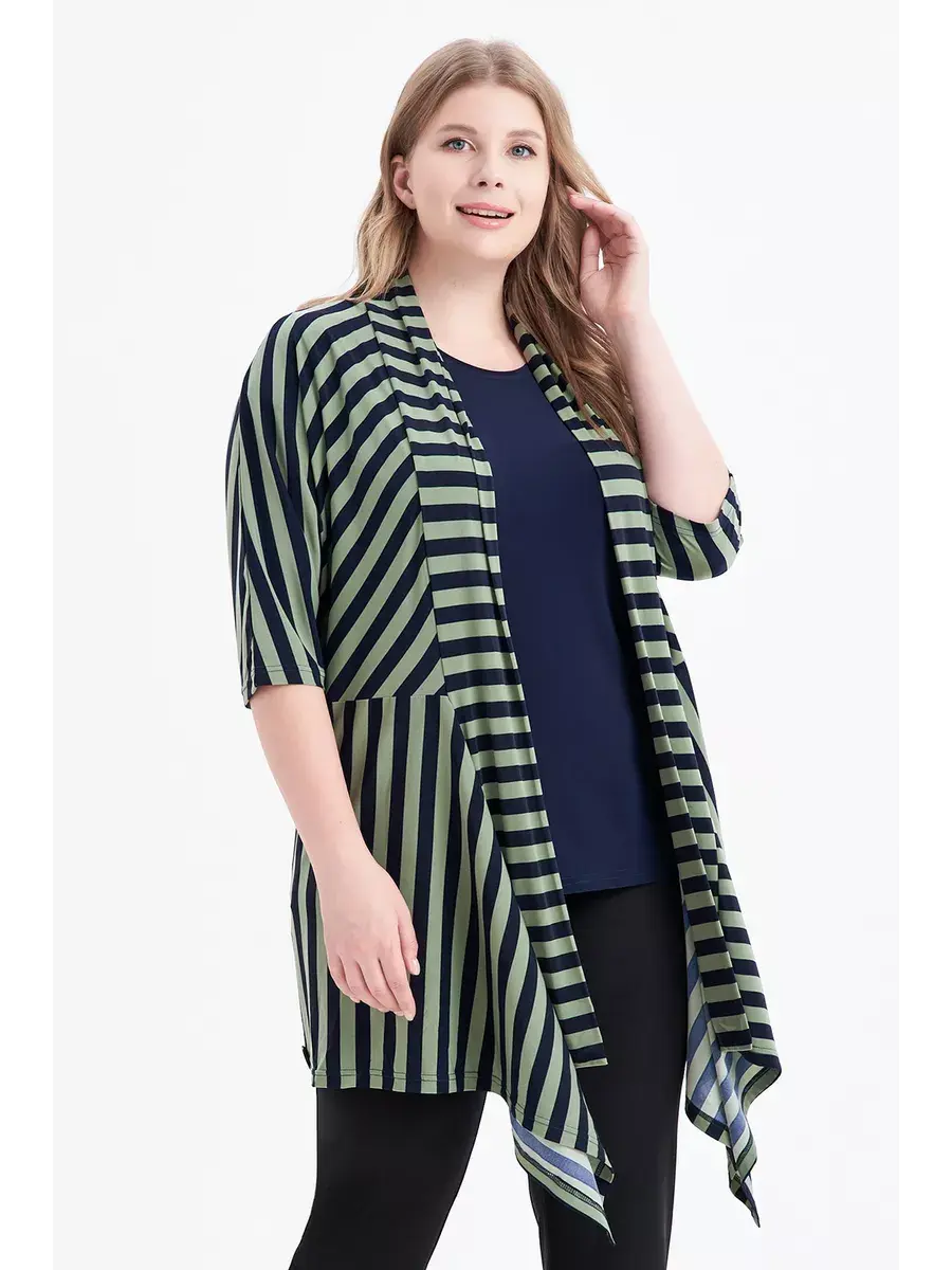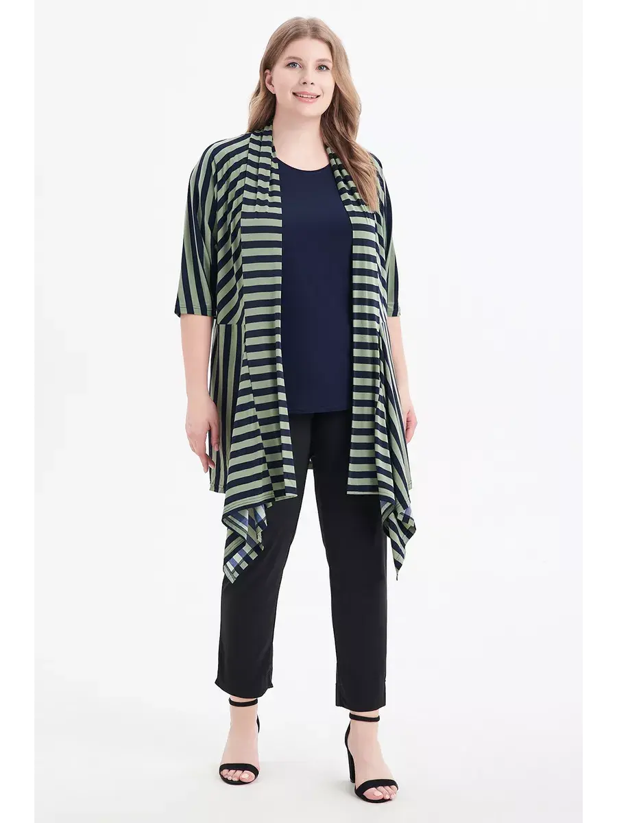 Женский повседневный кардиган больших размеров от бренда OLSI. Кардиган в полоску выполнен из ткани трикотаж масло. Ткань не мнется, быстро сохнет. Накидка женская можно носить с джинсами и классическими брюками. Накинуть как пляжный вариант на купальник.