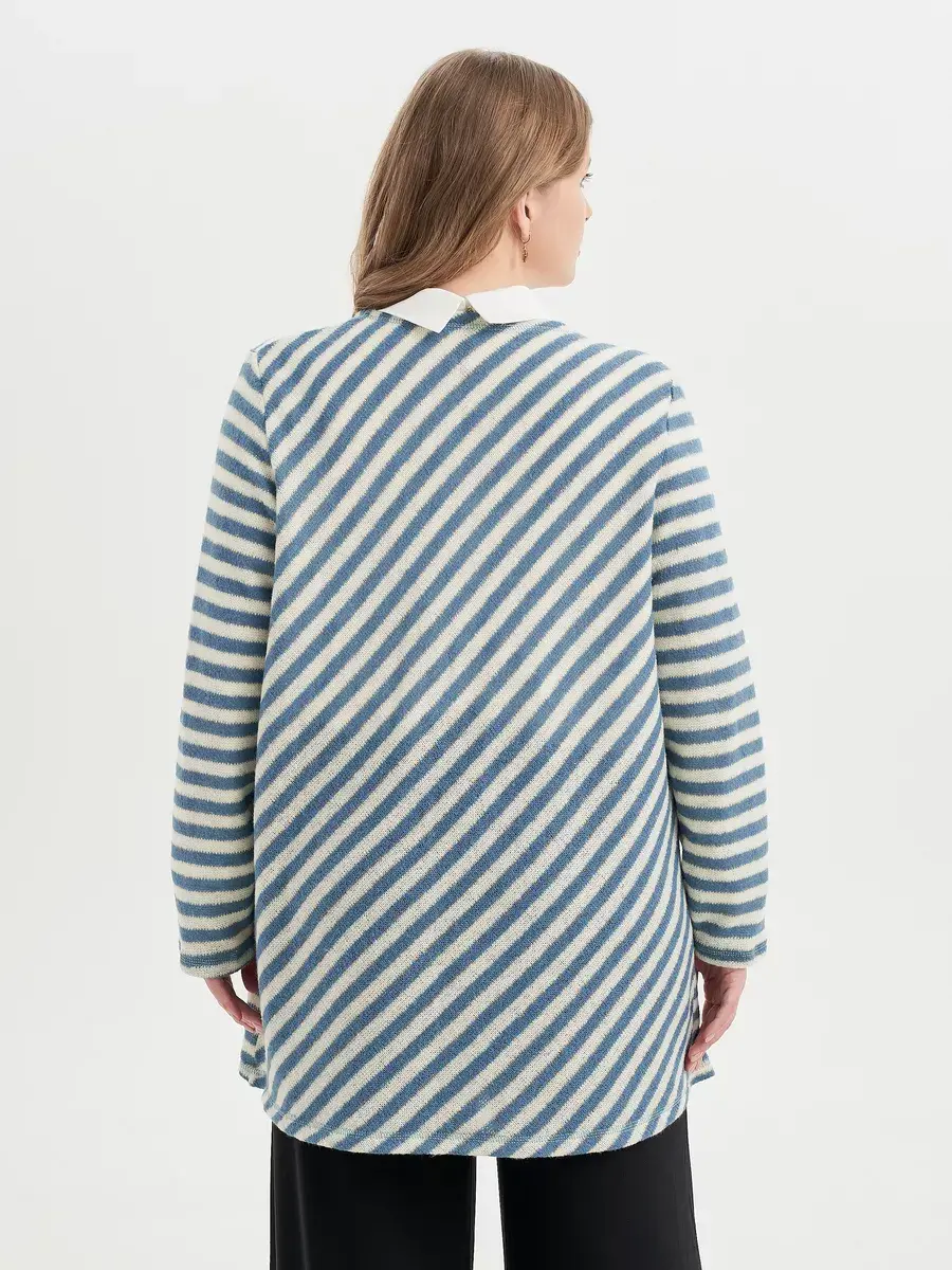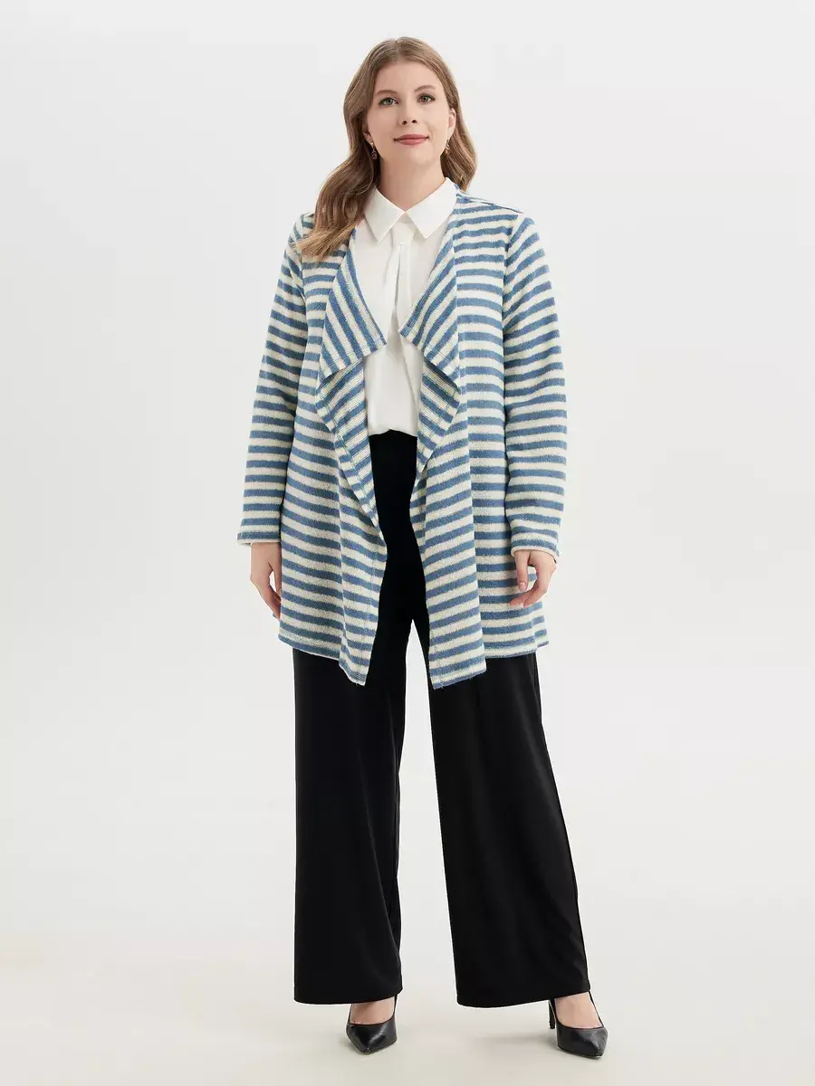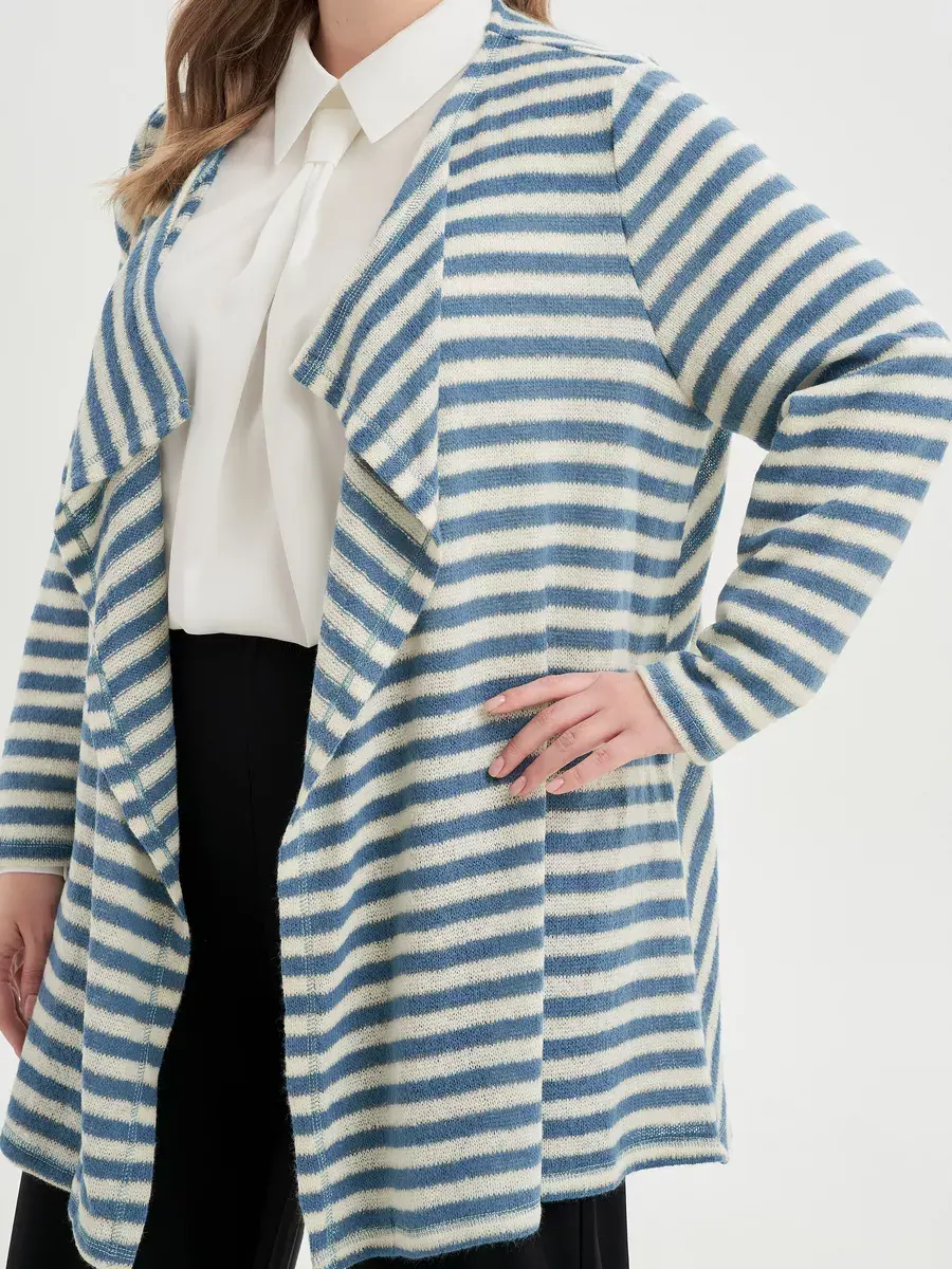 Кардиган женский больших размеров бренда OLSI без карманов. Крой - прямой силуэт. Рукава длинные втачные. Свободный удлиненный силуэт. Вязаный кардиган комфортный и удобный для девушек и женщин. Модель кофточки - оверсайз можно использовать как кимоно на запах, а это значит, что он отлично будет смотреться на любом типе фигуры, даже если вы ищете модный кардиган больших размеров size plus или для беременных и будущих мам. Вязаный и удлиненный фасон женского кардигана имеет не крупную вязку, что делает его особенно нежным и уютным. Теплая кофта белая для женщин сделана с длинным прямым рукавом. Кардиган в меру теплый, так как материал содержит 20% шерсти. Кардиган женский больших размеров идеален для ношения зимой, весной, осенью и даже, как летний вариант, теплый жакет во время вечерних прогулок. Мы решили не делать кардиган в полоску коротким или на пуговицах, чтобы не перегружать и оставить модель легкой, стильной и в то же время подходящей, как одежда для офиса, так и для дома. Вы можете найти нашу модель oversize в категории кардиганы. Осенний офисный и повседневный стиль образ. Жакет женский станет замечательным подарком жене или дочери на любой праздник, такой как 14 февраля или 8 марта.
