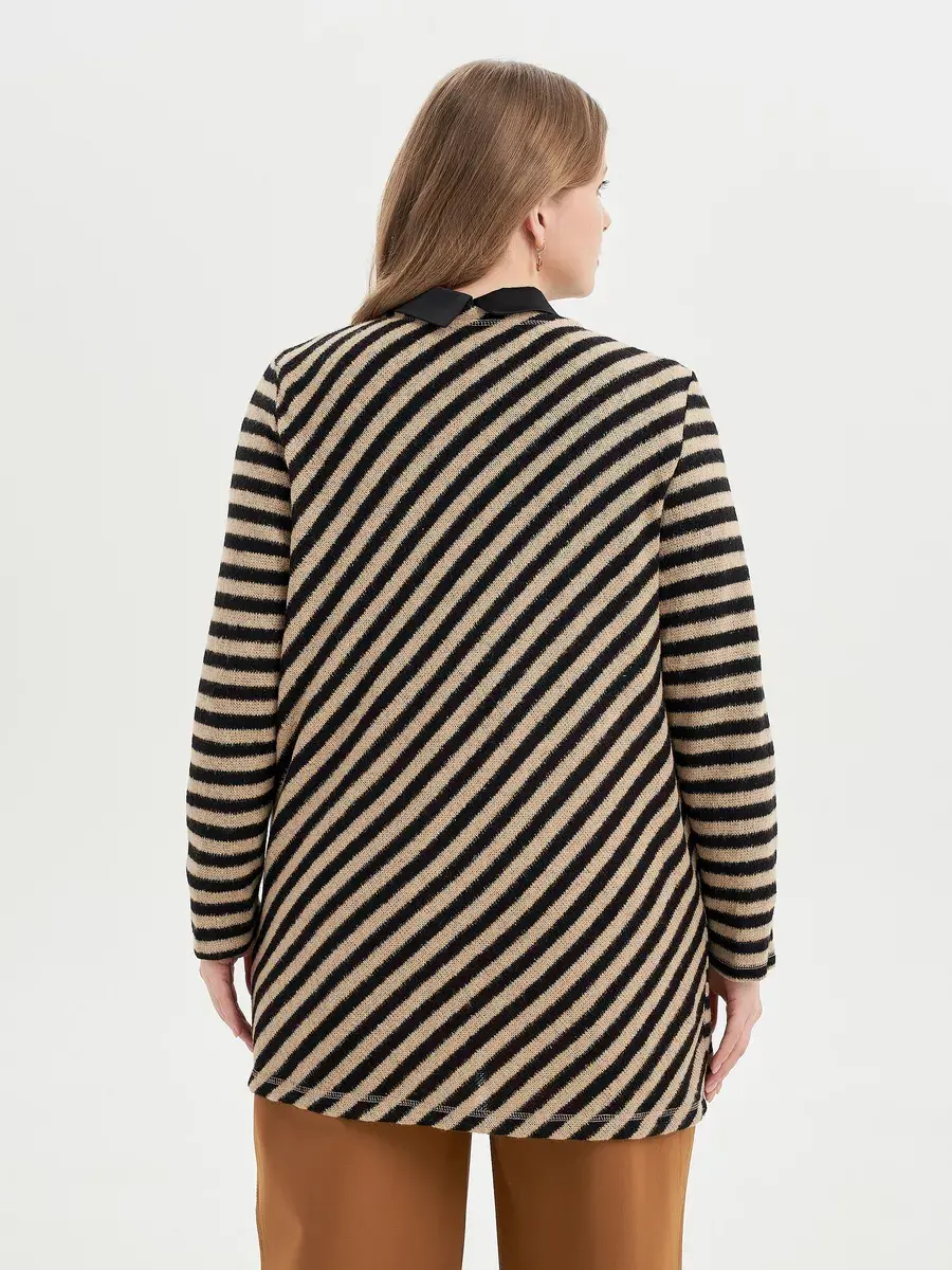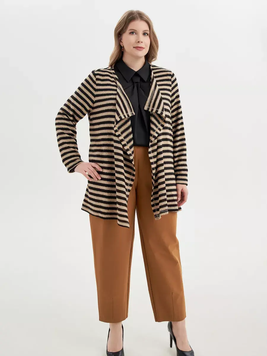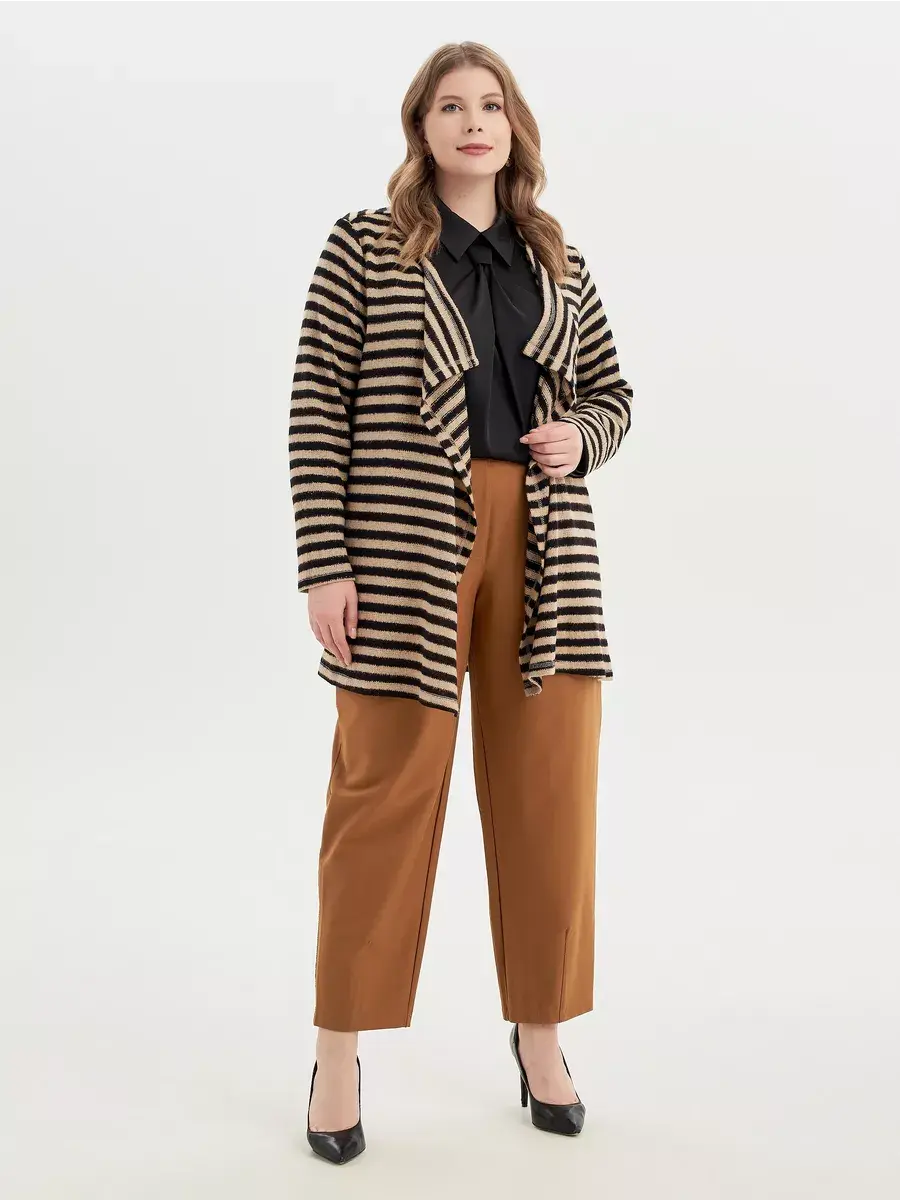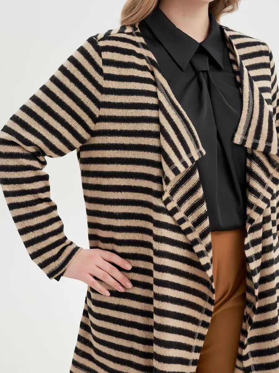 Кардиган женский больших размеров бренда OLSI без карманов. Крой - прямой силуэт. Рукава длинные втачные. Свободный удлиненный силуэт. Вязаный кардиган комфортный и удобный для девушек и женщин. Модель кофточки - оверсайз можно использовать как кимоно на запах, а это значит, что он отлично будет смотреться на любом типе фигуры, даже если вы ищете модный кардиган больших размеров size plus или для беременных и будущих мам. Вязаный и удлиненный фасон женского кардигана имеет не крупную вязку, что делает его особенно нежным и уютным. Теплая кофта белая для женщин сделана с длинным прямым рукавом. Кардиган в меру теплый, так как материал содержит 20% шерсти. Кардиган женский больших размеров идеален для ношения зимой, весной, осенью и даже, как летний вариант, теплый жакет во время вечерних прогулок. Мы решили не делать кардиган в полоску коротким или на пуговицах, чтобы не перегружать и оставить модель легкой, стильной и в то же время подходящей, как одежда для офиса, так и для дома. Вы можете найти нашу модель oversize в категории кардиганы. Осенний офисный и повседневный стиль образ. Жакет женский станет замечательным подарком жене или дочери на любой праздник, такой как 14 февраля или 8 марта.