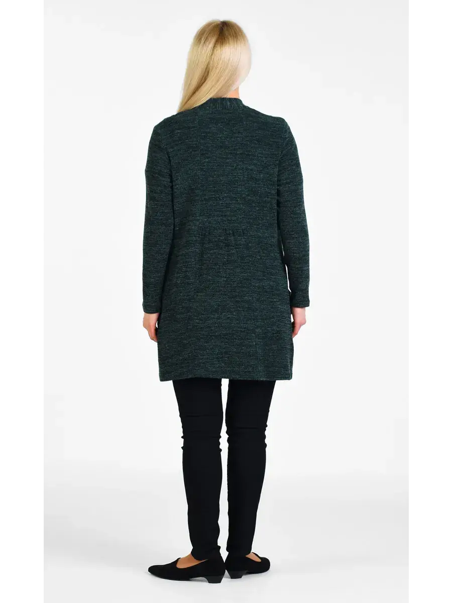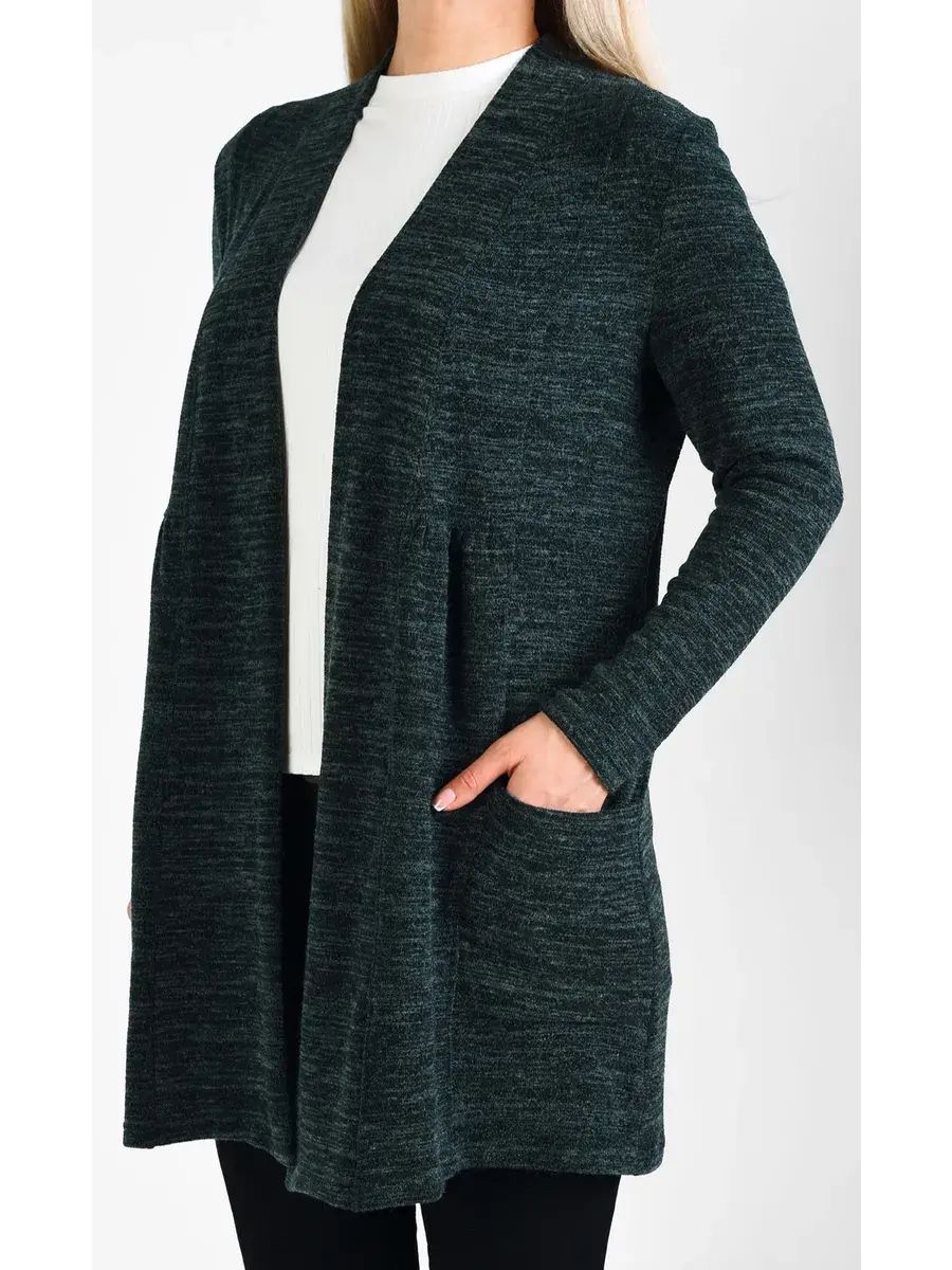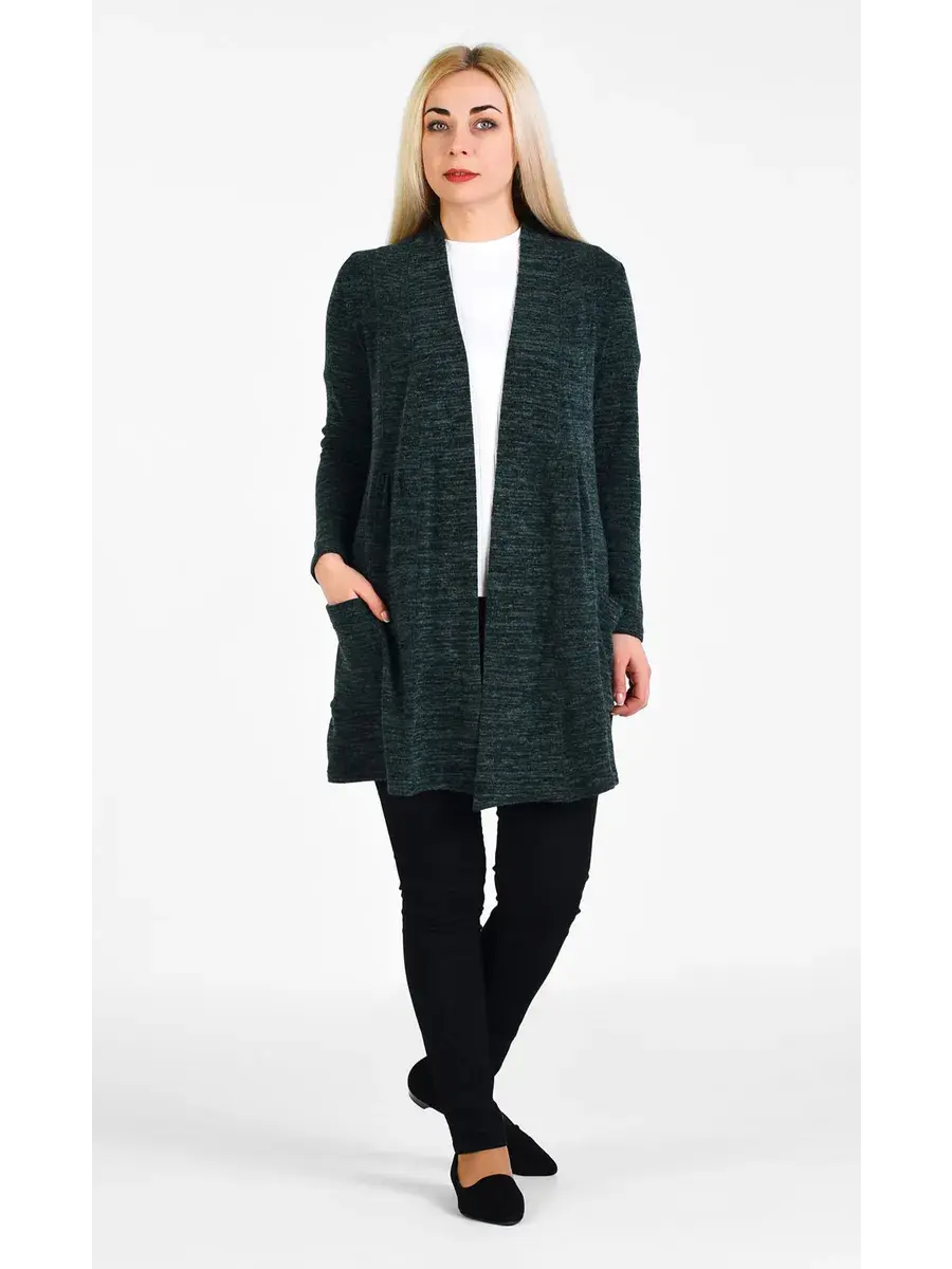 Эффектный удлиненный кардиган от бренда OLSI из нежного мягкого трикотажа-меланж, с длинными втачными рукавами, V-образным вырезом, накладными карманами, без застежки. Модель конструктивно декорирована вертикальными защипами, драпирующими ткань чуть выше линии талии. Длина по спинке в 48 размере 84 см.
