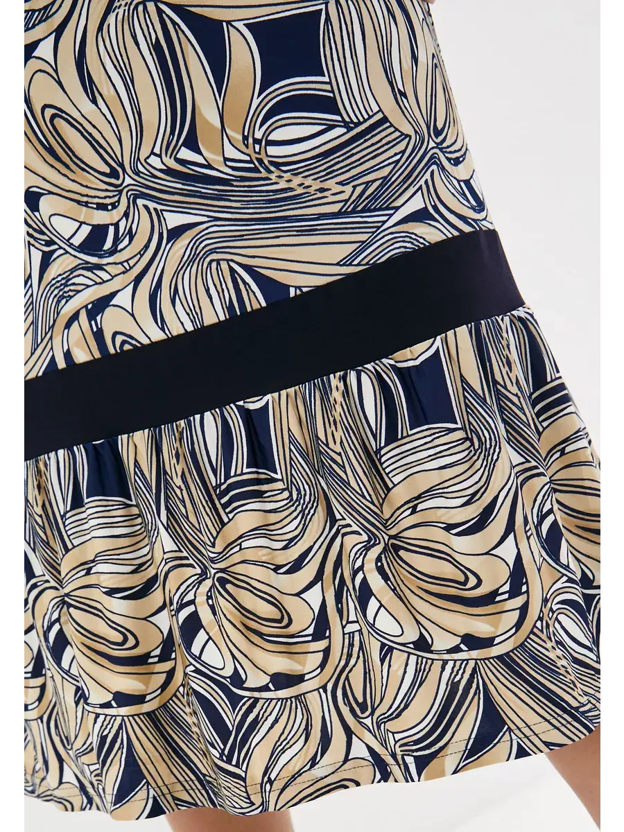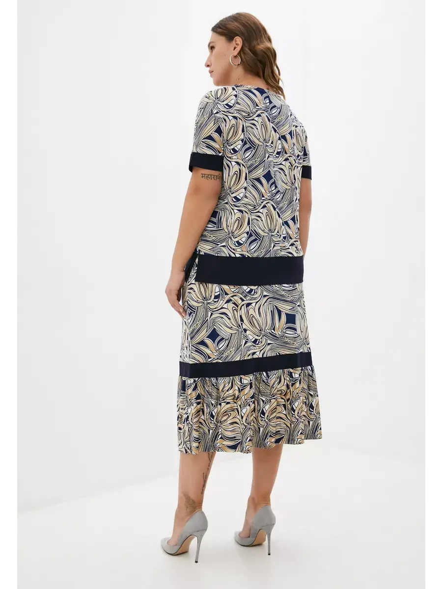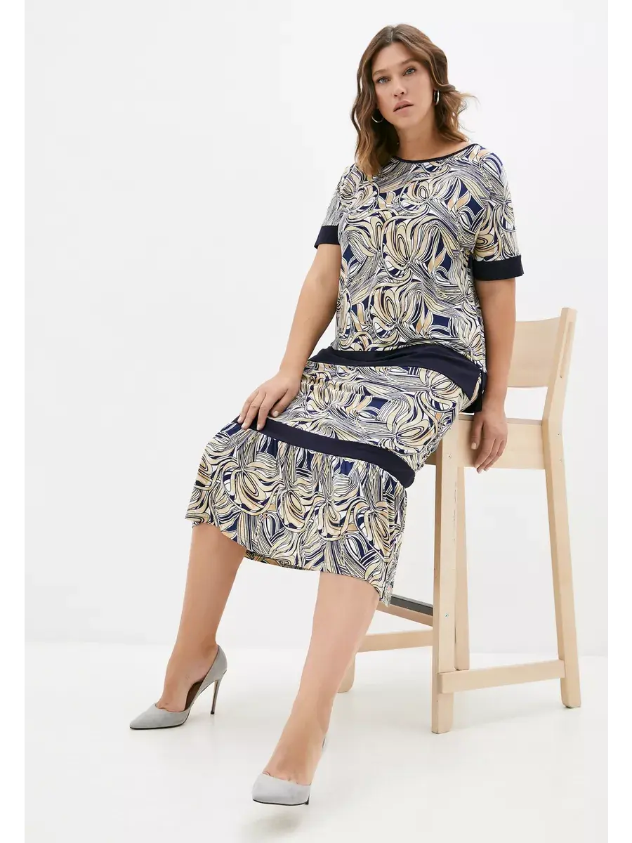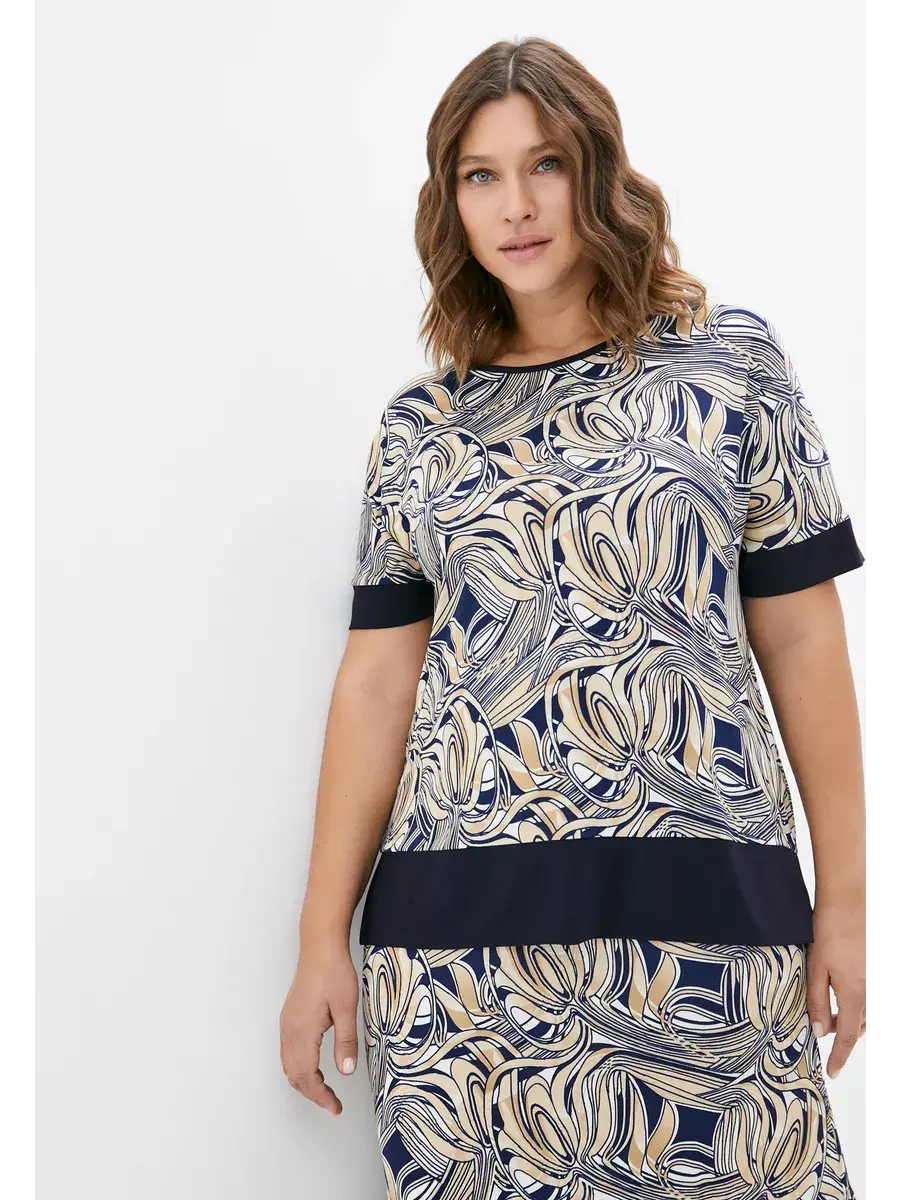 Женский летний комплект большого размера от бренда OLSI, состоит из блузки и юбки. Костюм женский выполнен из трикотажного полотна по типу масло, немнущийся материал, не требует особого деликатного ухода, холодит кожу в жаркую погоду. Блуза фасона футболка, с коротким цельнокроенным рукавом, горловина лодочка. По бокам блузки разрезы. Юбка фасона годе - ярусная средней длины, верх юбки полуоблегающий, низ - расклешеный с фалдами. Юбка без застежки, с резинкой по поясу.