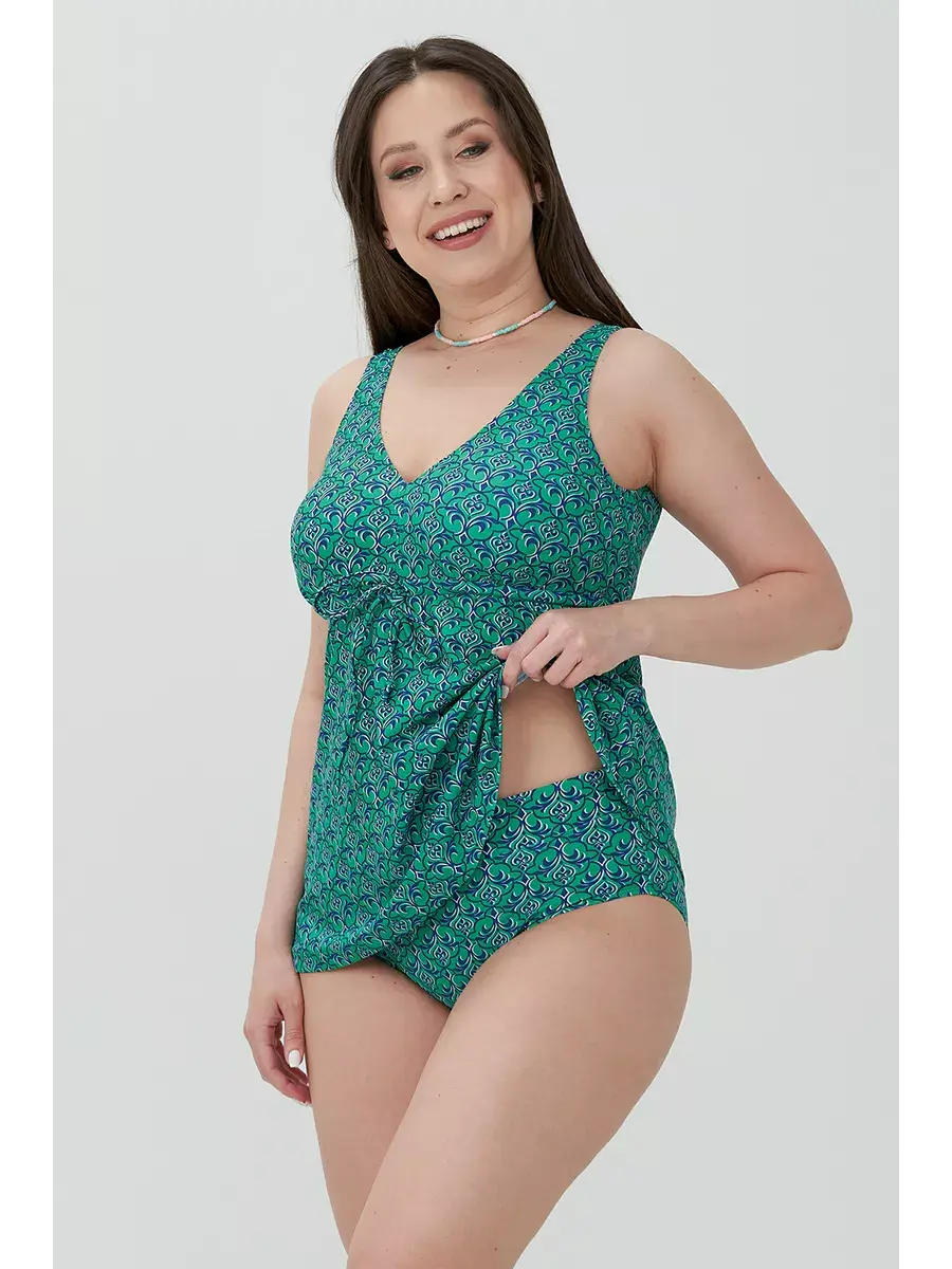 Раздельный купальник танкини большого размера бренда OLSI подойдет для полных и взрослых женщин. Лиф на завязках и с плотной вставкой для поддержки и регулировки объема. Плавки закрытые, на поясе.
