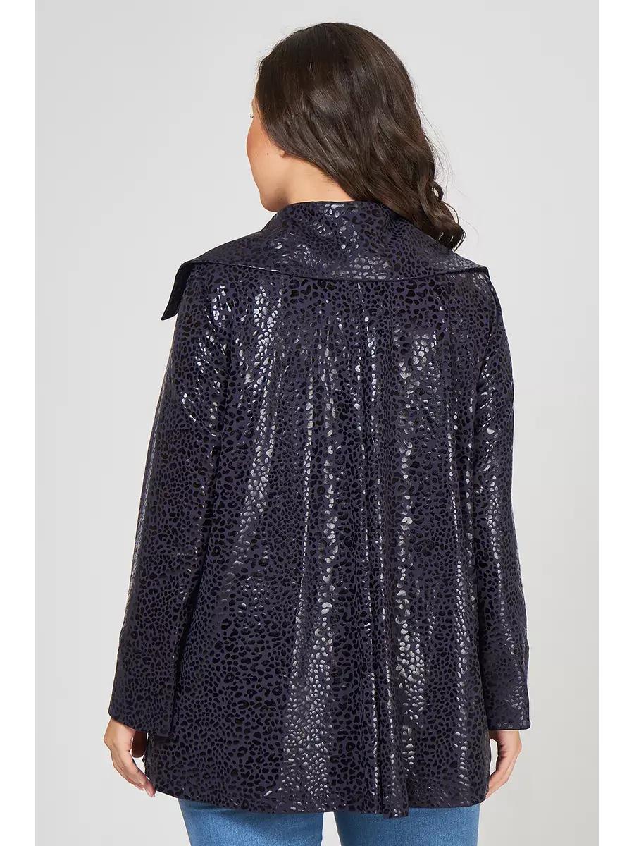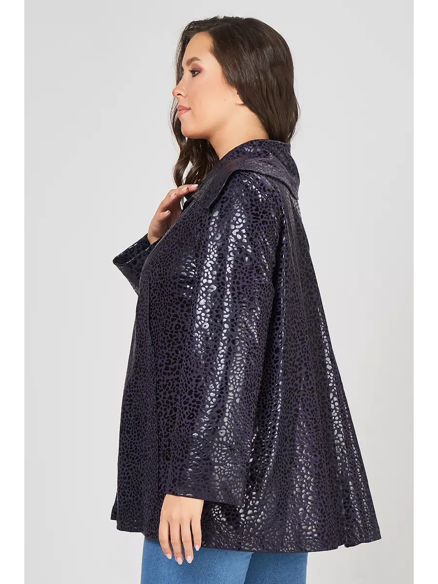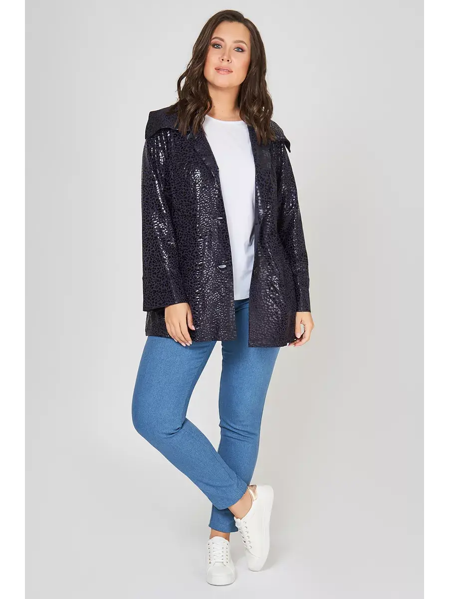 Легкая куртка из ткани масло со стильным принтом-глиттером, напоминающим блеск дождевых капель. Изделие расклешенного A-силуэта, на подкладке; с укороченными рукавами-колокол, с широкими манжетами; V-образной горловиной с широким отложным воротником-апаш (переводится как «хулиган»), застежкой на три пуговицы. Модель прекрасно корректирует линии, уравновешивает силуэт, придает образу женственность, лоск и озорные нотки.