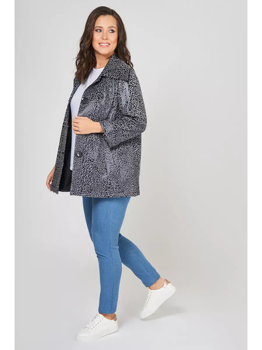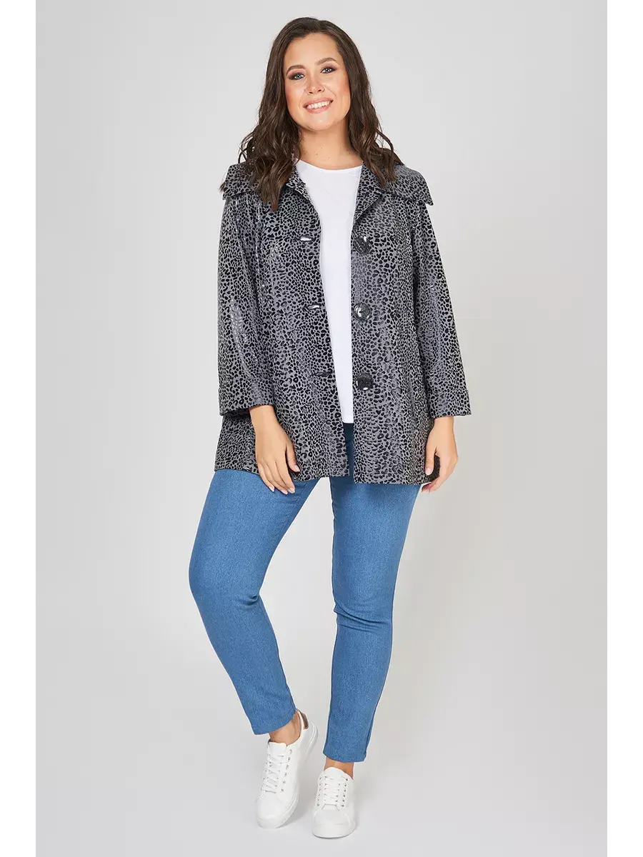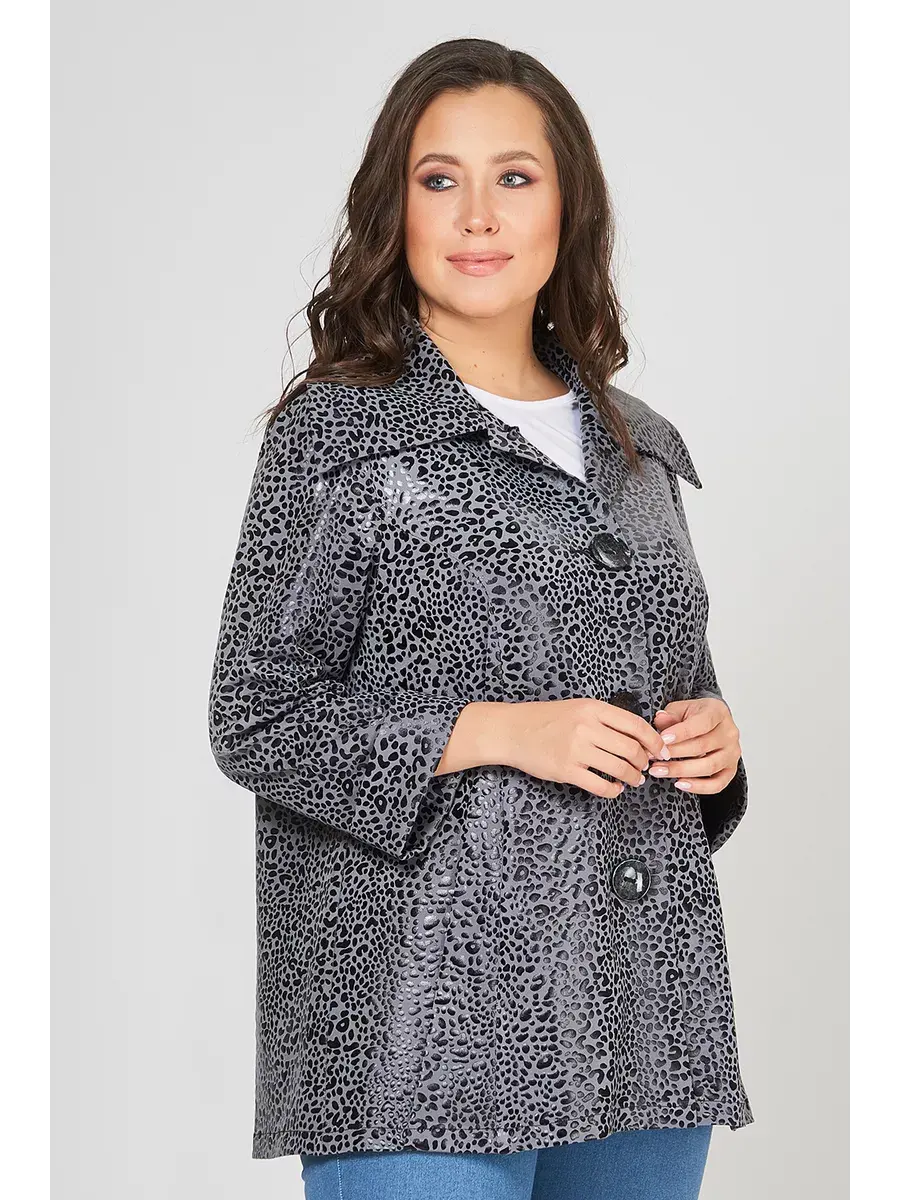 Легкая куртка из ткани масло со стильным принтом-глиттером, напоминающим блеск дождевых капель. Изделие расклешенного A-силуэта, на подкладке; с укороченными рукавами-колокол, с широкими манжетами; V-образной горловиной с широким отложным воротником-апаш (переводится как «хулиган»), застежкой на три пуговицы. Модель прекрасно корректирует линии, уравновешивает силуэт, придает образу женственность, лоск и озорные нотки.