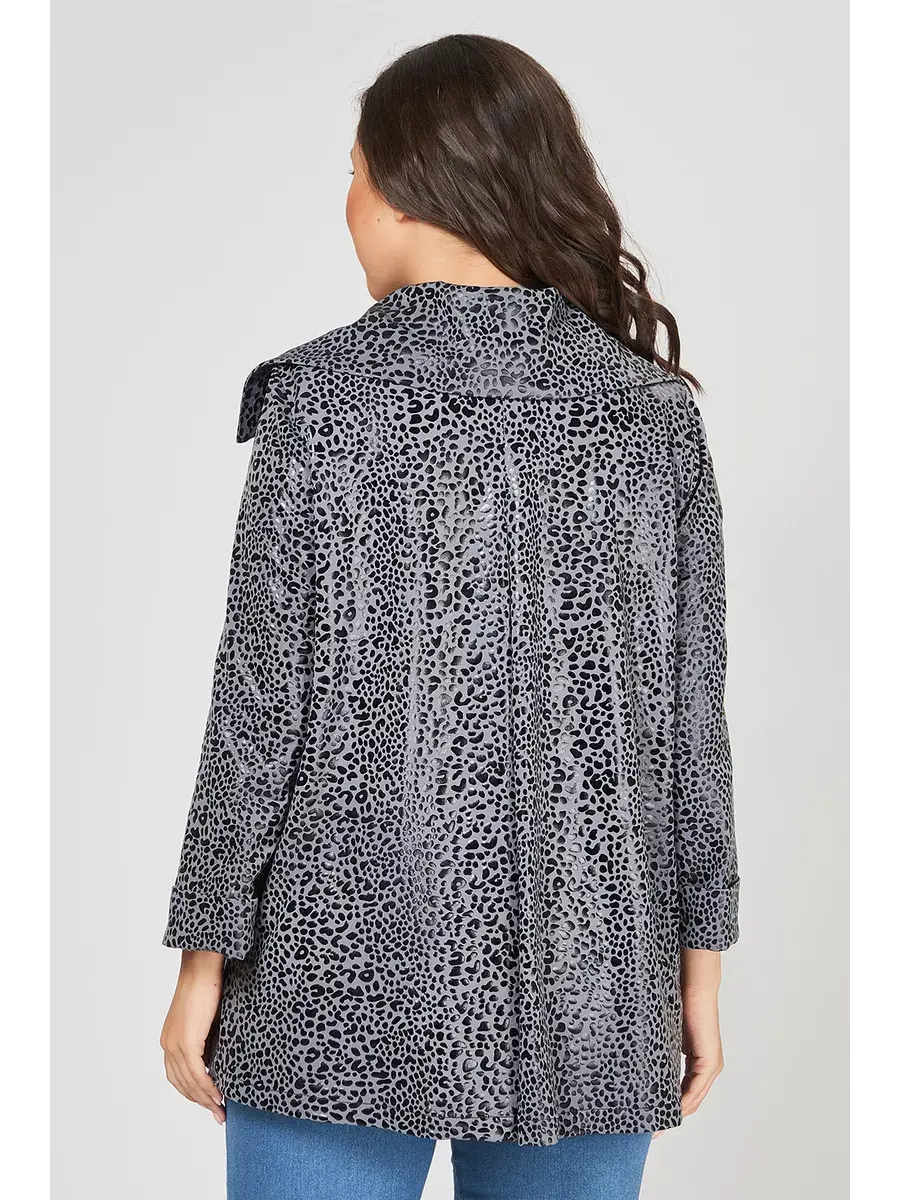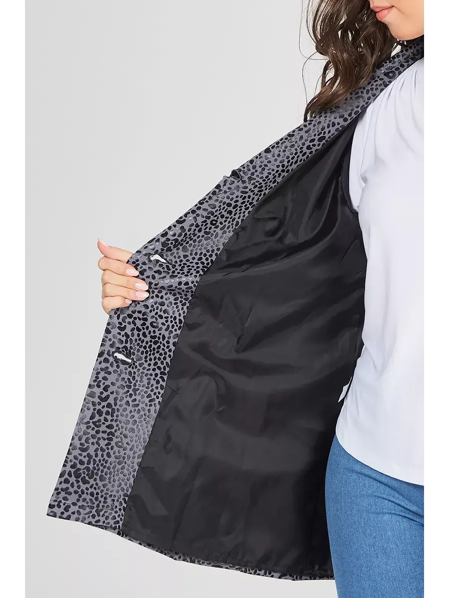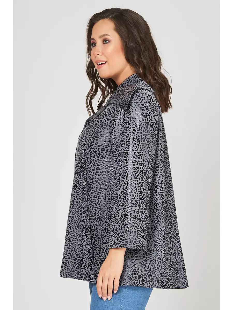 Легкая куртка из ткани масло со стильным принтом-глиттером, напоминающим блеск дождевых капель. Изделие расклешенного A-силуэта, на подкладке; с укороченными рукавами-колокол, с широкими манжетами; V-образной горловиной с широким отложным воротником-апаш (переводится как «хулиган»), застежкой на три пуговицы. Модель прекрасно корректирует линии, уравновешивает силуэт, придает образу женственность, лоск и озорные нотки.