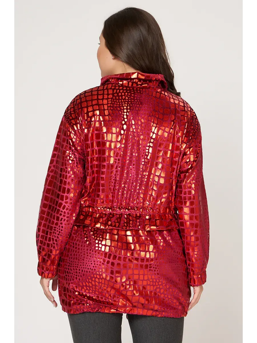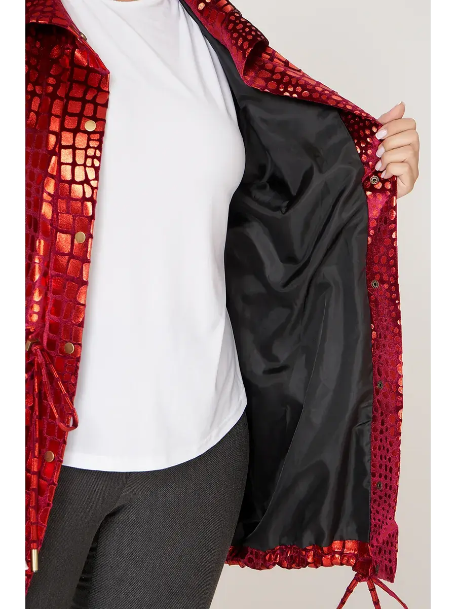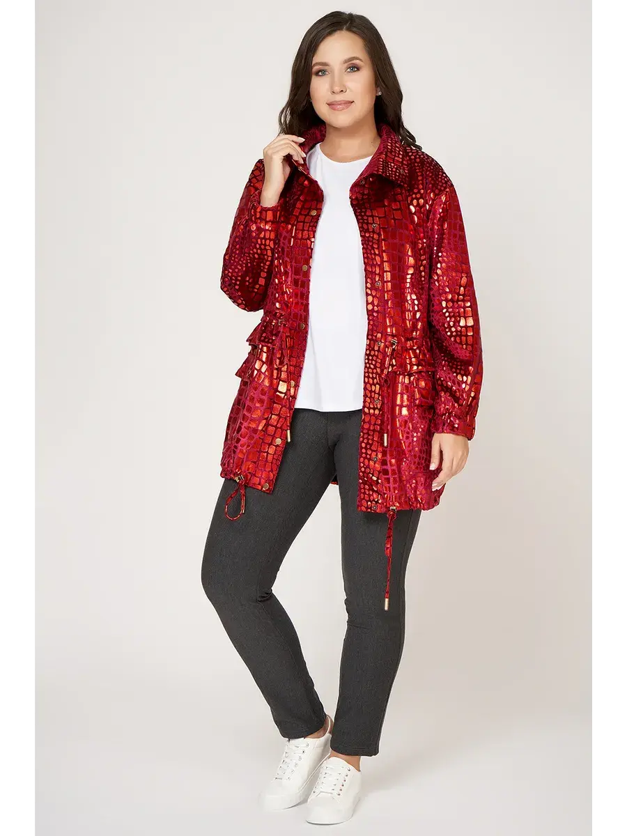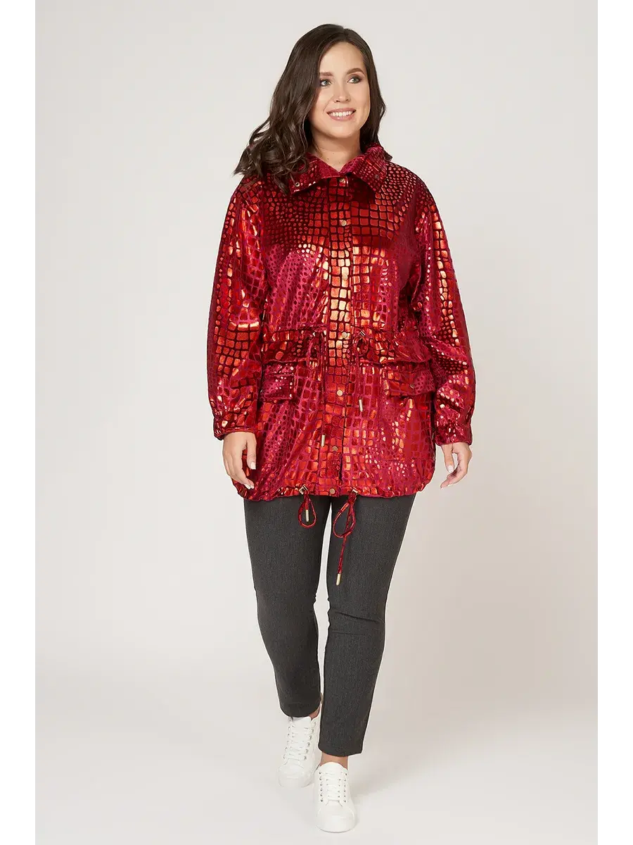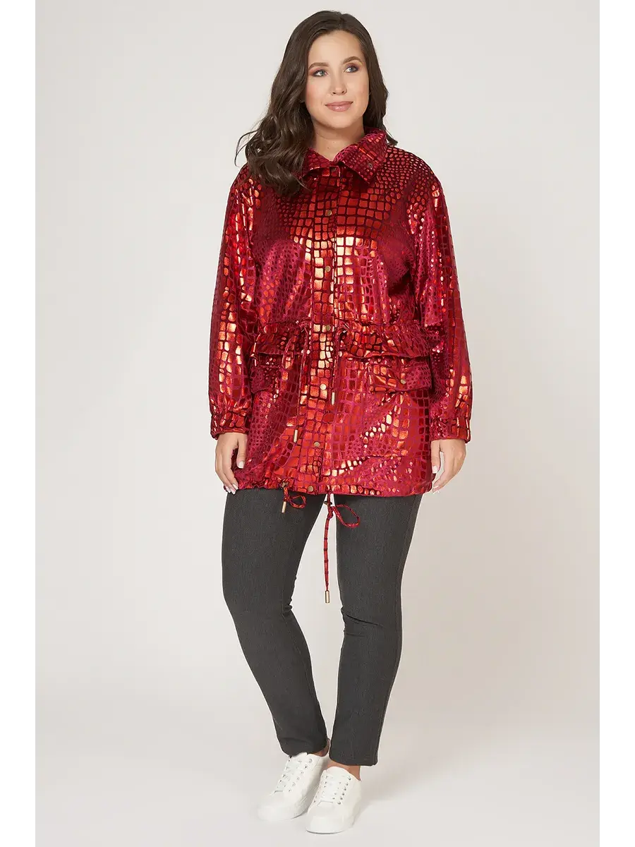 Стильная нарядная куртка-ветровка из перламутровой плотной мерцающей ткани, имитирующей крокодилью кожу, на подкладке. Модель со спущенной проймой, длинными рукавами на манжетах. С застежкой на кнопки до основания воротника-стойки, который можно носить как отложной воротник. По низу и на талии изделие затягивается на завязки, продернутые в кулиску, что вкупе с большими накладными карманами с клапанами придает ему сходство с охотничьей паркой.