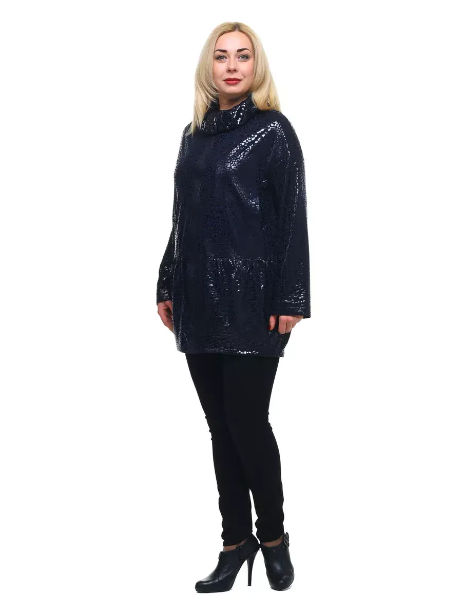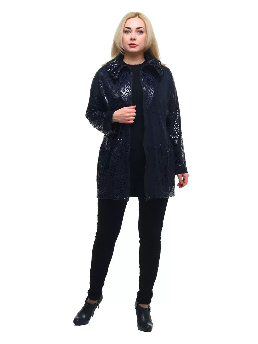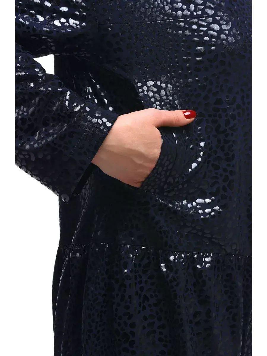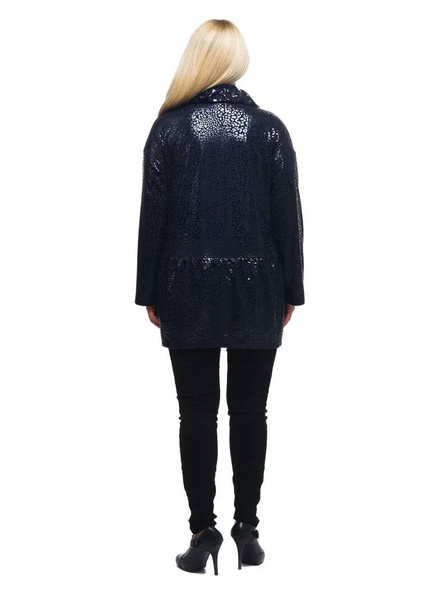 Гламурная удлиненная куртка, выполненная из плотной ткани с мерцающим принтом. Модель на подкладке; с фантазийным воротником стойкой, с откладывающимися уголками, и застежкой молнией до их основания; с втачными рукавами со спущенным плечом; врезными боковыми карманами с листочкой под грудью; отрезная ниже талии, со сборкой, стянутой по низу.