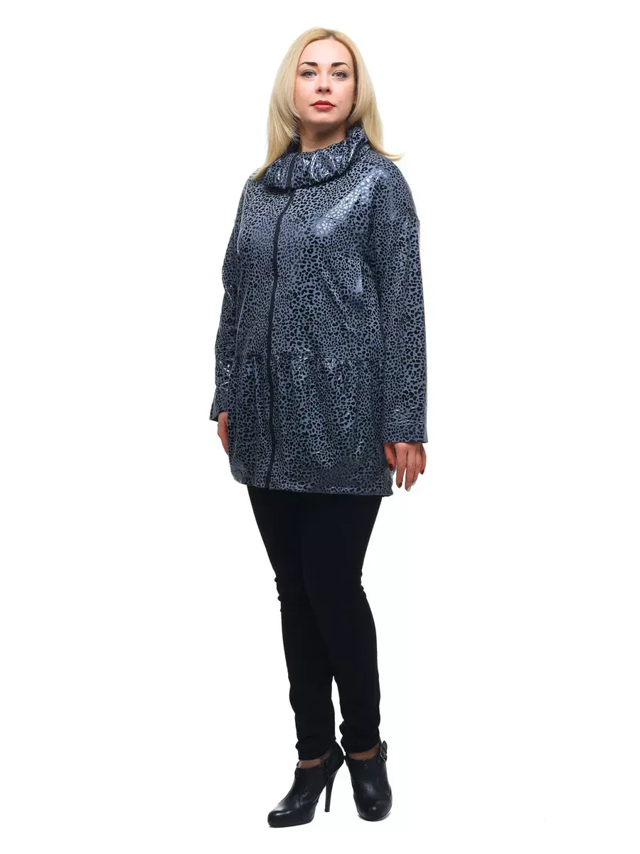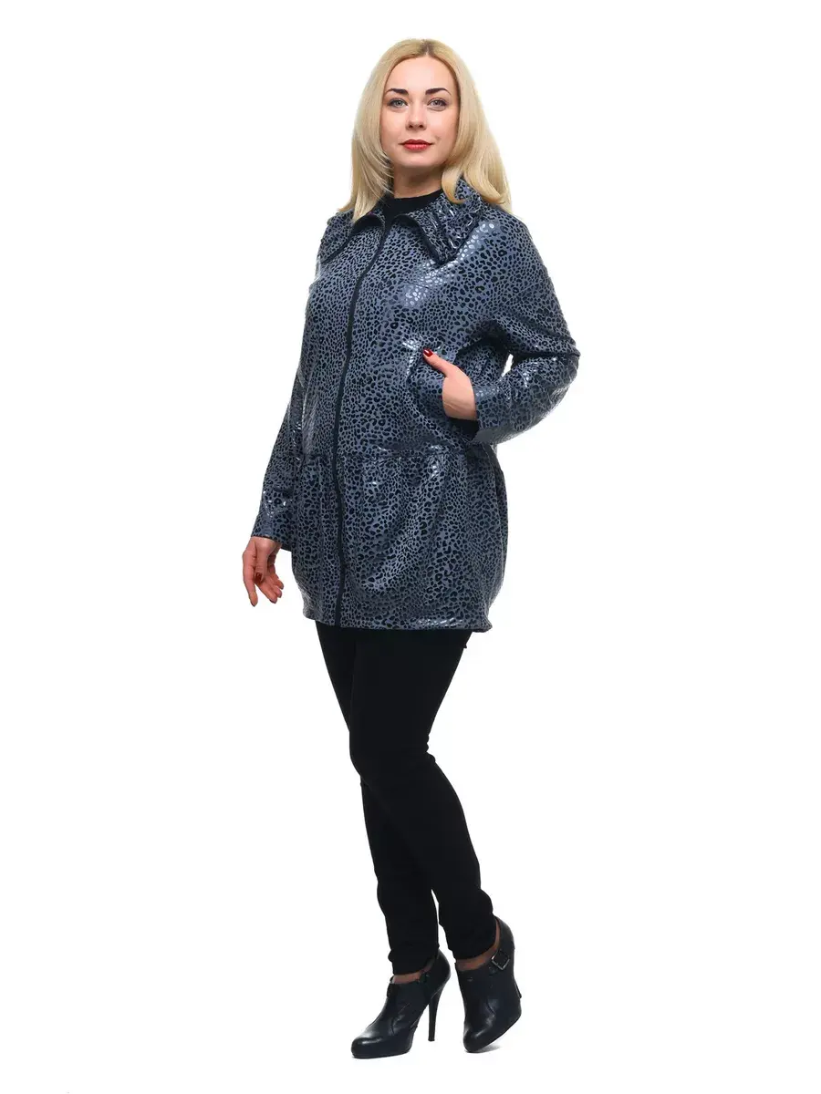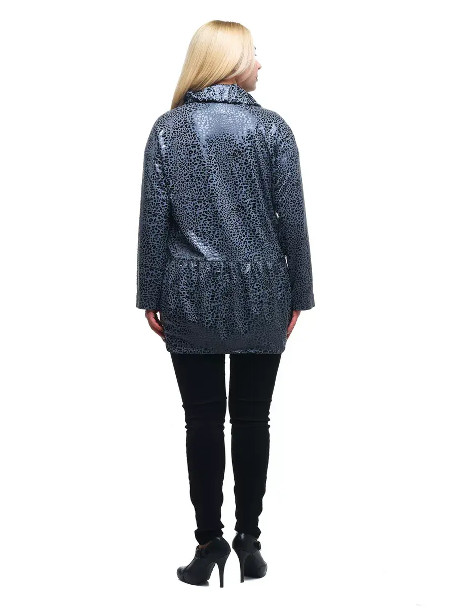Гламурная удлиненная куртка, выполненная из плотной ткани с мерцающим принтом. Модель на подкладке; с фантазийным воротником стойкой, с откладывающимися уголками, и застежкой молнией до их основания; с втачными рукавами со спущенным плечом; врезными боковыми карманами с листочкой под грудью; отрезная ниже талии, со сборкой, стянутой по низу.