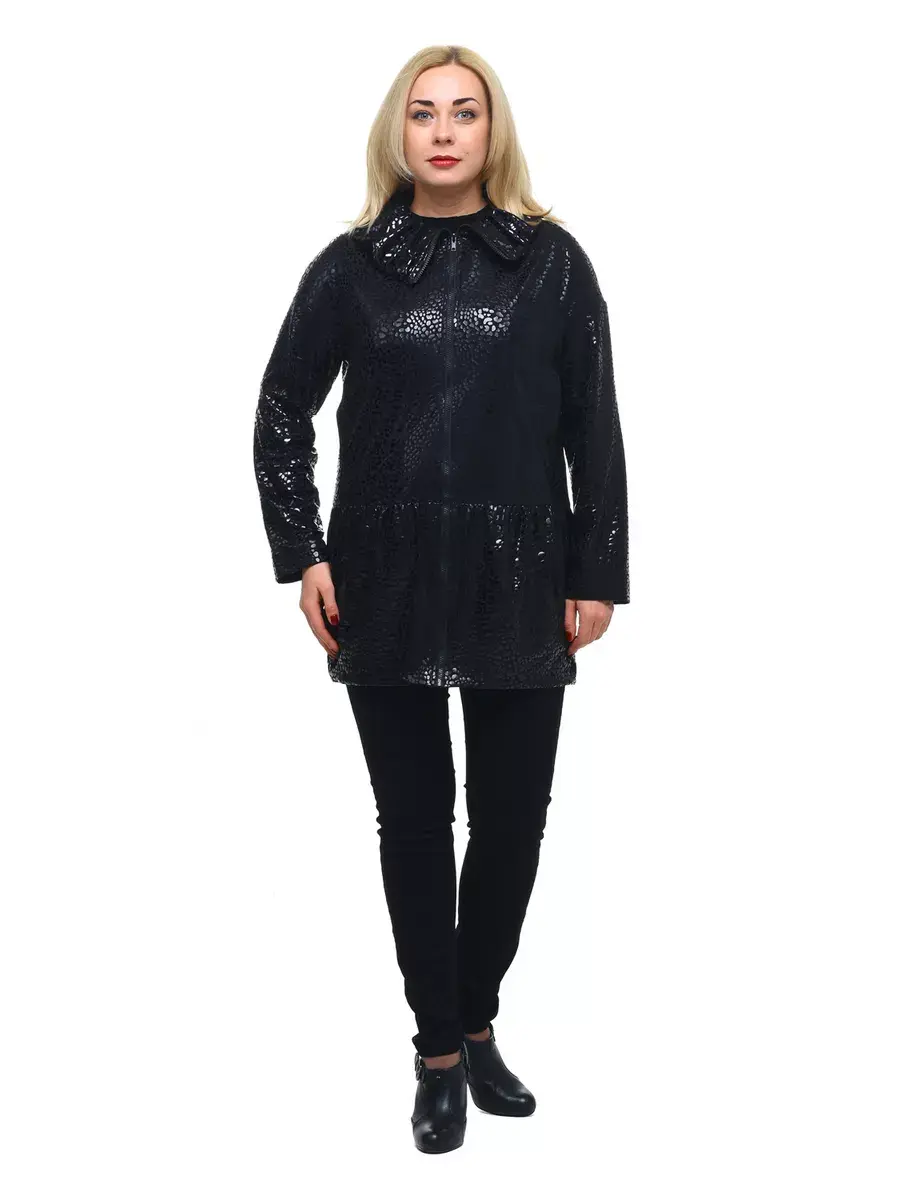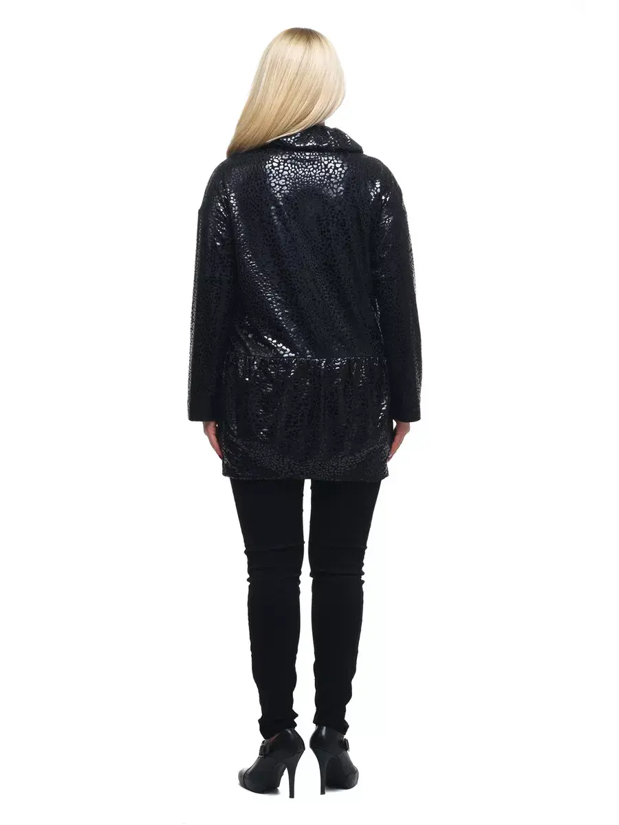 Гламурная удлиненная куртка, выполненная из плотной ткани с мерцающим принтом. Модель на подкладке; с фантазийным воротником стойкой, с откладывающимися уголками, и застежкой молнией до их основания; с втачными рукавами со спущенным плечом; врезными боковыми карманами с листочкой под грудью; отрезная ниже талии, со сборкой, стянутой по низу.