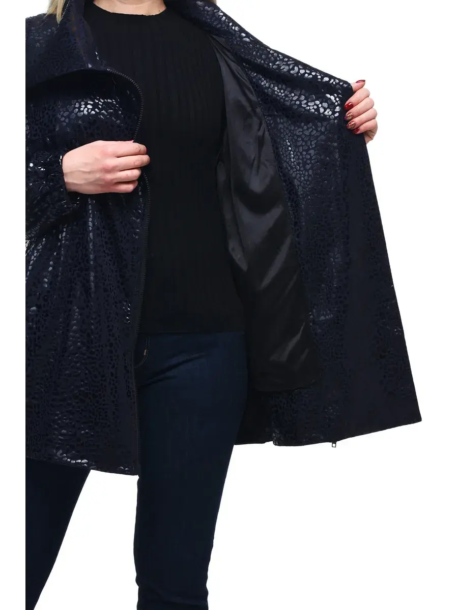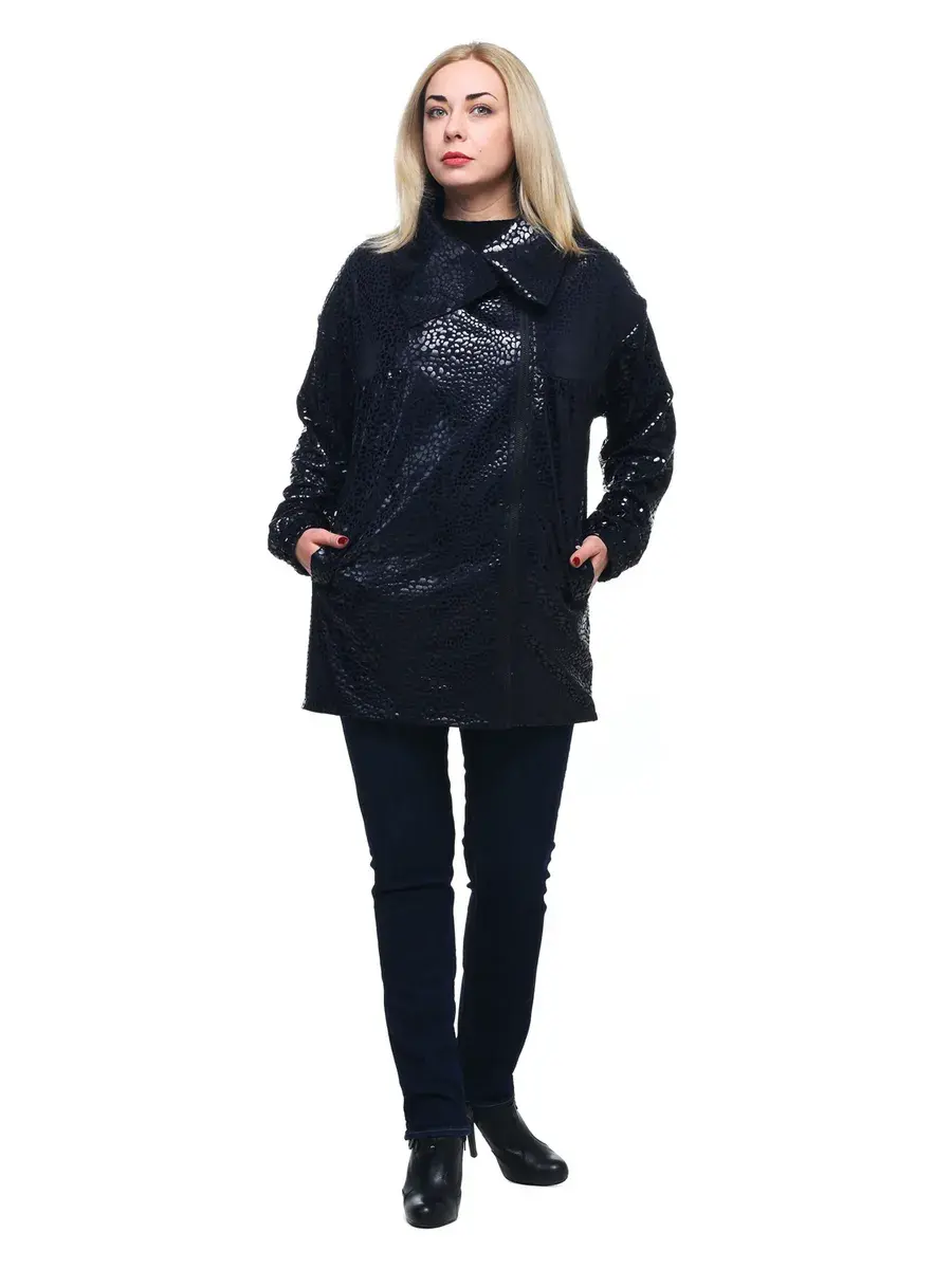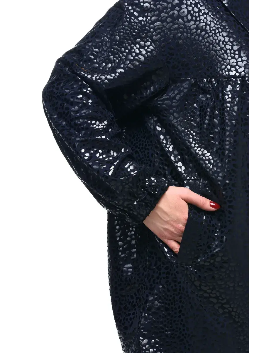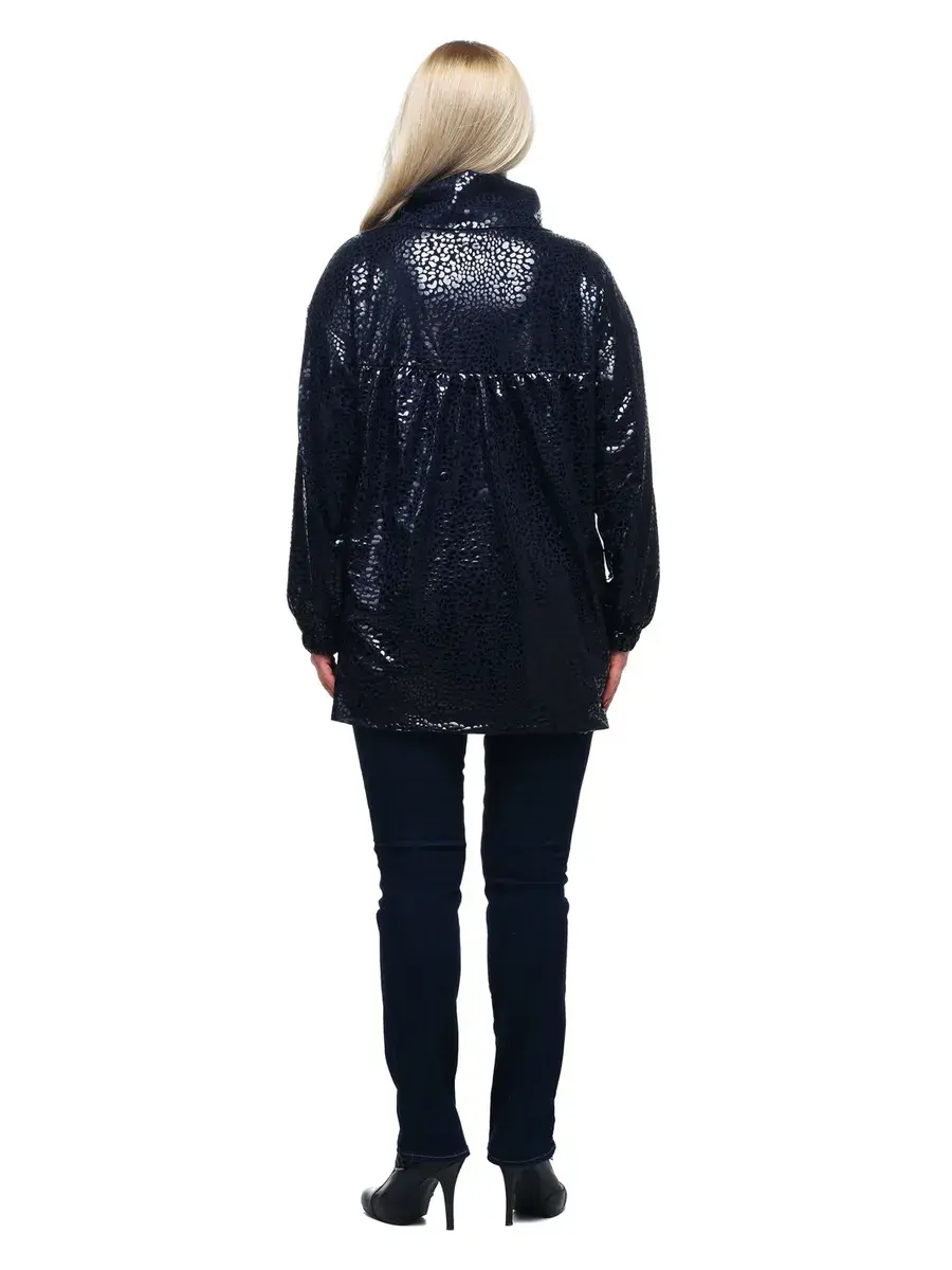 Элегантная удлиненная куртка из плотной ткани с рельефным мерцающим принтом фойлом, с эффектом капель дождя. Модель на подкладке; свободного кроя; с косой застежкой-молнией; втачными рукавами со спущенным плечом; с манжетами на резинке; боковыми карманами с листочкой; с фантазийным воротником стойкой с отложными углами.