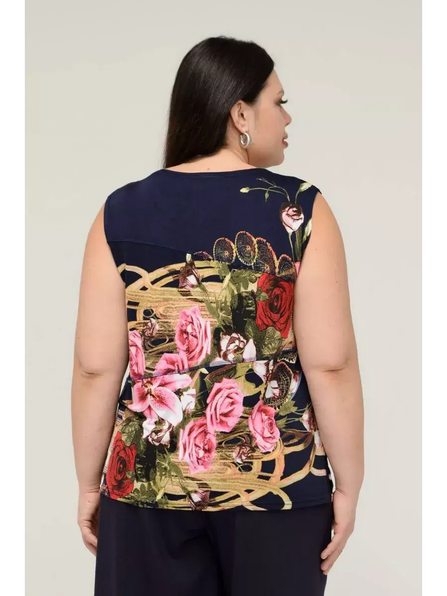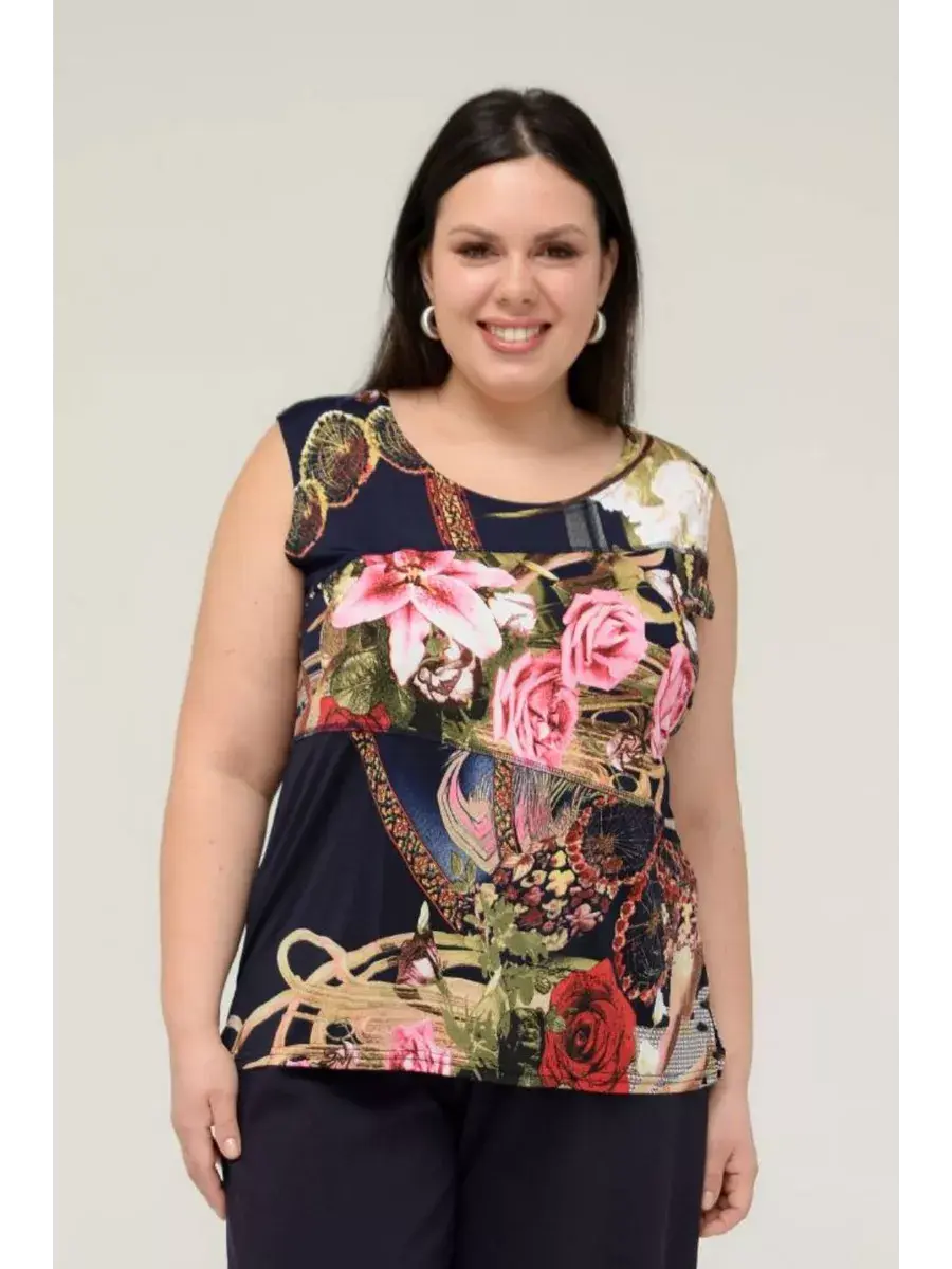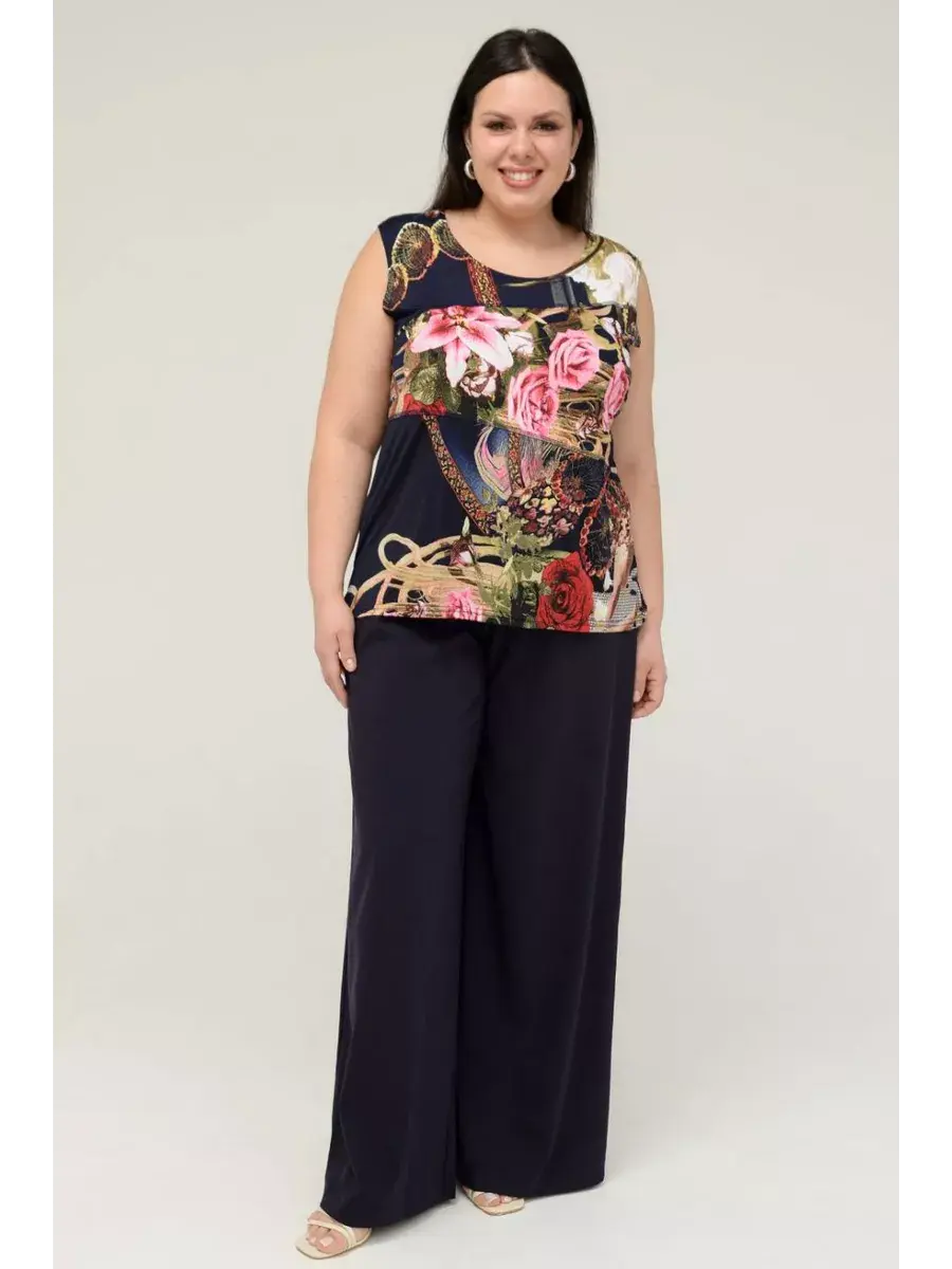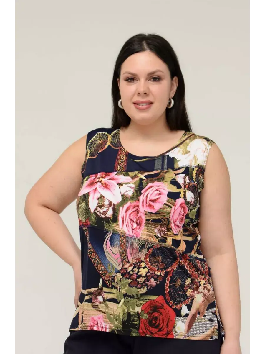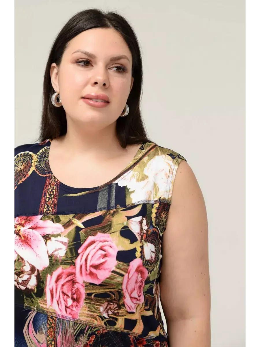 Блузка топ трикотаж масло летняя от OLSI - это идеальный выбор для жарких летних дней. Эта яркая и стильная майка выполнена из гладкого трикотажа с добавлением эластана, что обеспечивает комфорт и свободу движений. Блузка без рукавов с оригинальным принтом в виде цветов и растений станет прекрасным дополнением к любому летнему образу. Модель без застежки, с удобной посадкой для невысоких девушек, подходит для повседневной носки и прекрасно смотрится как на отдыхе, так и в городе. Блузка из коллекции OLSI создана специально для больших размеров, обеспечивая идеальную посадку и комфорт. Легкий и приятный к телу материал не мнется, что делает ее идеальной для путешествий и активного отдыха.