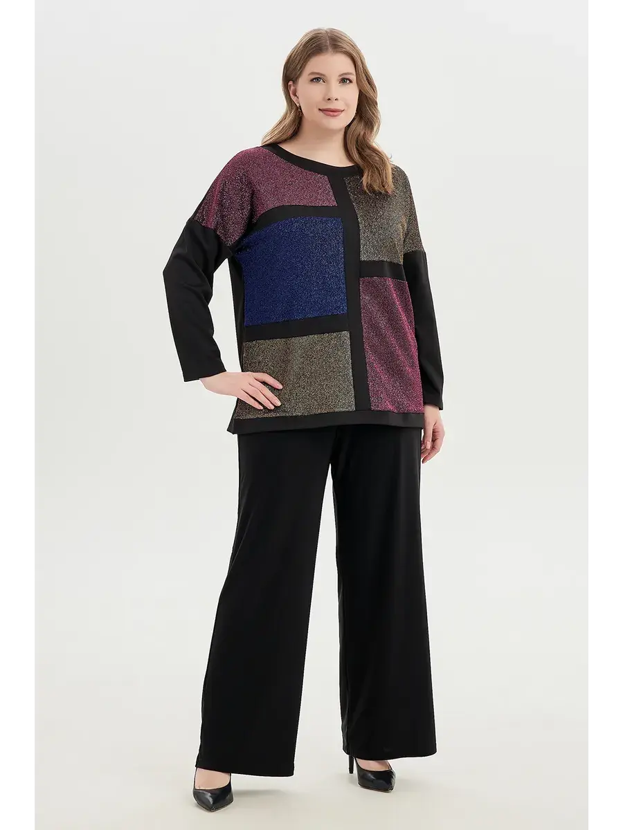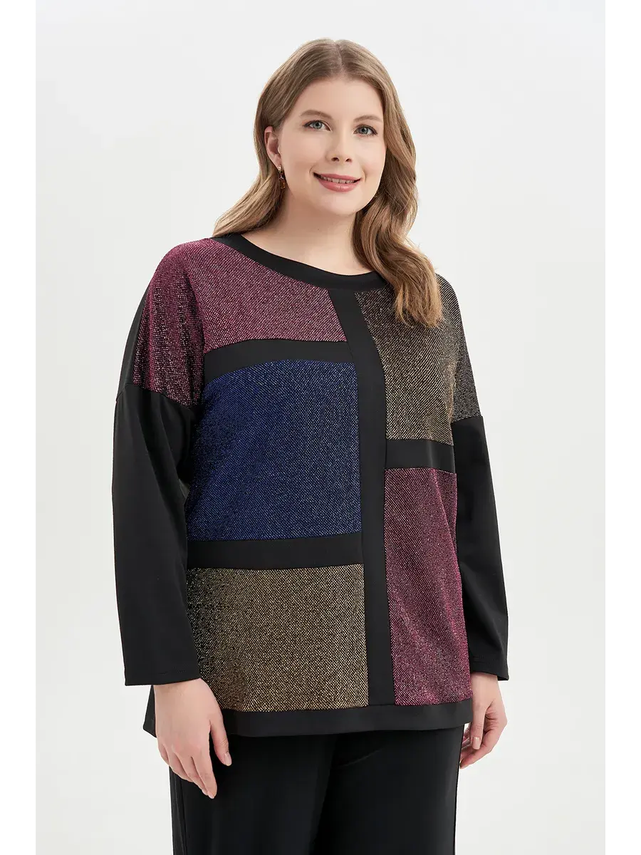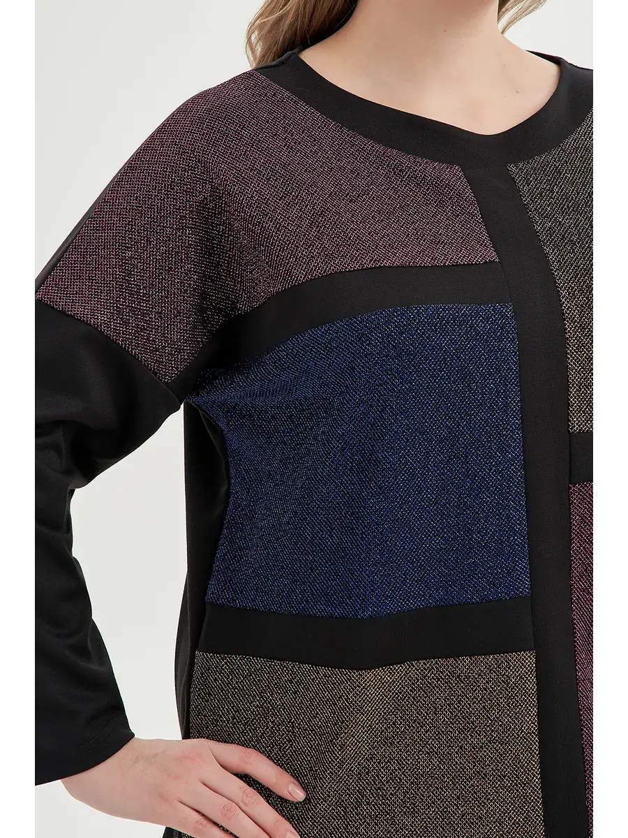 Женская туника бренда OLSI свободного силуэта и длиной до середины бедра станет идеальным выбором для обладательниц пышных форм. Эффектная туника, выполненная из комбинации матового и блестящего с люрексом трикотажа аналоговой цветовой палитры. Модель прямого кроя, с отрезными длинными рукавами со спущенной проймой, цветом и фактурой перекликающимися со спинкой, отделкой горловины с округлым вырезом и вставками спереди изделия, образующими линии геометрического рисунка. Туника визуально уравновешивает пропорции. Придает образу сдержанный нарядный вид.