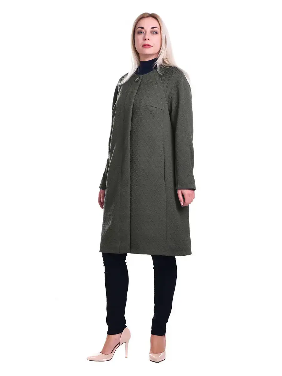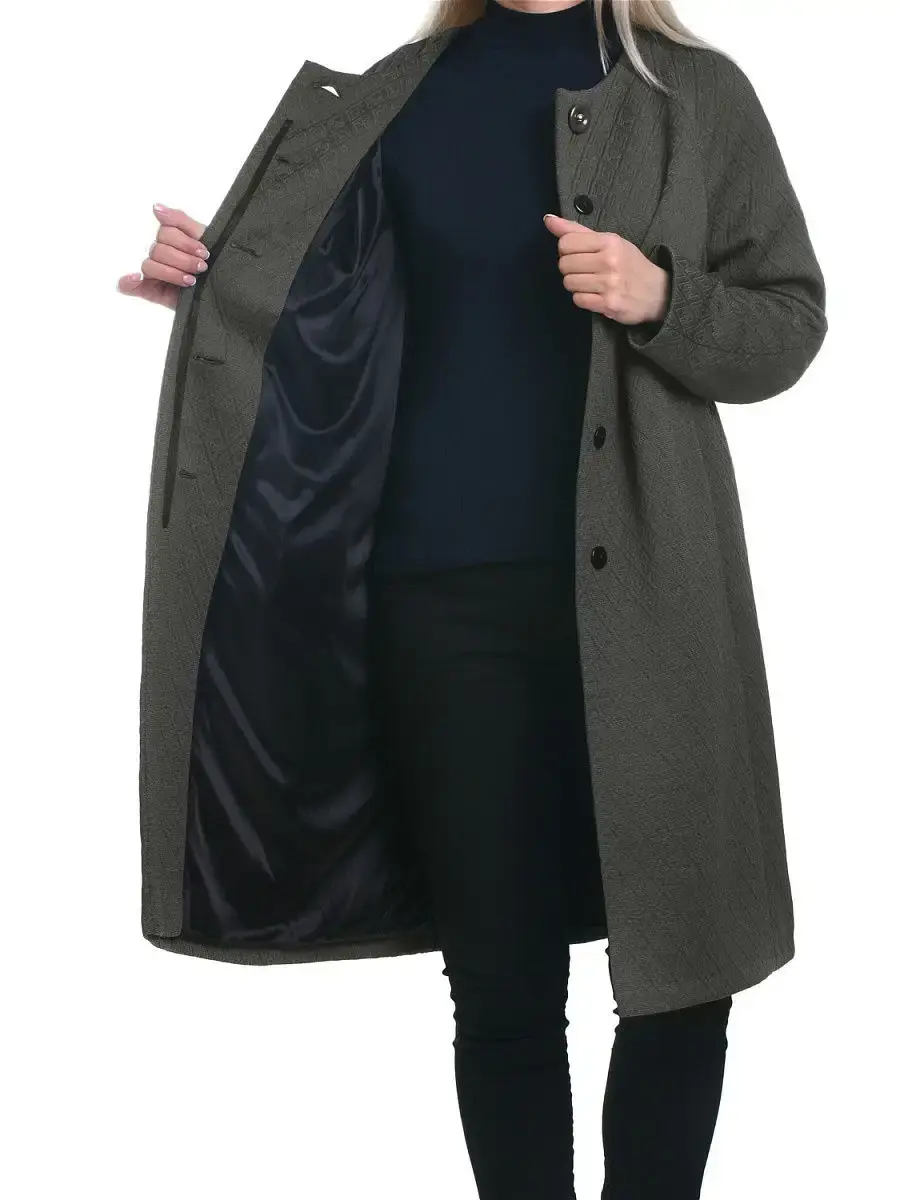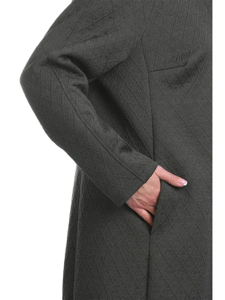 Элегантное пальто едва обозначенного A-силуэта, из ткани с рельефным принтом-ромбик, длиной чуть ниже колена, рукавами-реглан, с потайной супатной застежкой на планке, округлым вырезом горловины, декорированным крупной пуговицей.