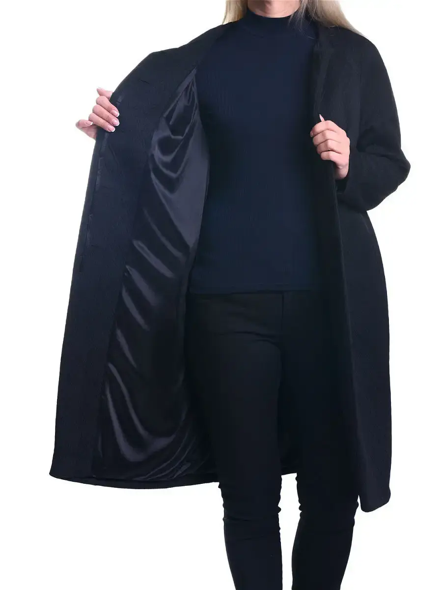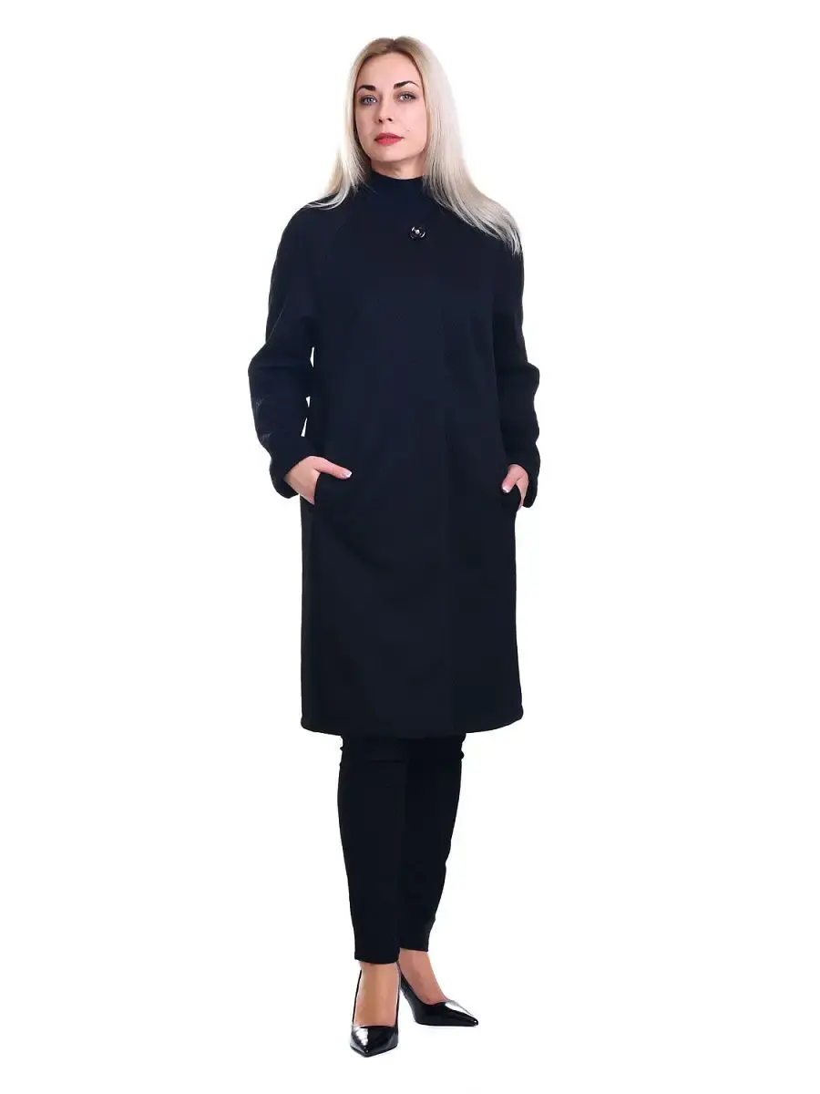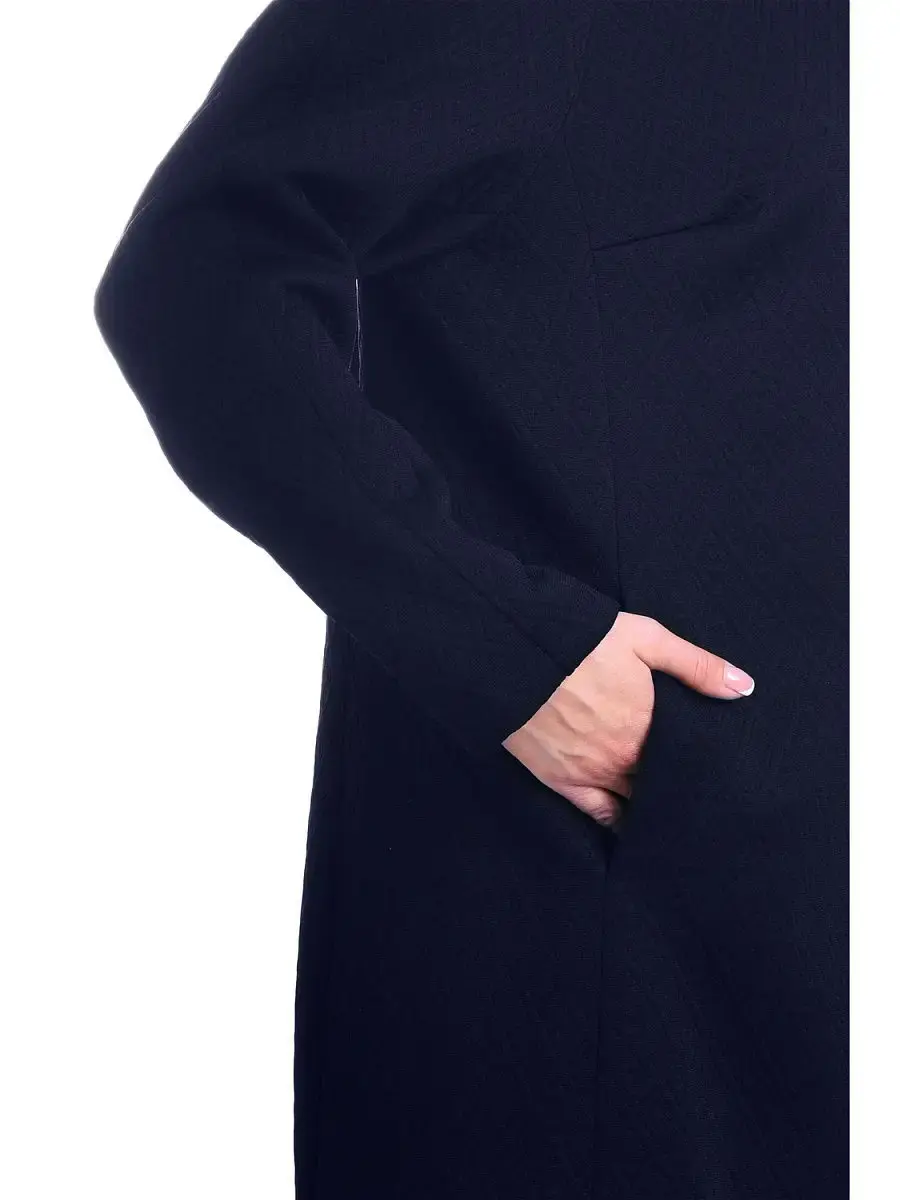 Элегантное пальто едва обозначенного A-силуэта, из ткани с рельефным принтом-ромбик, длиной чуть ниже колена, рукавами-реглан, с потайной супатной застежкой на планке, округлым вырезом горловины, декорированным крупной пуговицей.
