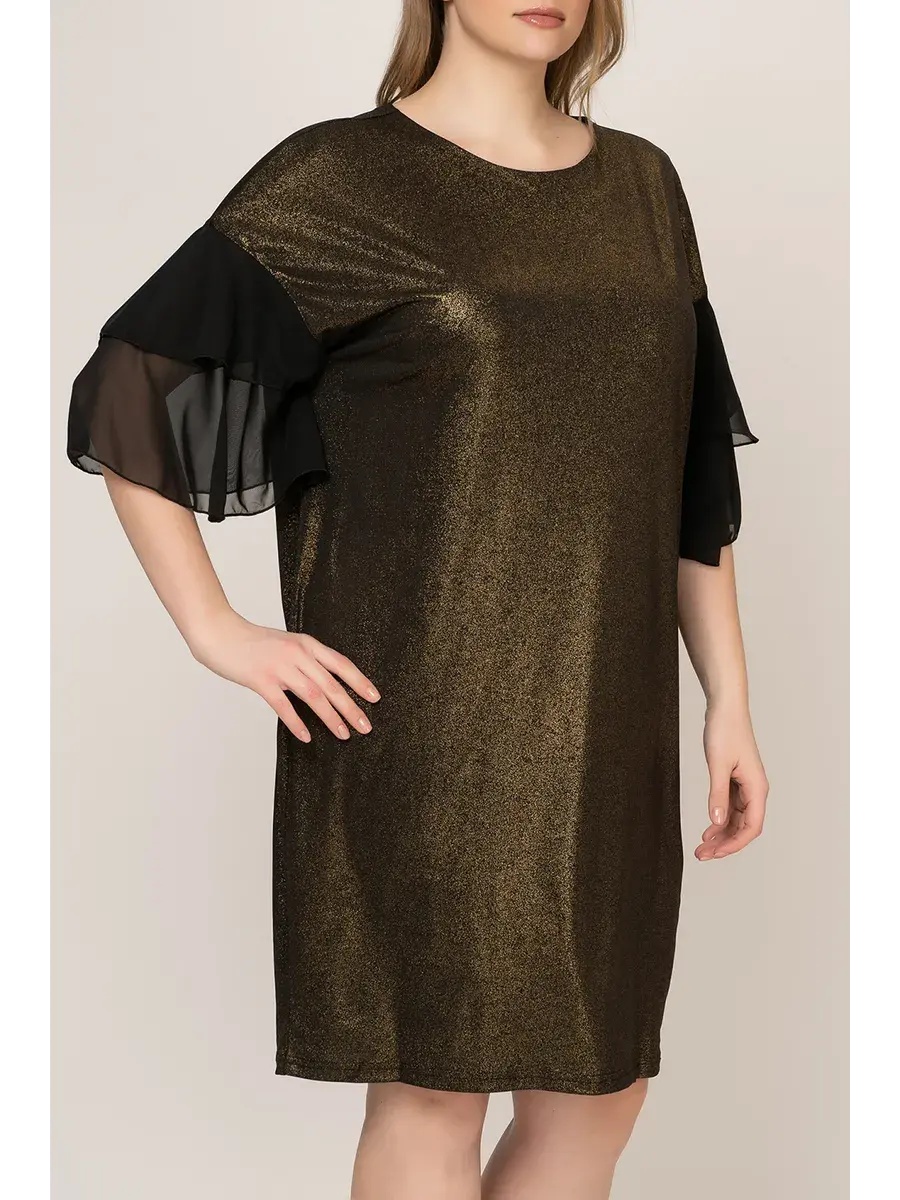 Нарядное платье женское больших размеров длиной до колен, выполненное в комбинации блестящей и матовой полупрозрачной ткани. Модель с круглым вырезом горловины; эффектными рукавами - двойными воланами 3/4, со спущенной проймой. Изделие заужено книзу, благодаря чему фигура выглядит изящнее, свободный крой маскирует особенности фигуры.