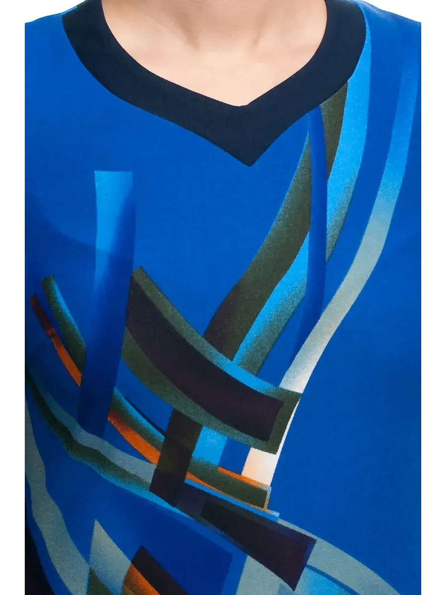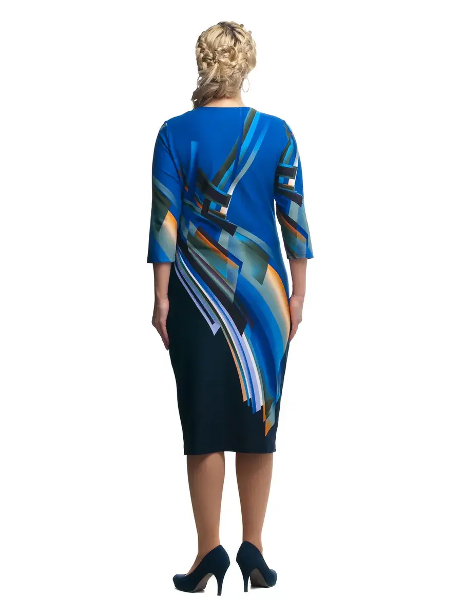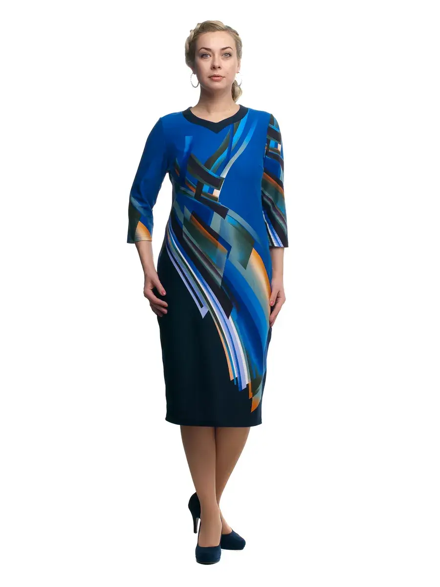 Стильное платье длиной до середины голени, из тонкого эластичного трикотажа с эффектным геометрическим принтом. Модель полуприталенного кроя; зауженная книзу; с V- образным вырезом горловины; втачными узкими рукавами 3/4. Акцентный вектор принта утягивает силуэт, придает ему изящество; выигрышно обрисовывает линию бедер, визуально сужает талию. Изделие подойдет утонченным натурам. Прекрасный вариант как для офиса, так и для любого светского мероприятия.