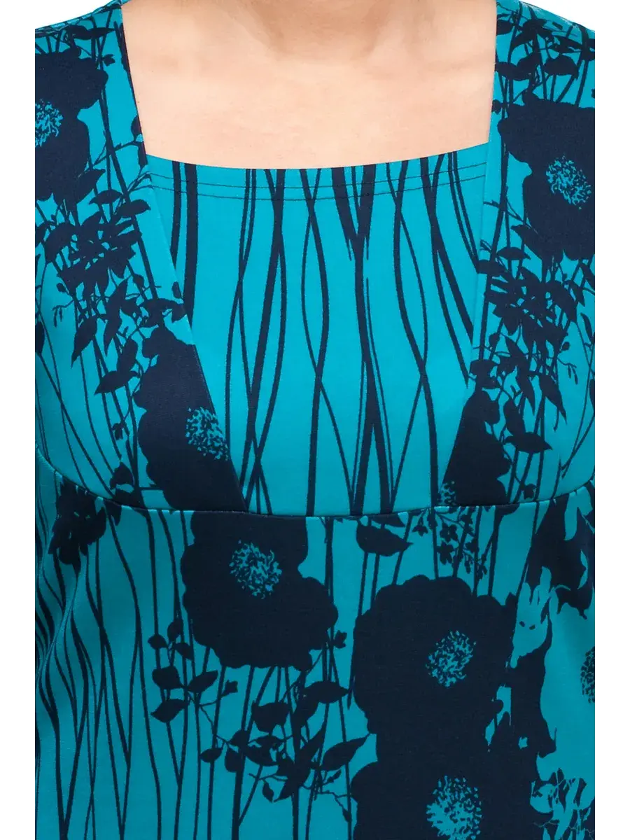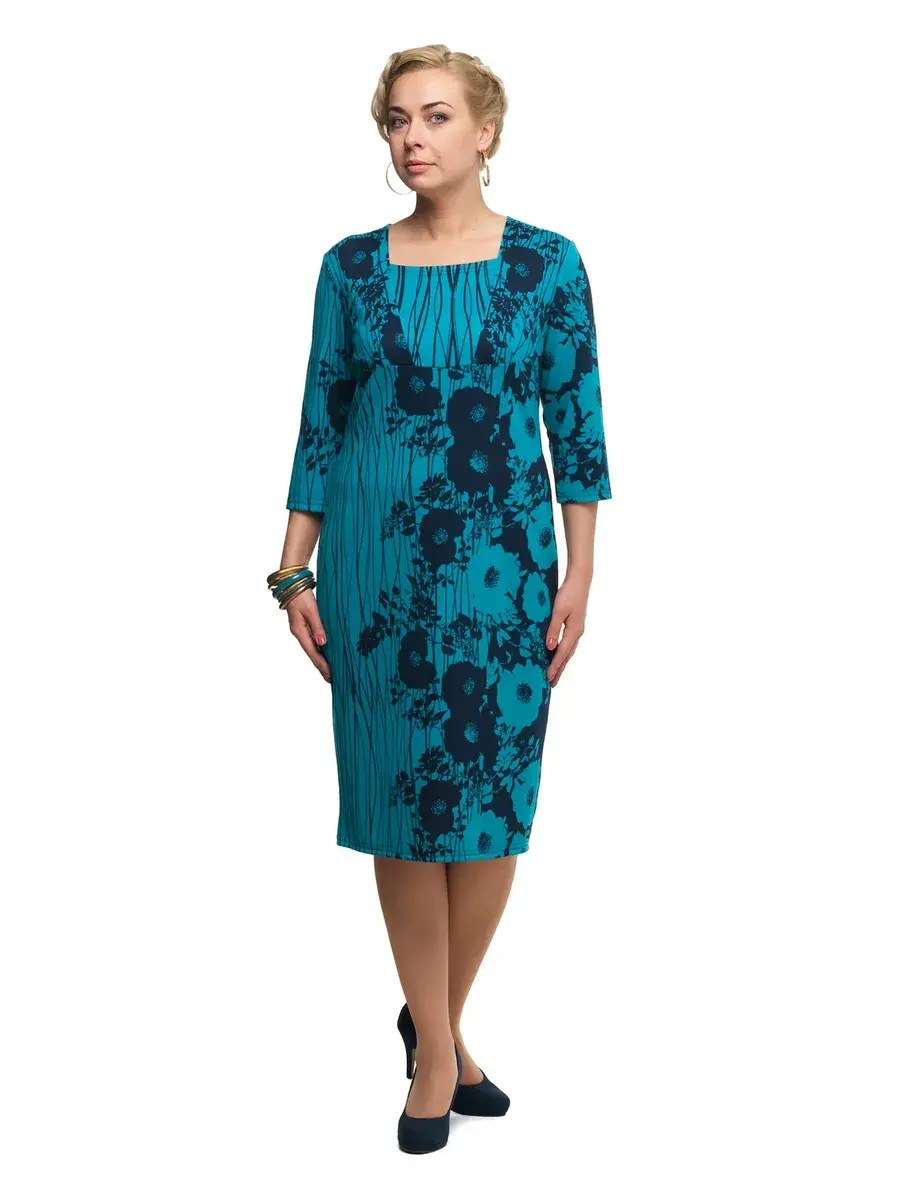 Стильное платье длиной чуть ниже колена из плотной ткани с вискозой с монохромны комбинированным принтом: цветочным и в тонкую фантазийную вертикальную полоску. Модель прямого, зауженного книзу кроя; на прямой кокетке, отрезная по линии груди; с втачными узкими рукавами 3/4; квадратным вырезом горловины каре. Изюминка модели, - ювелирная точность кроя по принту, «рисующего» силуэт, благодаря чему нивелируются особенности фигуры и корректируются пропорции.