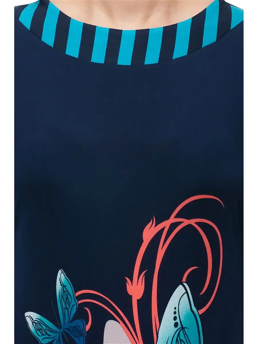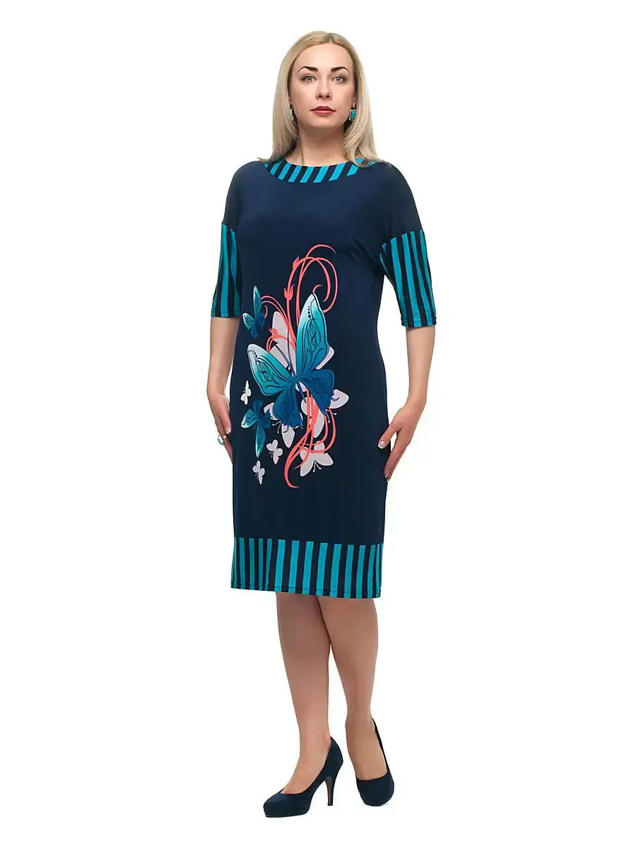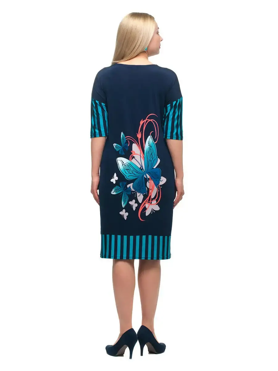 Элегантное платье длиной до колен из тонкого трикотажа, выполненное в комбинации эффектных принтов. Отрезные рукава до локтя со спущенным плечом, манжет на подоле и отделка круглого выреза горловины – из ткани в четкую вертикальную полоску. На спинке и лифе изделия располагается фантазийный рисунок с бабочками. Изделие создает оптическую иллюзию многослойности: полуприталенной туники без рукавов, надетой поверх платья футляр. Модель легко обрисовывает контуры фигуры, придает им женственность.