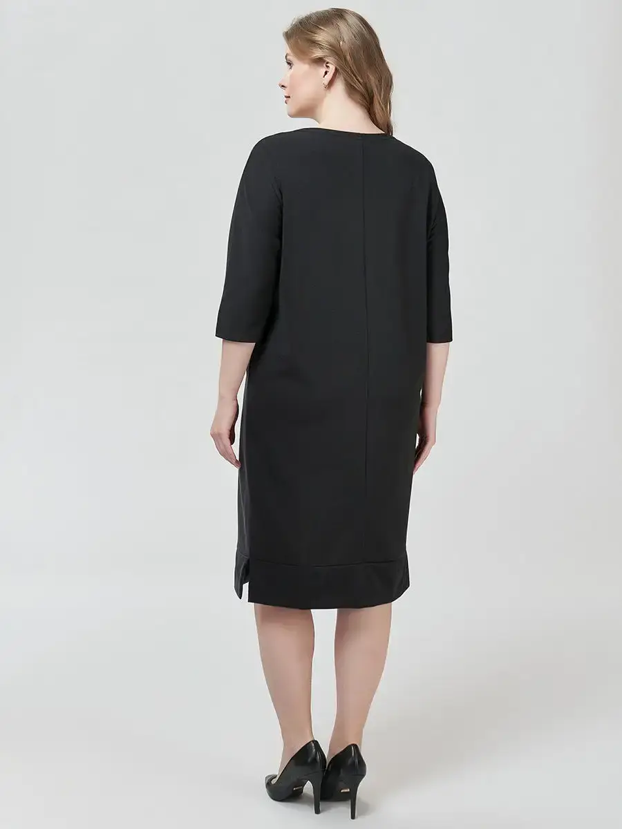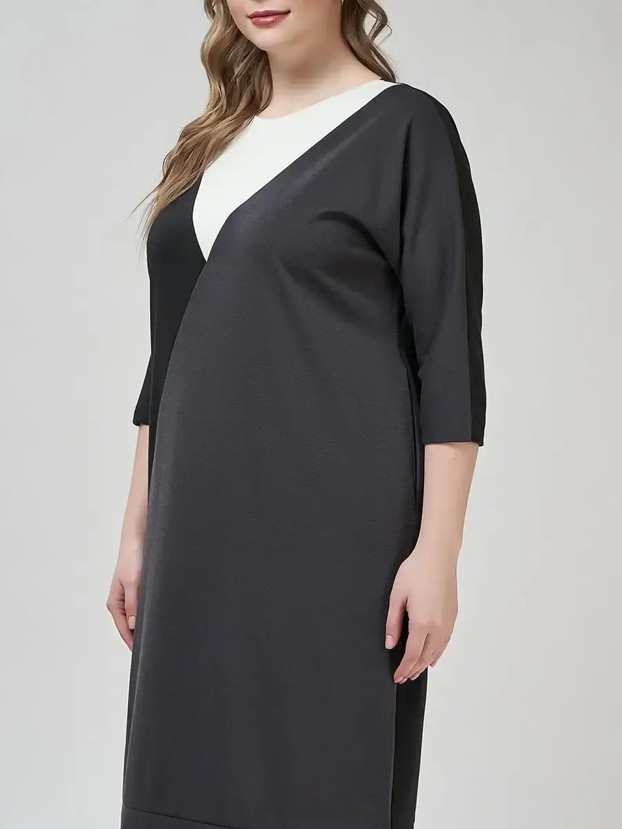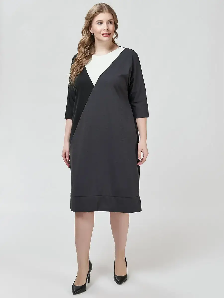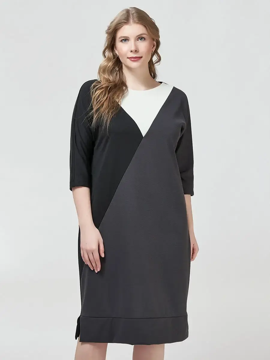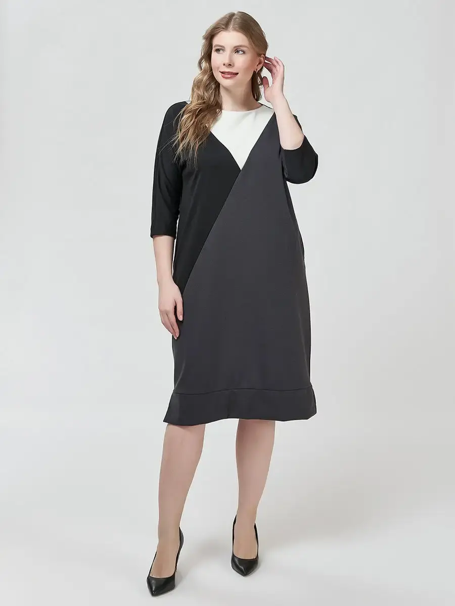 Элегантное платье, выполненное в геометрической комбинации тканей классической цветовой палитры, длиной до середины голени, с отрезным воланом по низу. Модель с округлым вырезом горловины, рукавом 3/4, со спущенной проймой.