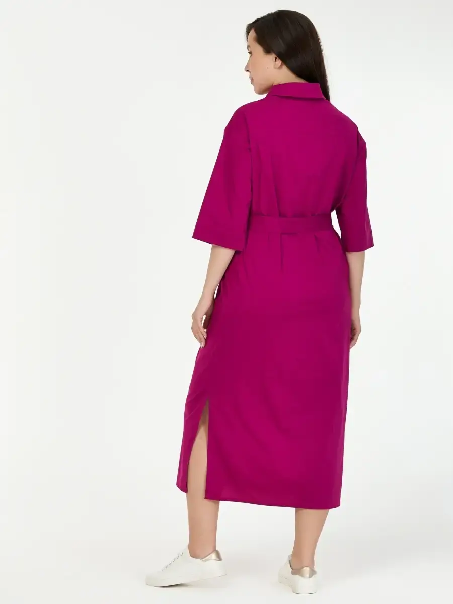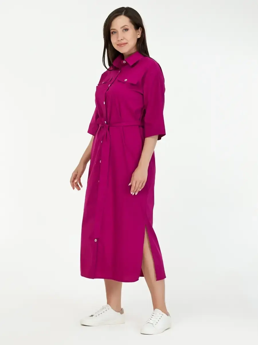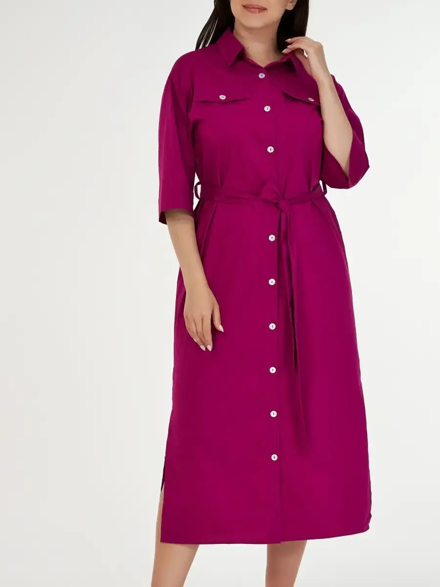 Женское повседневное платье большого размера выполнено из хлопка с эластаном, на пуговицах, с поясом, прямого кроя. Длина по спинке: