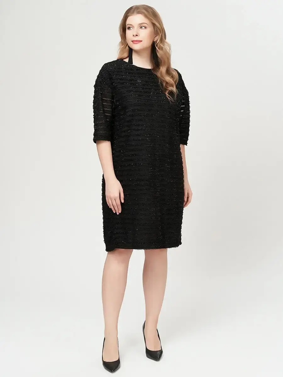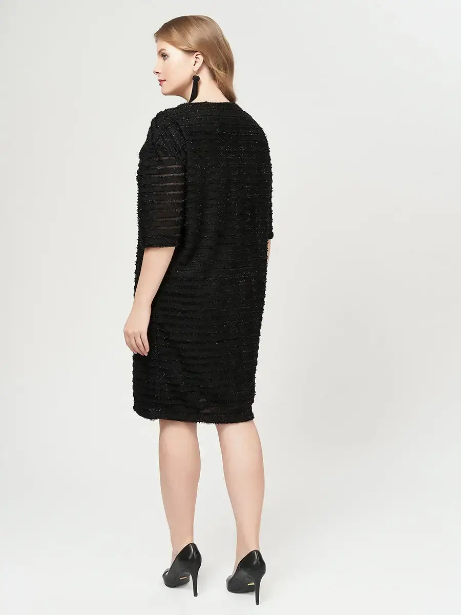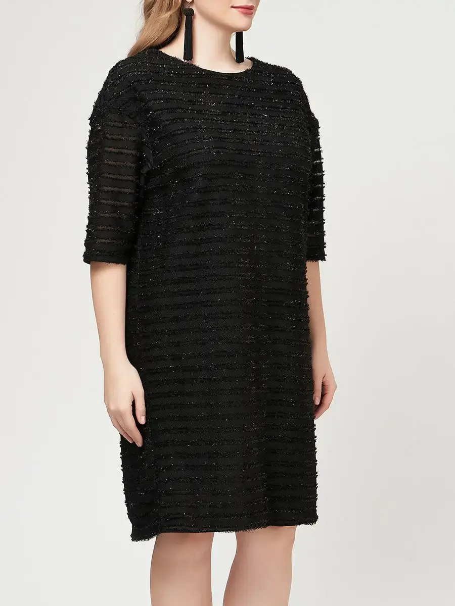 Стильное платье длиной до колен, из фактурного трикотажа с эффектом горизонтальных полосок ткани с необработанными краями, нашитых на полупрозрачную основу. Модель лаконичного кроя, с круглым вырезом горловины, рукавами 3/4 со спущенной проймой.