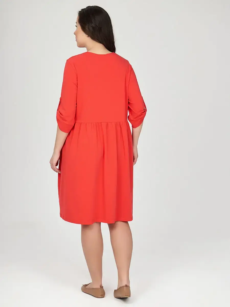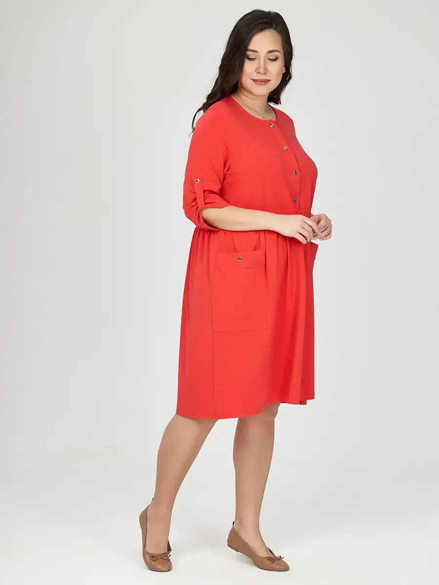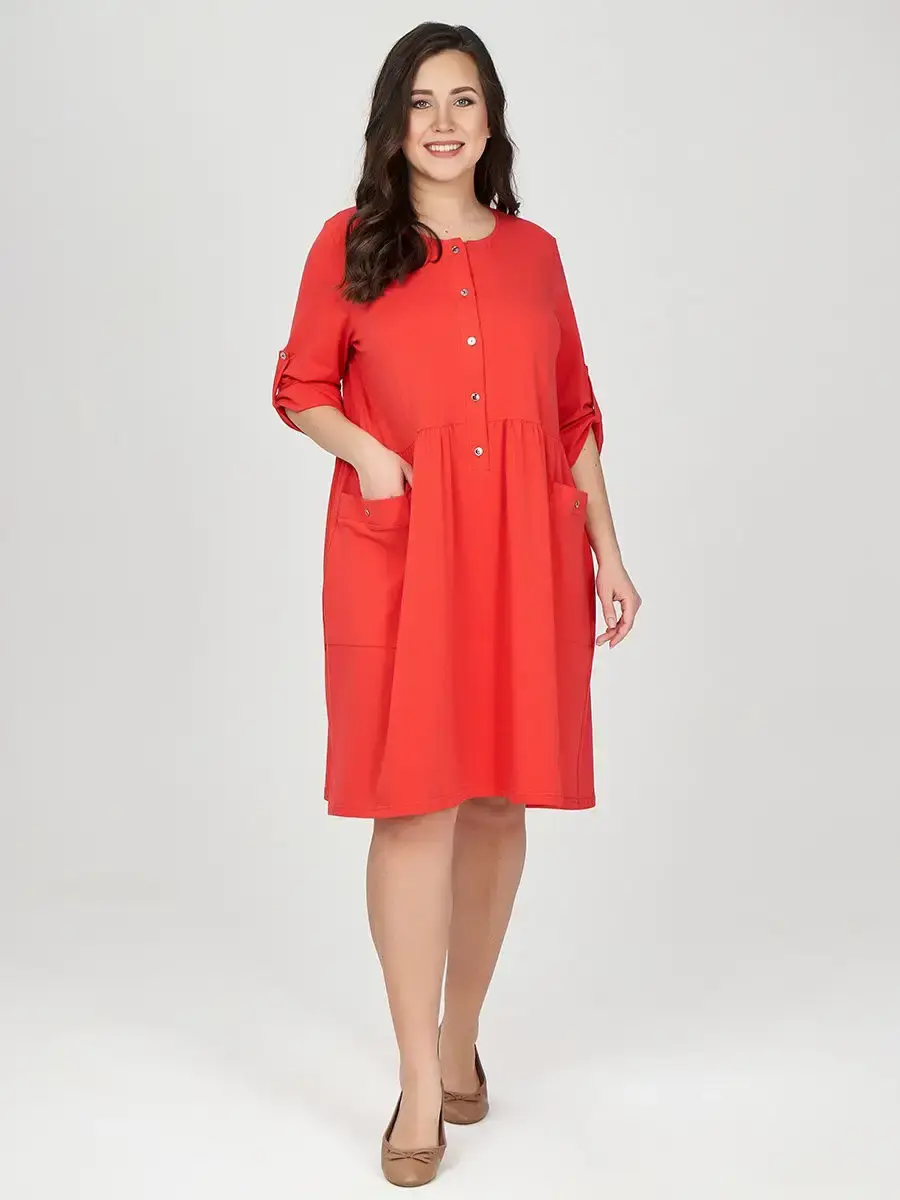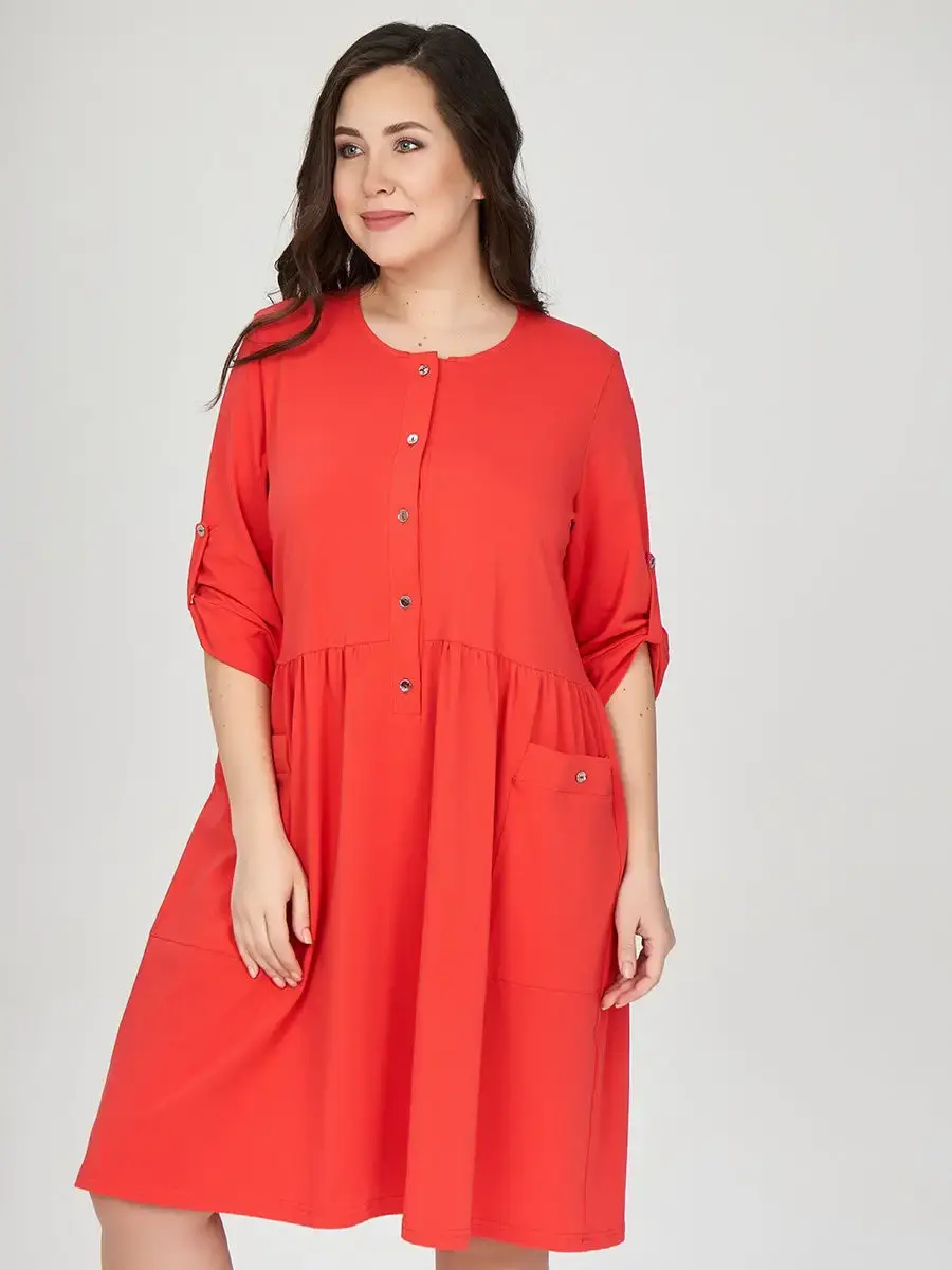 Комфортное трикотажное платье прямого свободного силуэта, с отрезной линией талии и круглым вырезом. Подходит как молодым девушкам, так и женщинам элегантного возраста. Крой придает уравновешенность и легкость фигуре. Изюминка модели это ее детали. Планка на пуговицах, врезные накладные карманы, рукава с возможностью регулировки по длине при помощи паты.
