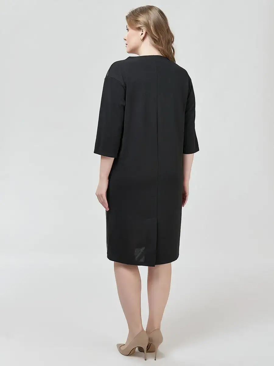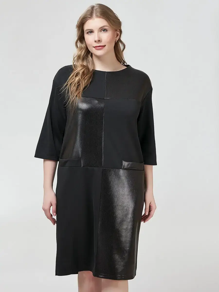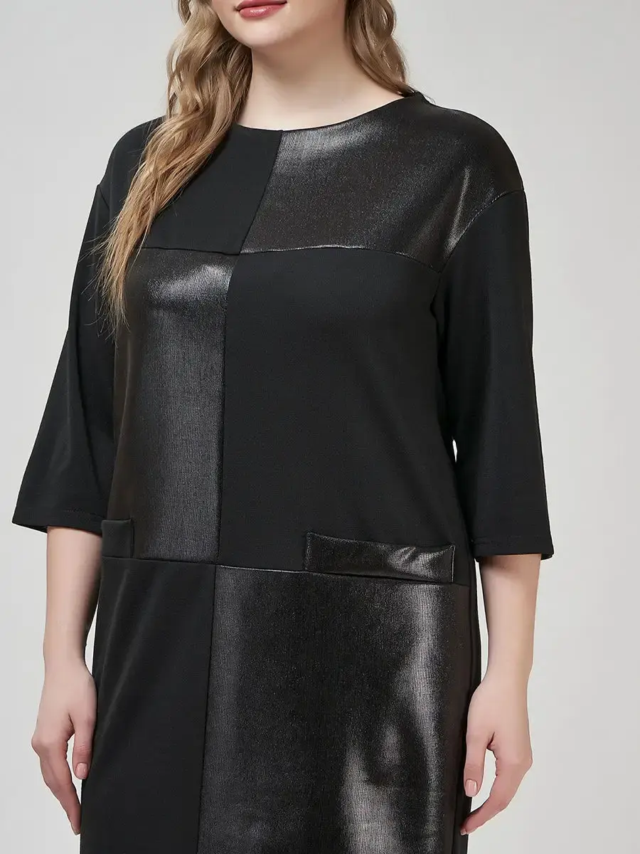 Стильное платье, выполненное в геометрической комбинации матовой и блестящей тканей. С округлым вырезом горловины, рукавами со спущенной проймой, длиной 3/4. Модель лаконичного силуэта, отрезная по кокетке на груди и чуть ниже талии, длиной по колени.