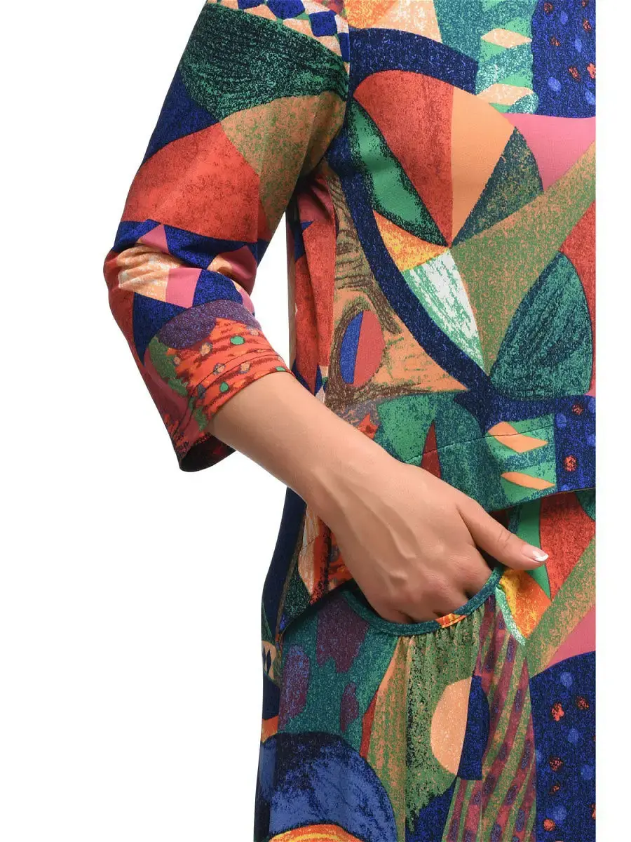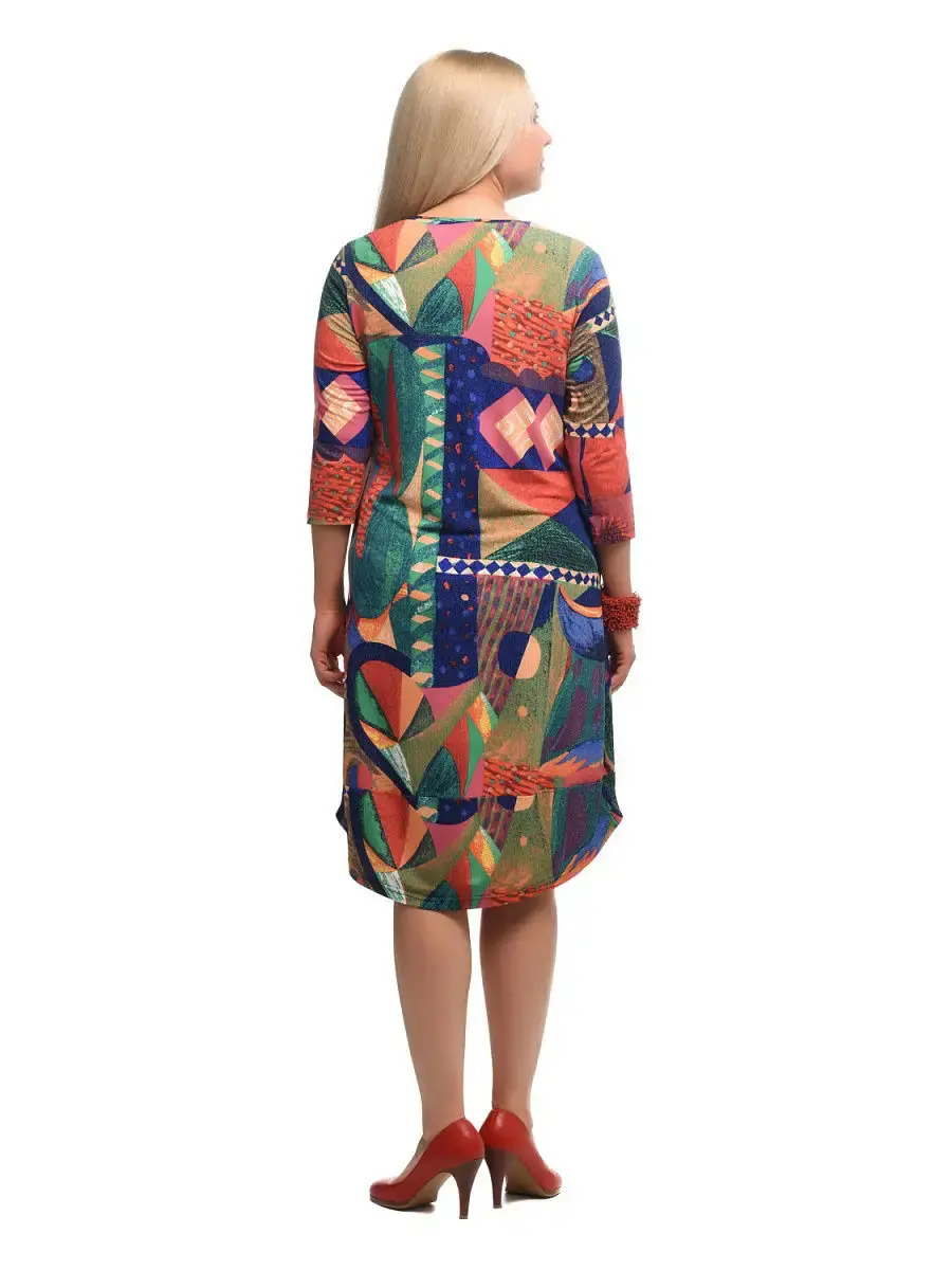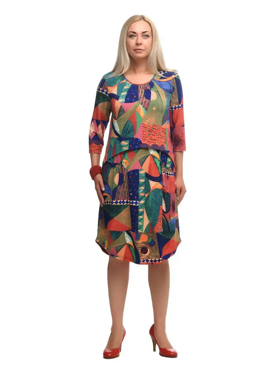 Стильное платье длиной чуть ниже колен, из тонкой ткани с геометрическим принтом, в стилистике авангарда начала прошлого века. Модель с глубоким круглым вырезом горловины, с защипами по окантовке, рифмующимися с формой и отделкой боковых карманов; с втачными рукавами длиной 3/4. Лиф изделия отрезной по талии, в форме арки, юбка с овальным подолом. Эффект костюма спереди и цельнокроеная спинка сзади, позволяют выровнять осанку, нивелировать недочеты фигуры, придают образу кокетливые нотки.