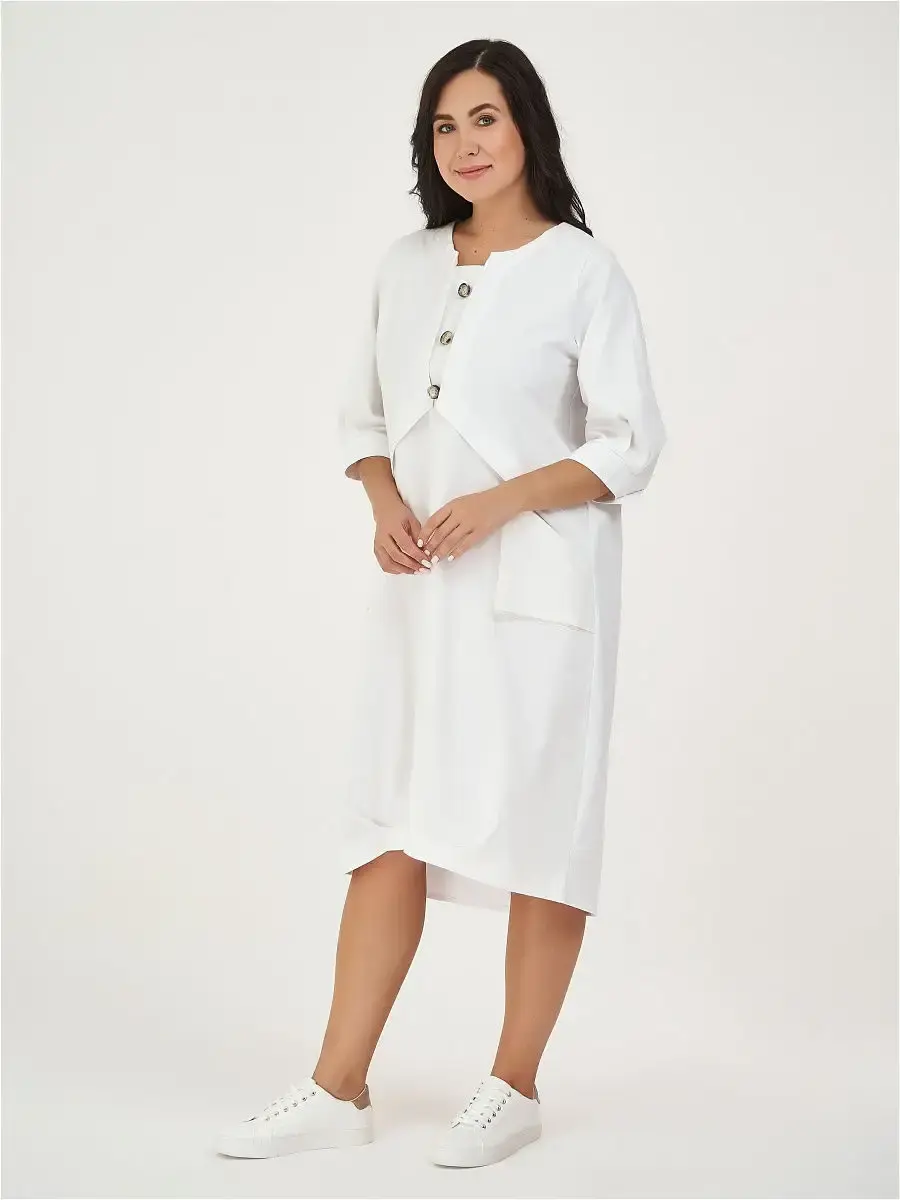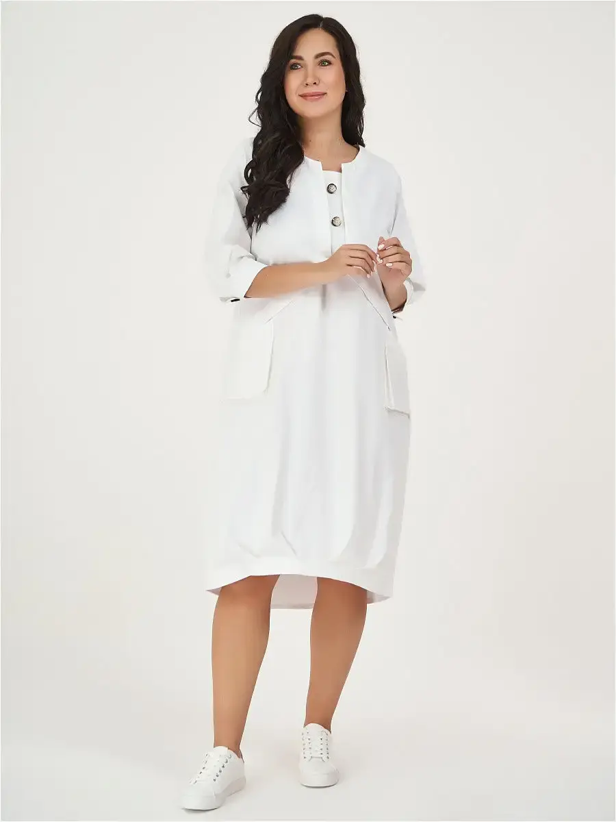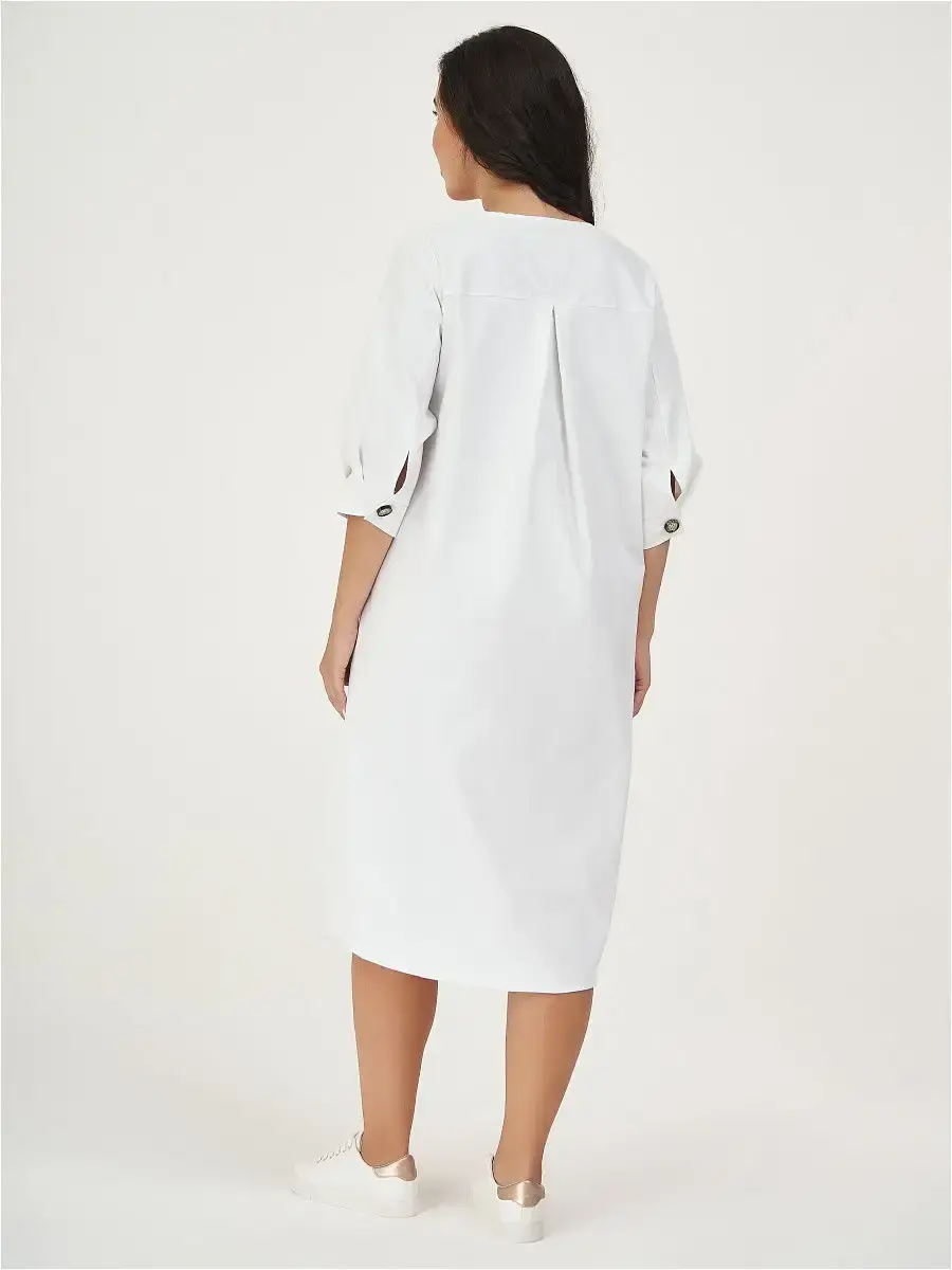 Летнее платье больших размеров из очень плотного хлопка с эластаном, прямого силуэта, объёмной формы, с накладными карманами. Фигурная горловина, рукав 3/4 с манжетой. Низ платья немного удлиненный сзади.