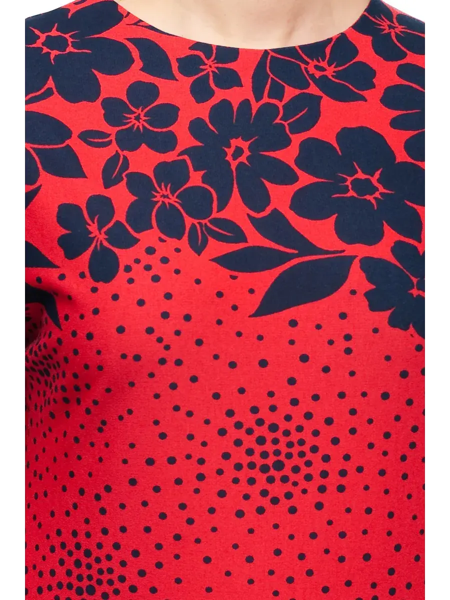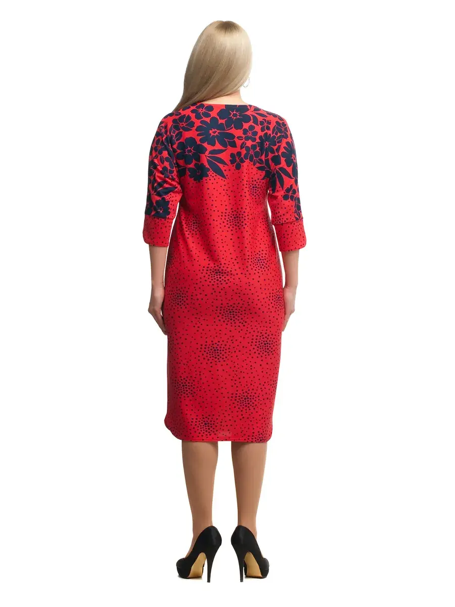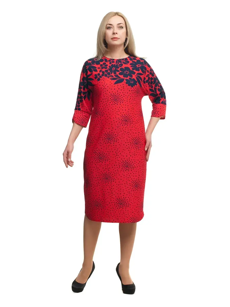 Стильное платье – футляр чуть ниже колен, из теплого тонкого трикотажа с комбинированным цветочным и фантазийным гороховым принтом. Изделие полуприлегающего кроя, с круглым вырезом горловины; рукавами длиной 3/4, на манжетах с закругленными уголками разрезов, со спущенной проймой. Особенность модели, - акцентный, плотный только по груди и рукавам рисунок, уравновешивающий силуэт, делающий фигуру более грациозной.